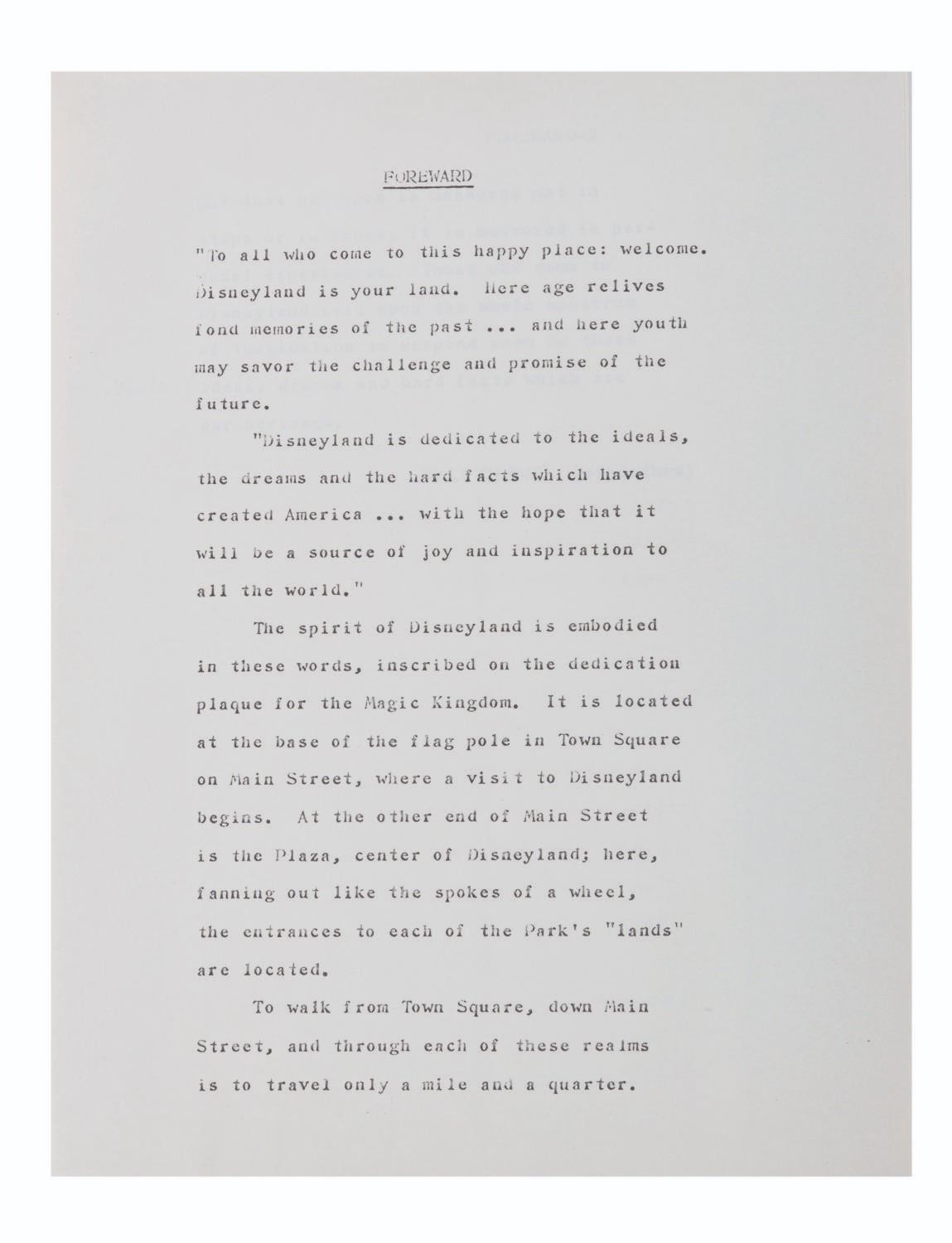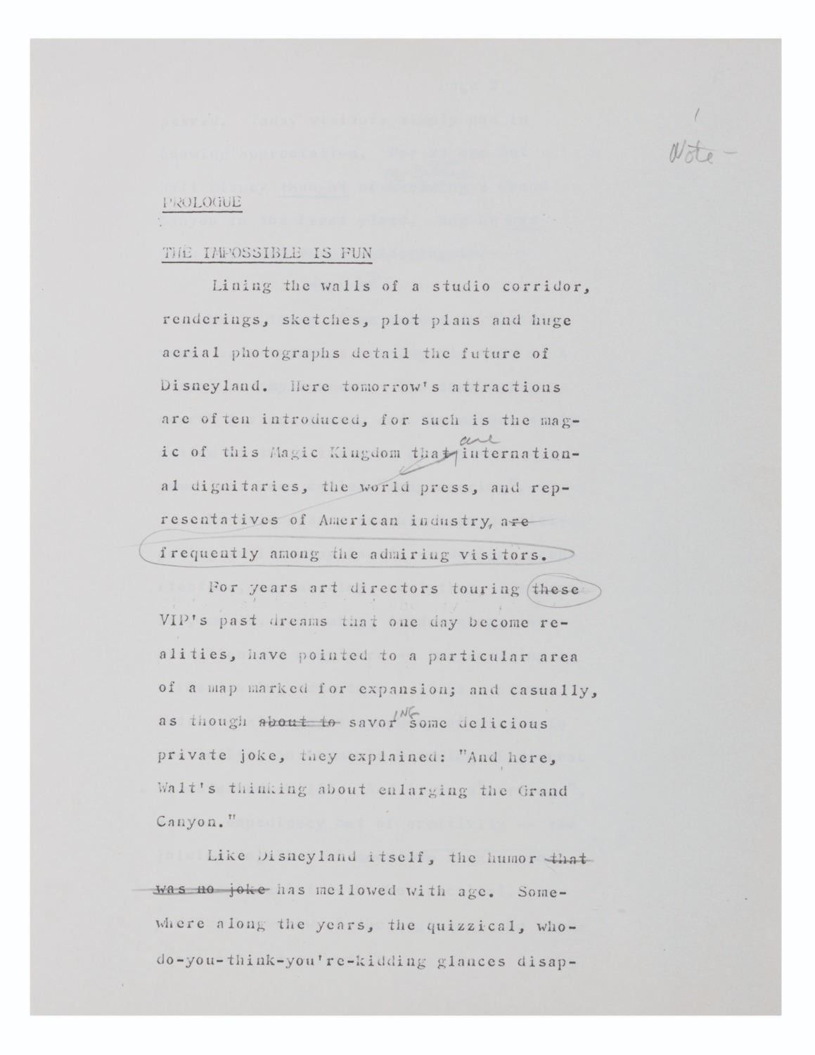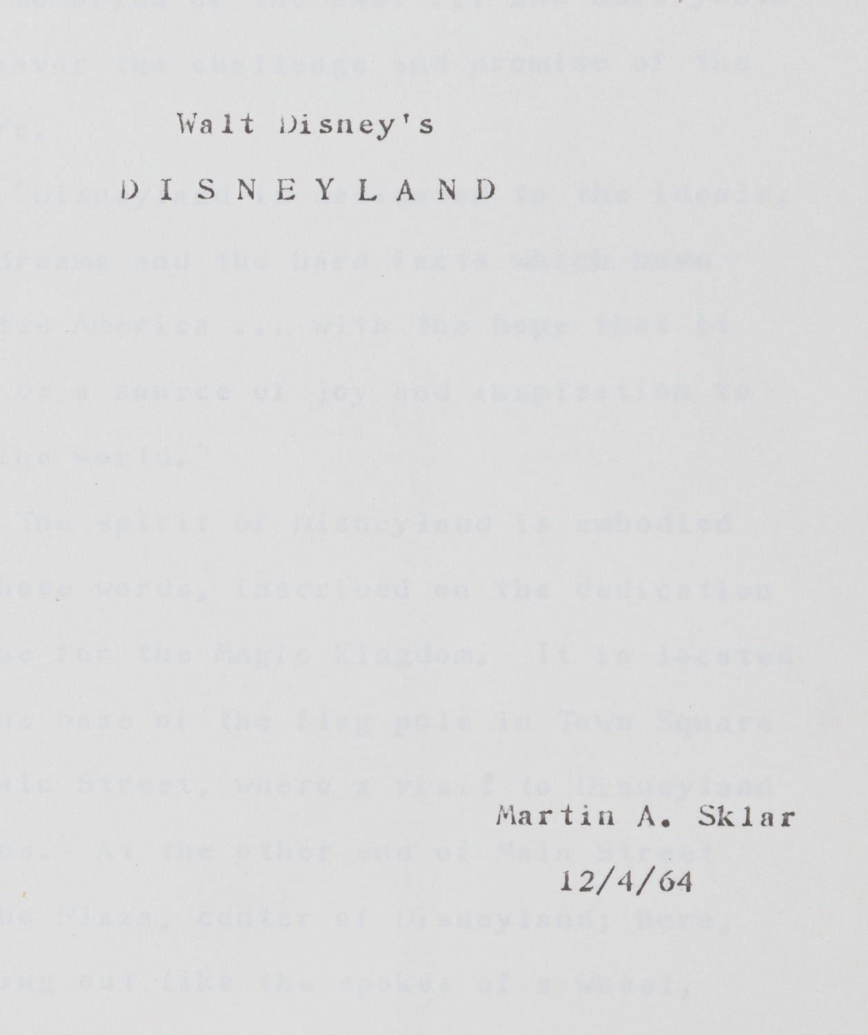 (Disneyland, 1964) An early 17-page draft of Walt Disney's Disneyland book by Disney Legend Marty Sklar. Marty joined Disneyland a month before the Park opened, working for publicity and marketing, eventually becoming head of Walt Disney Imagineering. During his tenure, Marty oversaw numerous publications, press releases, and speeches, including "Walt Disney's Disneyland," which narrated the story of the Park's first ten years. The draft of this publication includes two pages of notes and correction marks from the editing process. Measuring 8.5" x 11" in a 9.5" x 14.75" manila folder, the draft is in good, production-used condition with creases, discoloration, and stains to the outer folder.