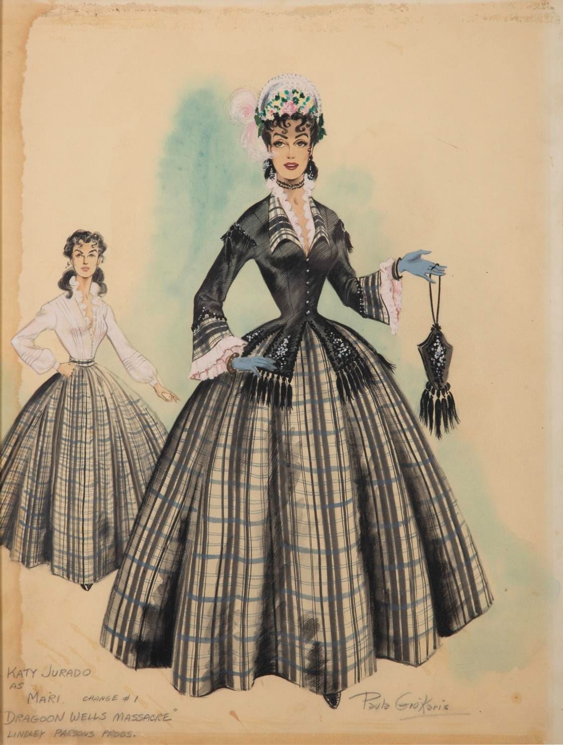 (Allied Artists Pictures, 1957) A costume concept for Katy Jurado as Mari in the western film"Dragoon Wells Massacre." The design was executed in gouache and pencil by Costume Designer Paula Giokaris, who is not credited with working on this film. Giokaris signed the concept art in the lower right corner. Measuring 15"x20", the concept art is in good production-used condition, with staining to the left edge from water exposure.