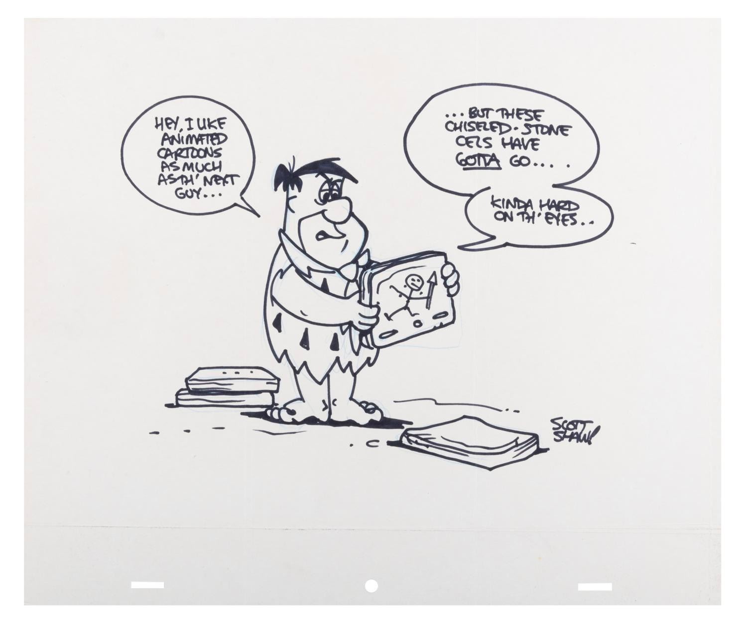 (Shaw, 1980s-90s) A drawing of Fred Flinstone by comic book artist and animator Scott Shaw, signed and illustrated in black ink. Shaw is known for his work at Hanna-Barbera and on Sonic the Hedgehog comic books. Here Shaw gives a humorous take on animation in the “modern Stone Age” world of the Flintstones. With a character size of 5” x 6.75” on 10.5” x 12.5” animation paper, the drawing is in very good condition with a crease from folding 1.5” above the bottom edge that does not affect the image.