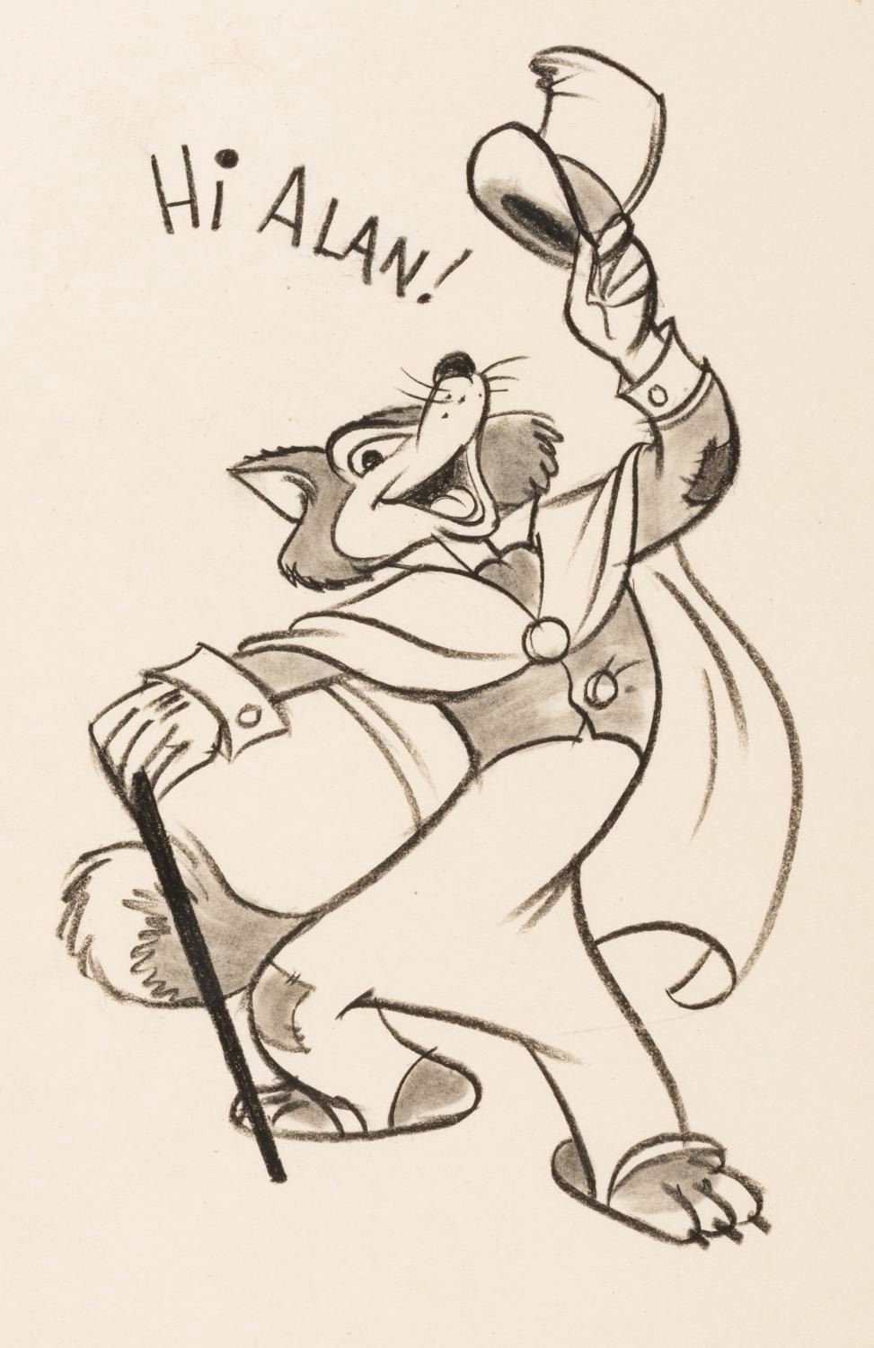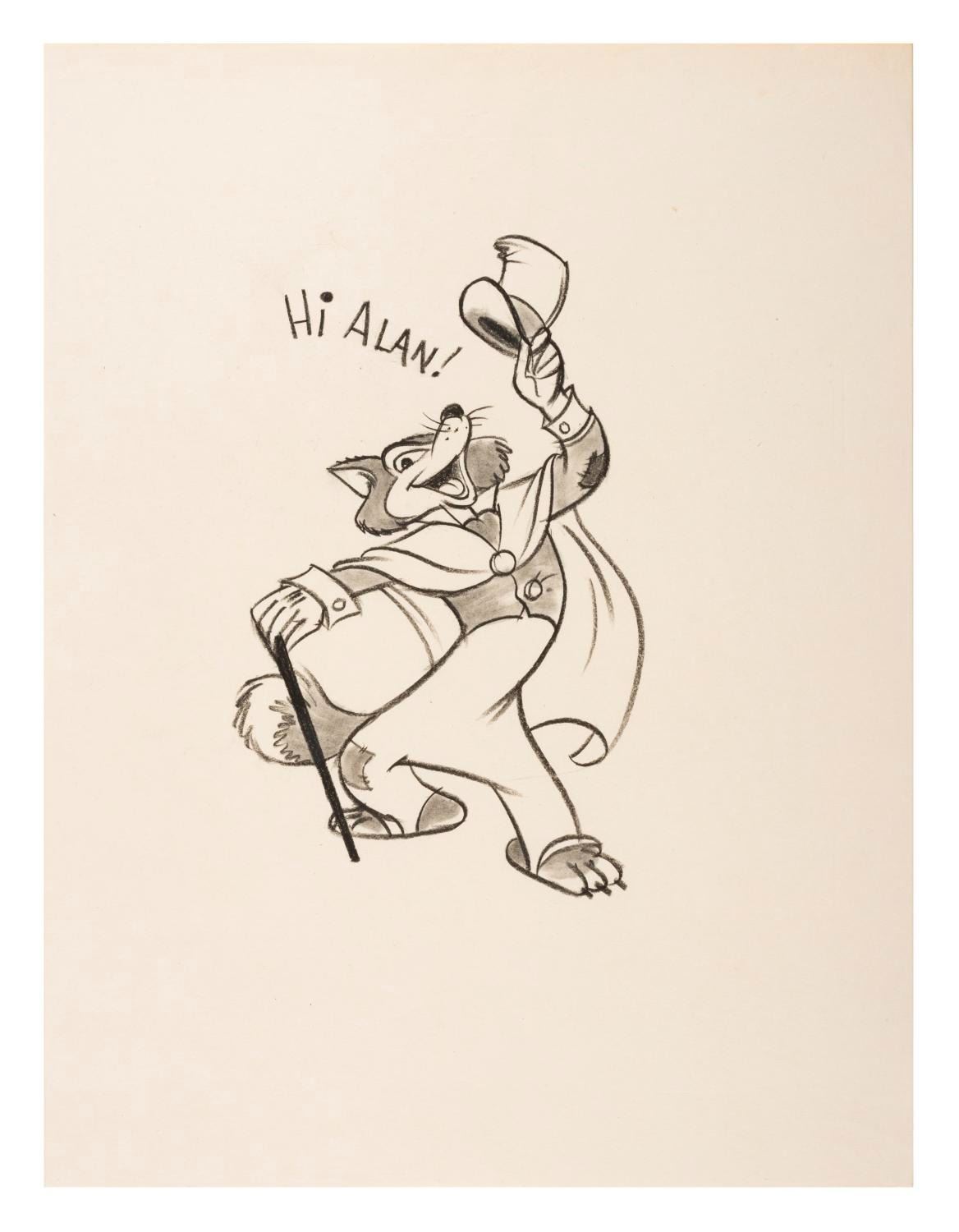 (1970s-1990s) A graphite drawing of Honest John from "Pinocchio" by an unknown artist for super-collector Alan Hylton. With an image size of 4.25" x 6.5" on an 8.5" x 11.25" piece of paper, the drawing is in very good condition with light discoloration from age.
