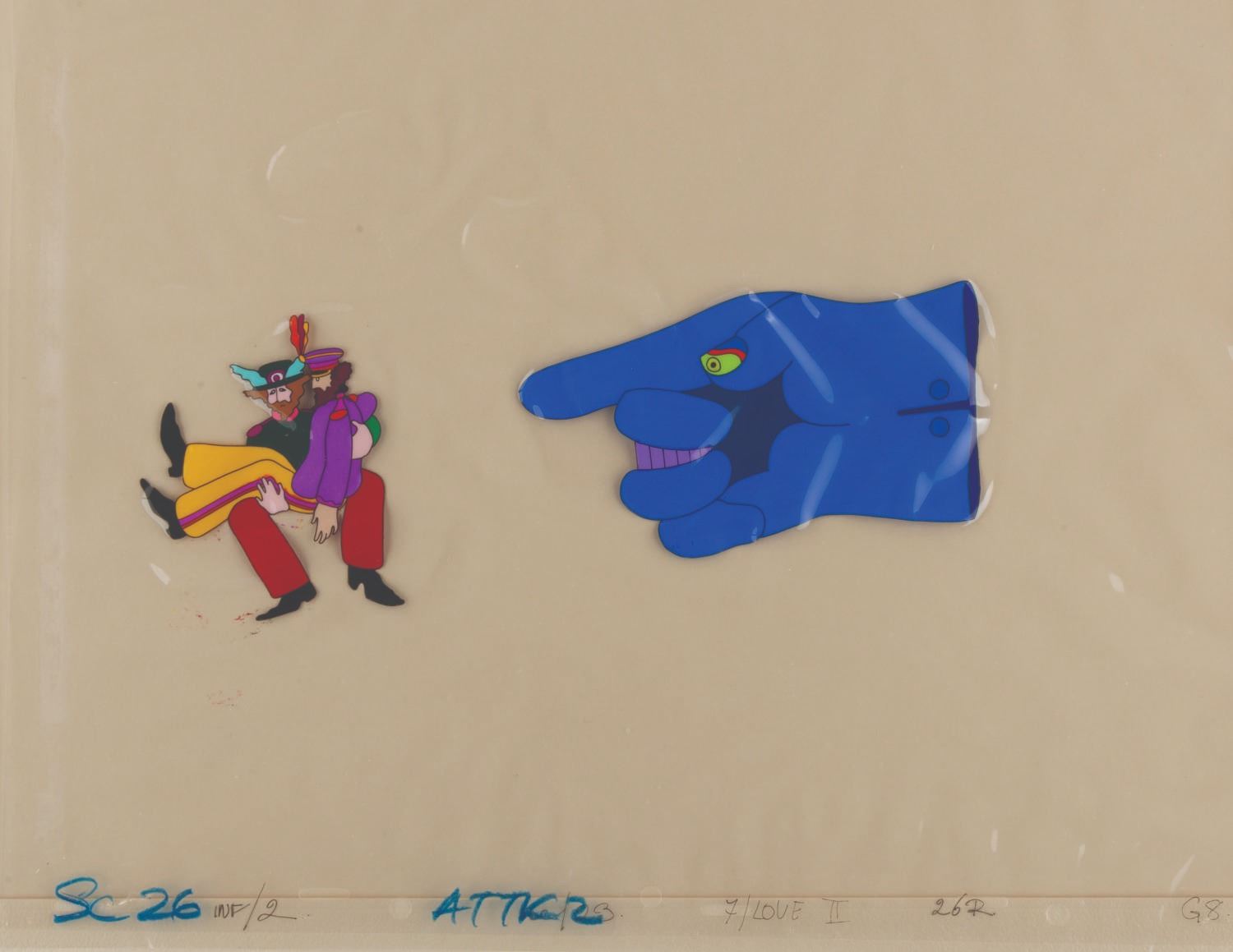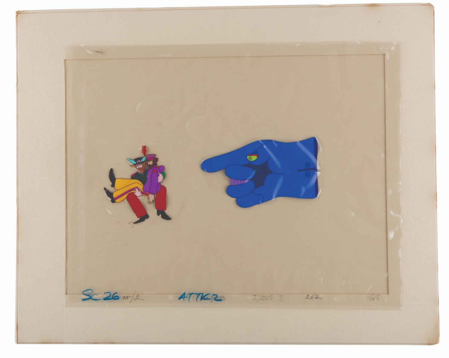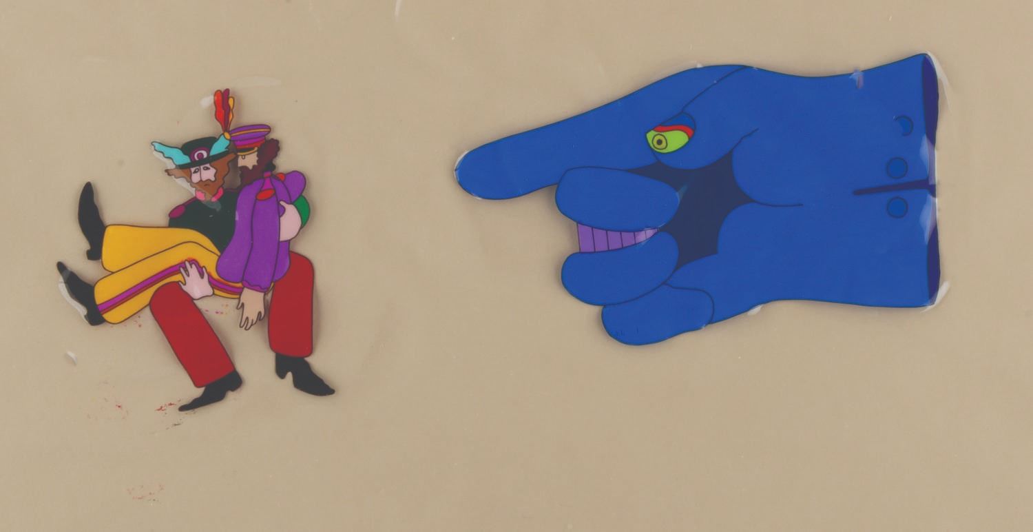 (United Artists, 1968) An original hand-painted production cel of John Lennon, Ringo, and a Dreadful Flying Glove from "Yellow Submarine.” The cel was sold in Hallmark stores between 1969 and 1970 and comes with its original 16” x 20” matte and wrapping with a logo sticker. Measuring 12.5” x 16” with character image sizes of 3.5” x 3.25” and 5.5” x 3.5”, the multi-layer cel displays in good condition with heavy warping and staple holes in all four corners which do not affect the image.