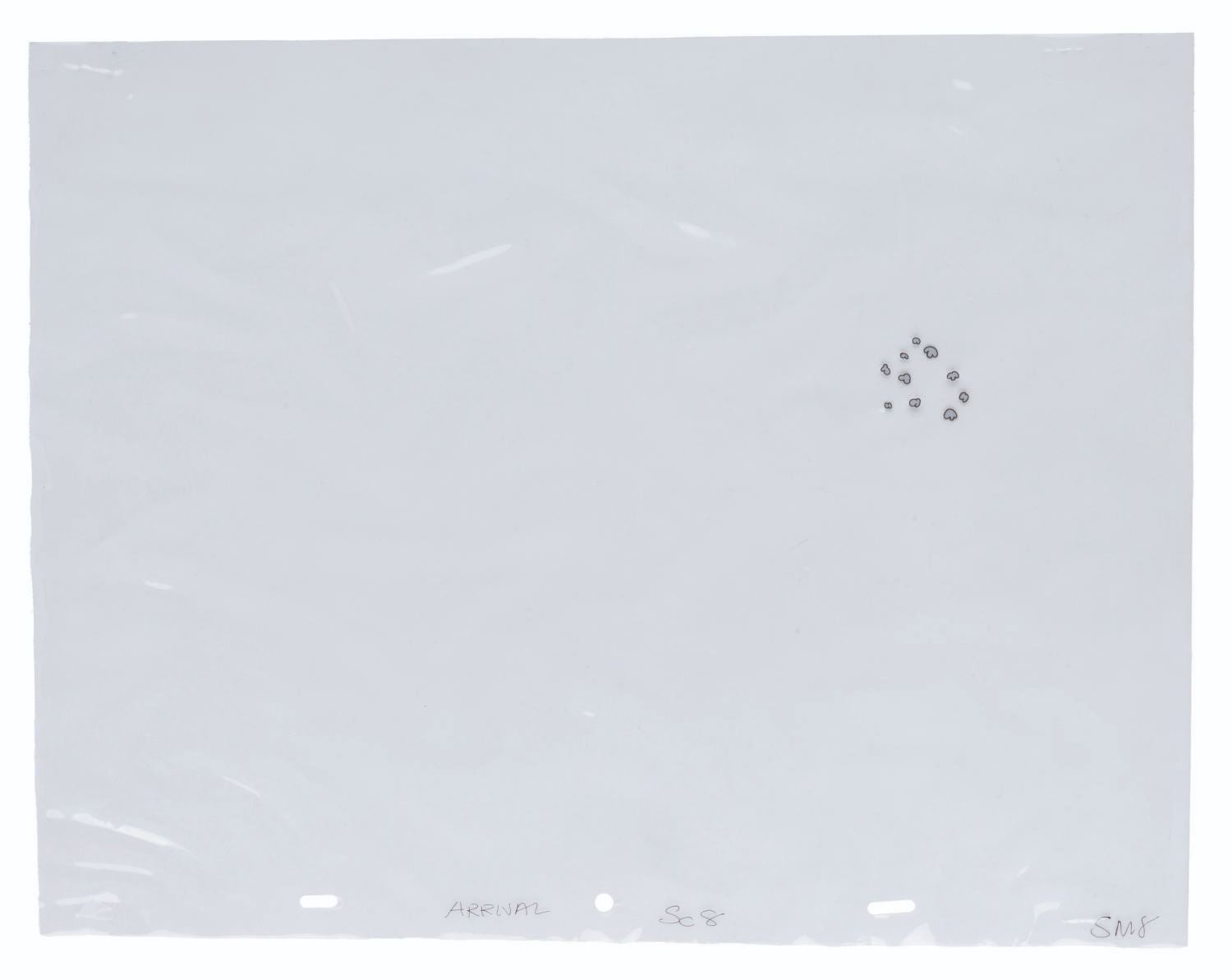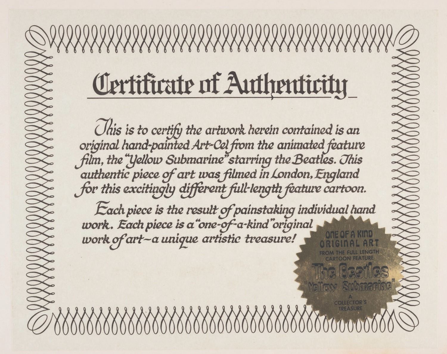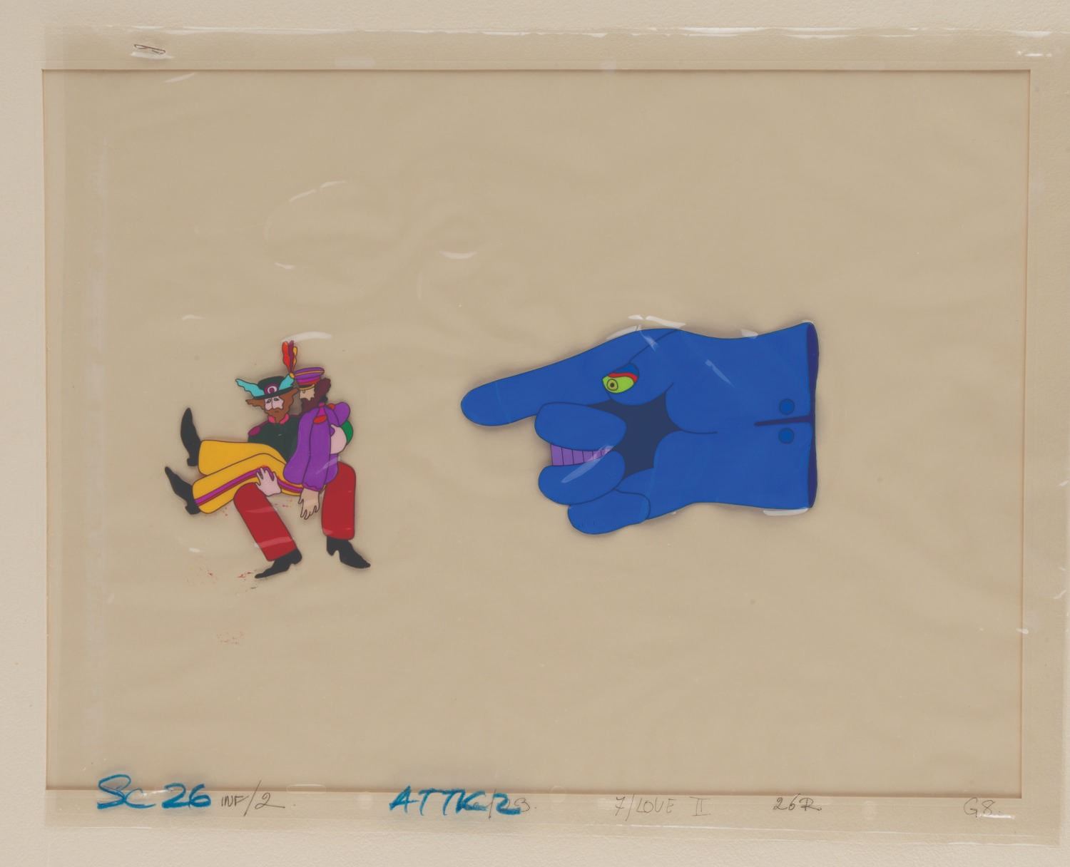 (United Artists, 1968) An original hand-painted production cel of John Lennon, Ringo, and a Dreadful Flying Glove from "Yellow Submarine.” The cel was sold in Hallmark stores between 1969 and 1970 and comes with its original 16” x 20” matte and wrapping with a logo sticker. Measuring 12.5” x 16” with character image sizes of 3.5” x 3.25” and 5.5” x 3.5”, the multi-layer cel displays in good condition with heavy warping and staple holes in all four corners which do not affect the image.