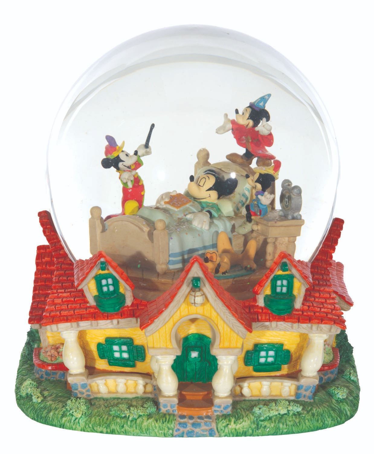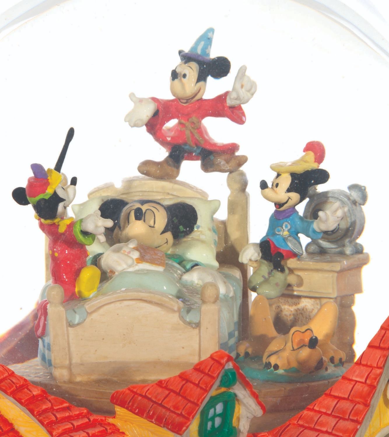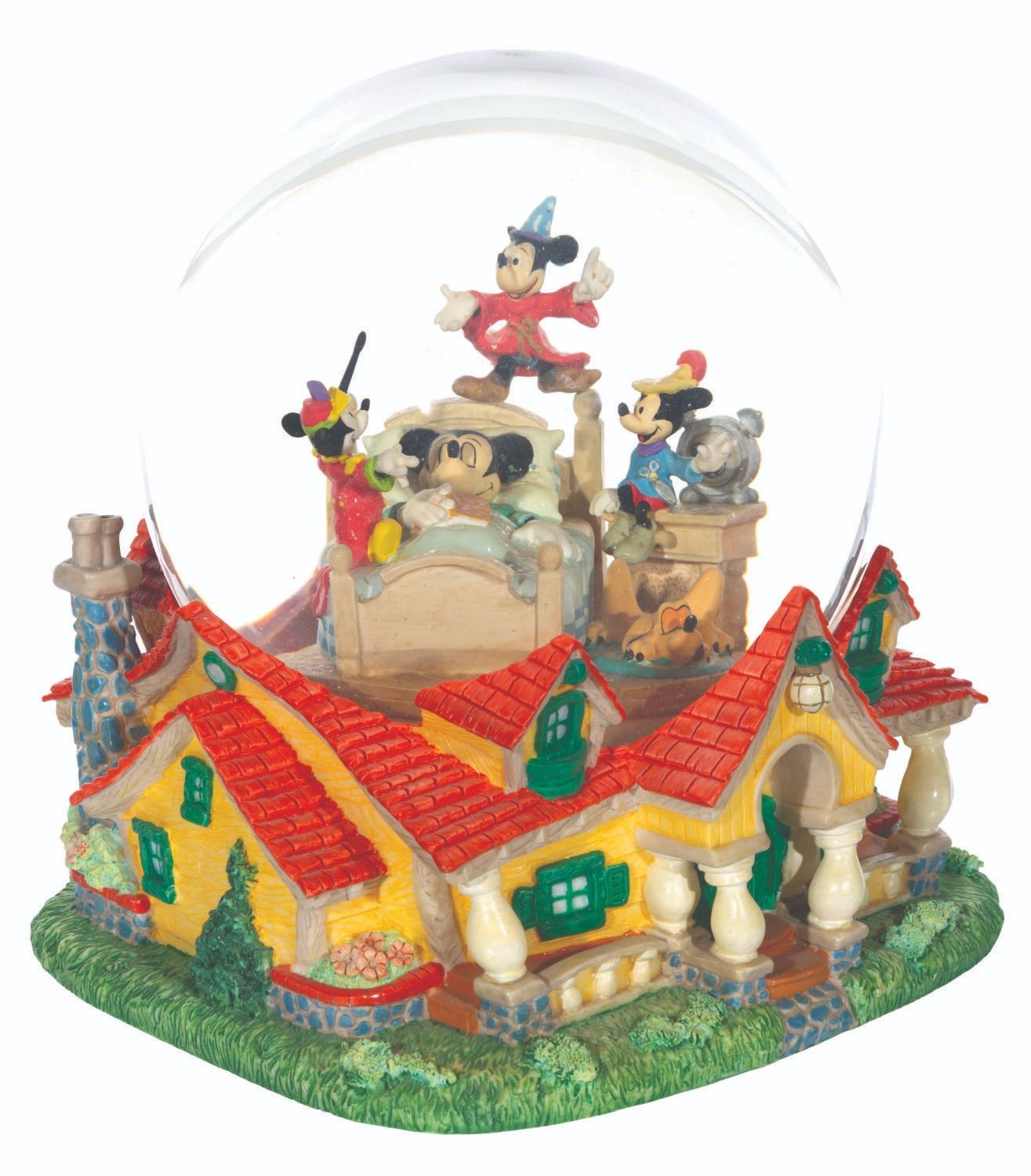 (Disney, 1990s) A musical snow globe featuring Mickey sleeping in his house, surrounded by Mickey's of the past and a tranquil Pluto. When the crank is turned, the globe plays an instrumental of "When You Wish Upon a Star" from "Pinocchio." Measuring 7" x 6.75" x 7.5", the snow globe is in very good condition with light wear.