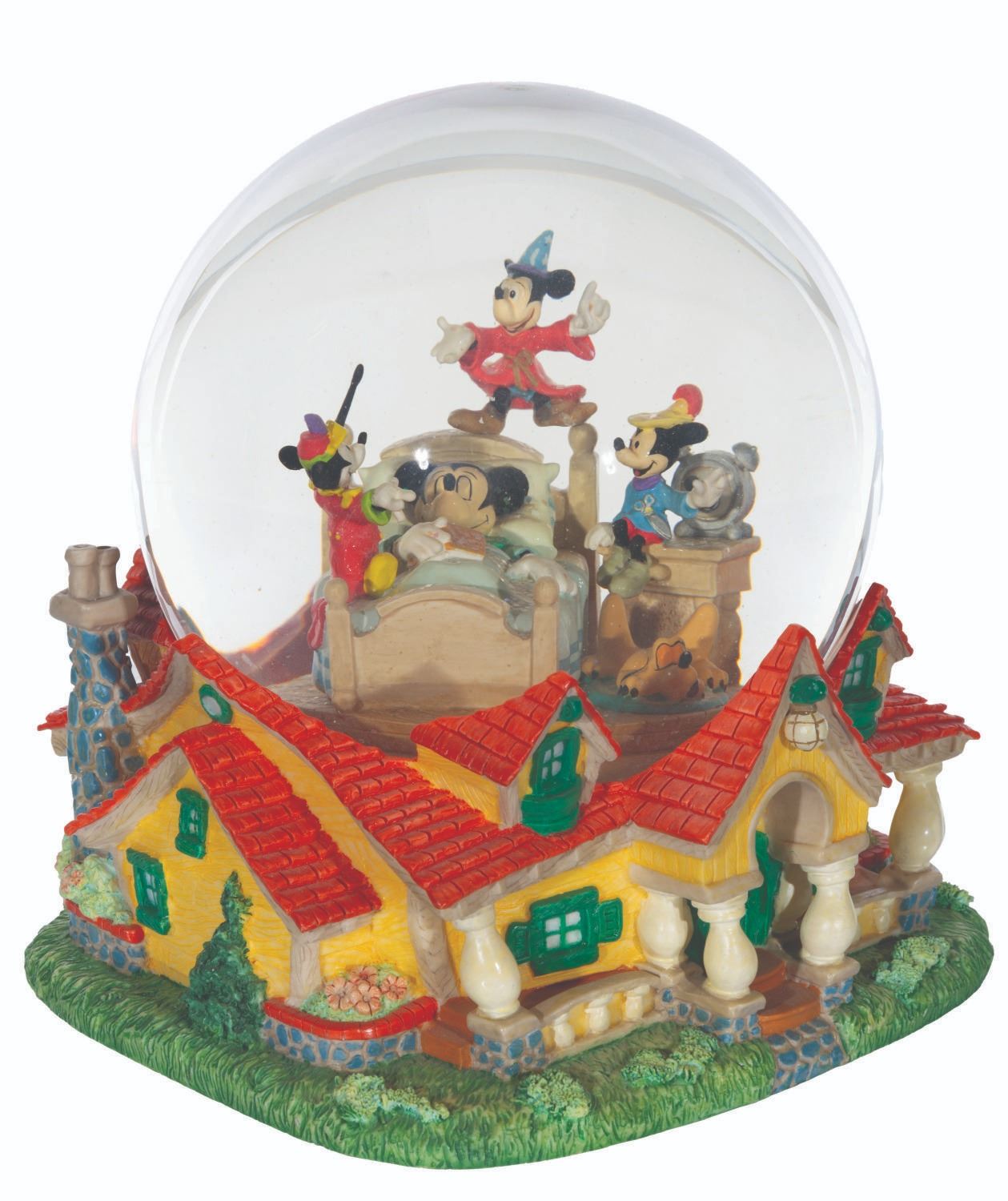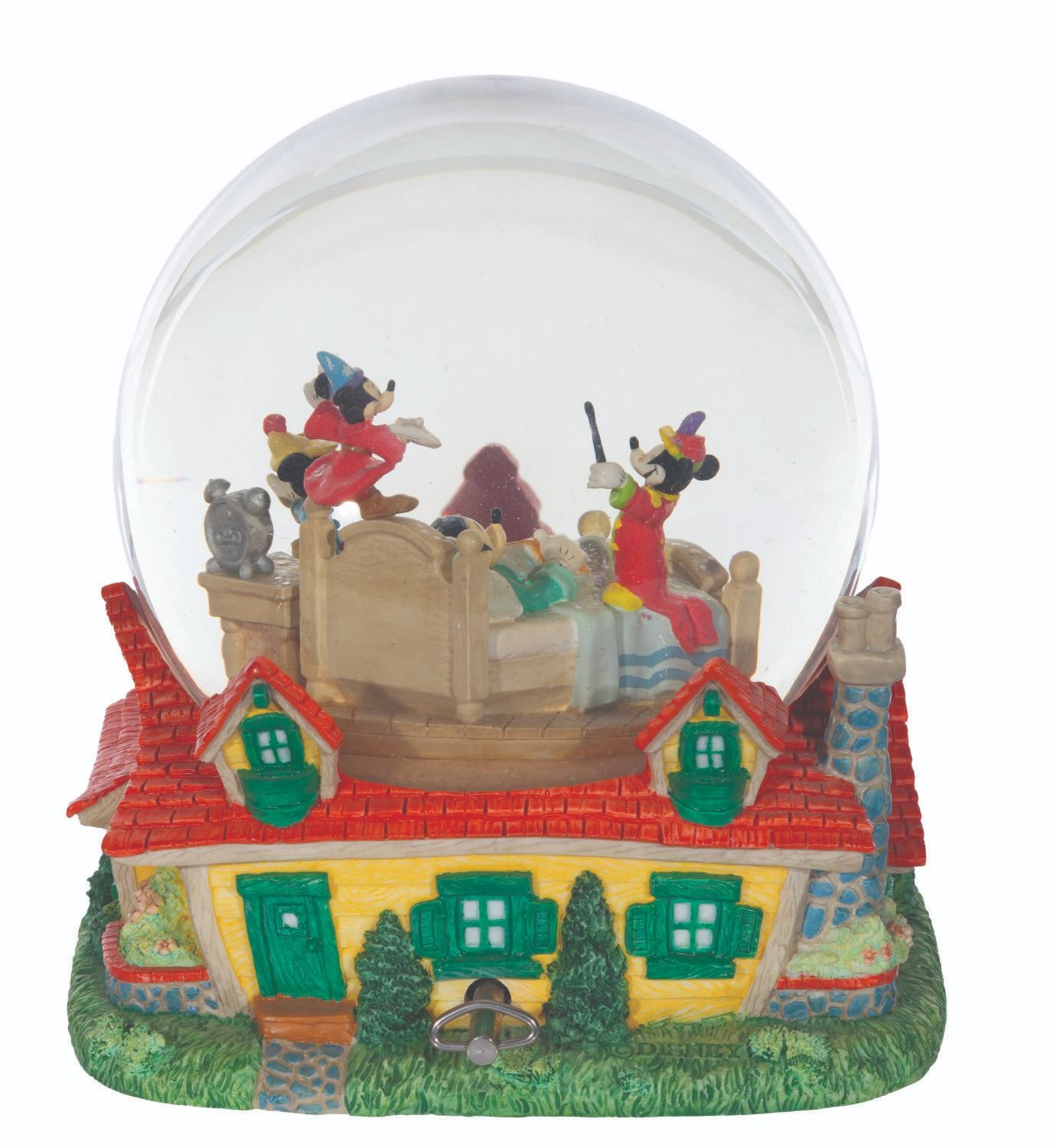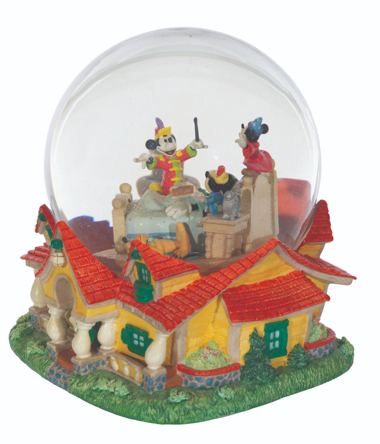 (Disney, 1990s) A musical snow globe featuring Mickey sleeping in his house, surrounded by Mickey's of the past and a tranquil Pluto. When the crank is turned, the globe plays an instrumental of "When You Wish Upon a Star" from "Pinocchio." Measuring 7" x 6.75" x 7.5", the snow globe is in very good condition with light wear.