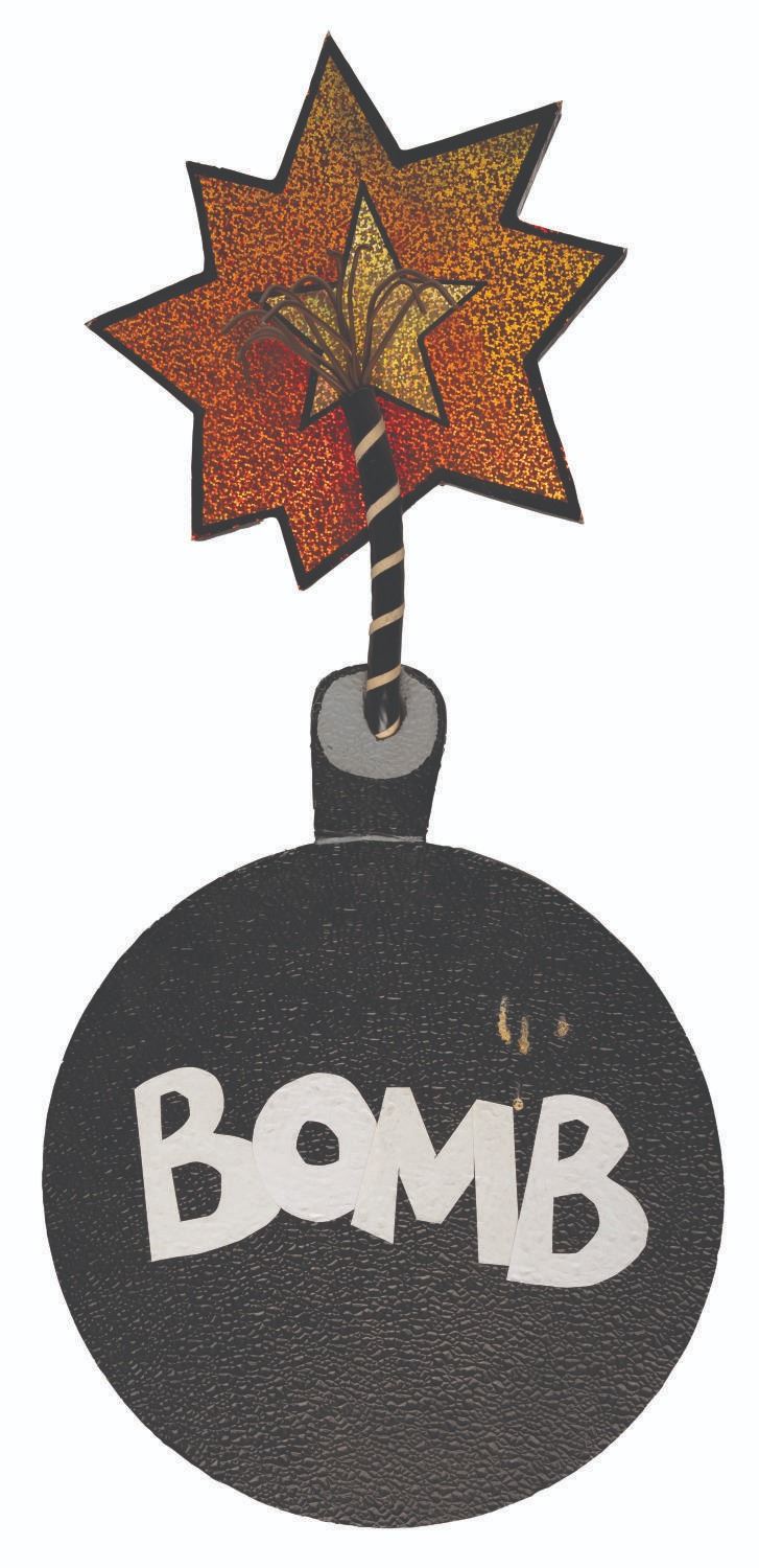 (Scozzari, 1999) A hand-crafted wall decoration of a cartoon bomb created for the Dudley Do-Right Emporium by artist Ricardo Scozzari, who also restored the historic Rocky and Bullwinkle statue. The mixed media piece is signed by Scozzari on the reverse. Measuring 25” x 11.75”, the decoration displays in very good condition with light wear and paint loss to the edges.