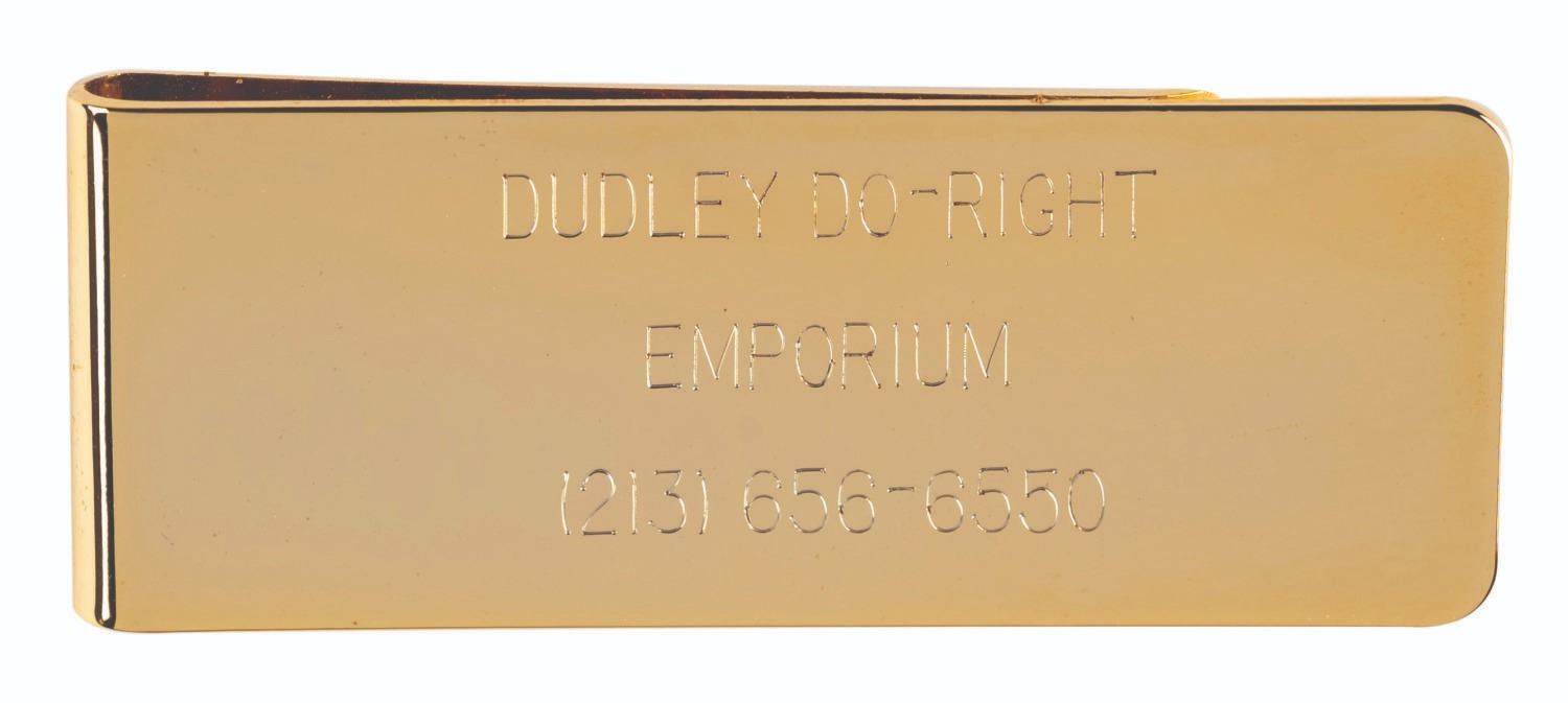 (Ward, 1970s-90s) A gold colored money clip engraved “Dudley Do-Right Emporium” with the store’s early 213 area code phone number. Measuring 2” x 0.75”, the clip is in fine condition.