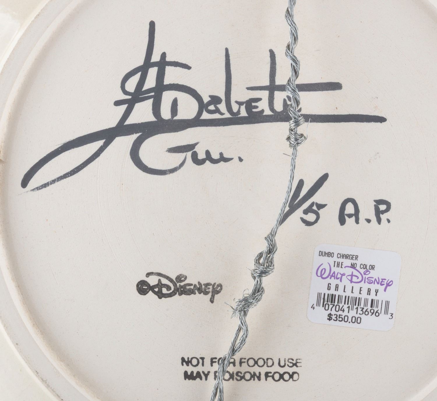 (Disney, 2006) A rare artist's proof charger plate of Dumbo and Timothy Q. Mouse by artist Elisabete Gomes. The plate is signed by Gomes on the reverse and hand-numbered 1 of 5 artist's proofs. Measuring 17.5" in diameter, the charger plate is in very good condition with spots of imperfections from the glazing process.