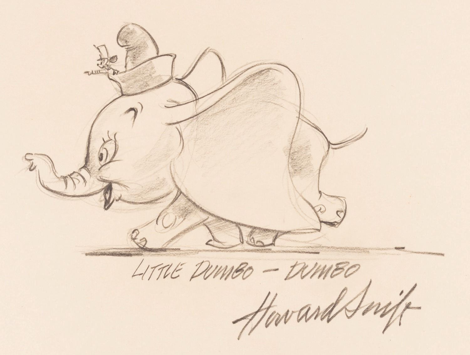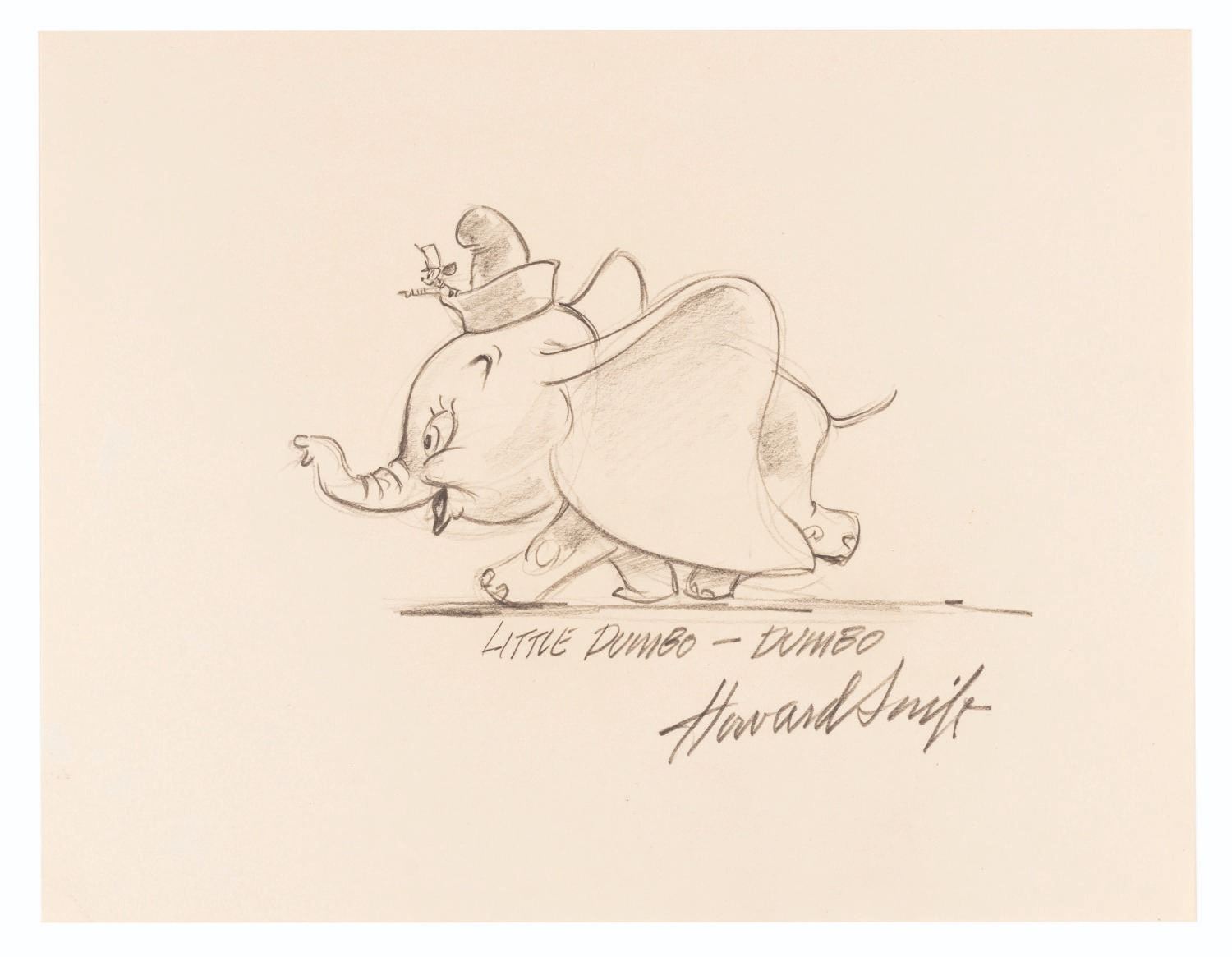 (Disney, 1970s-80s) A drawing of Dumbo and Timothy Mouse signed by character animator and writer Howard Swift. Accomplished in graphite, with an image size of 5.25" x 5.75" on an 8.5" x 11" sheet of paper, the drawing displays in fine condition.