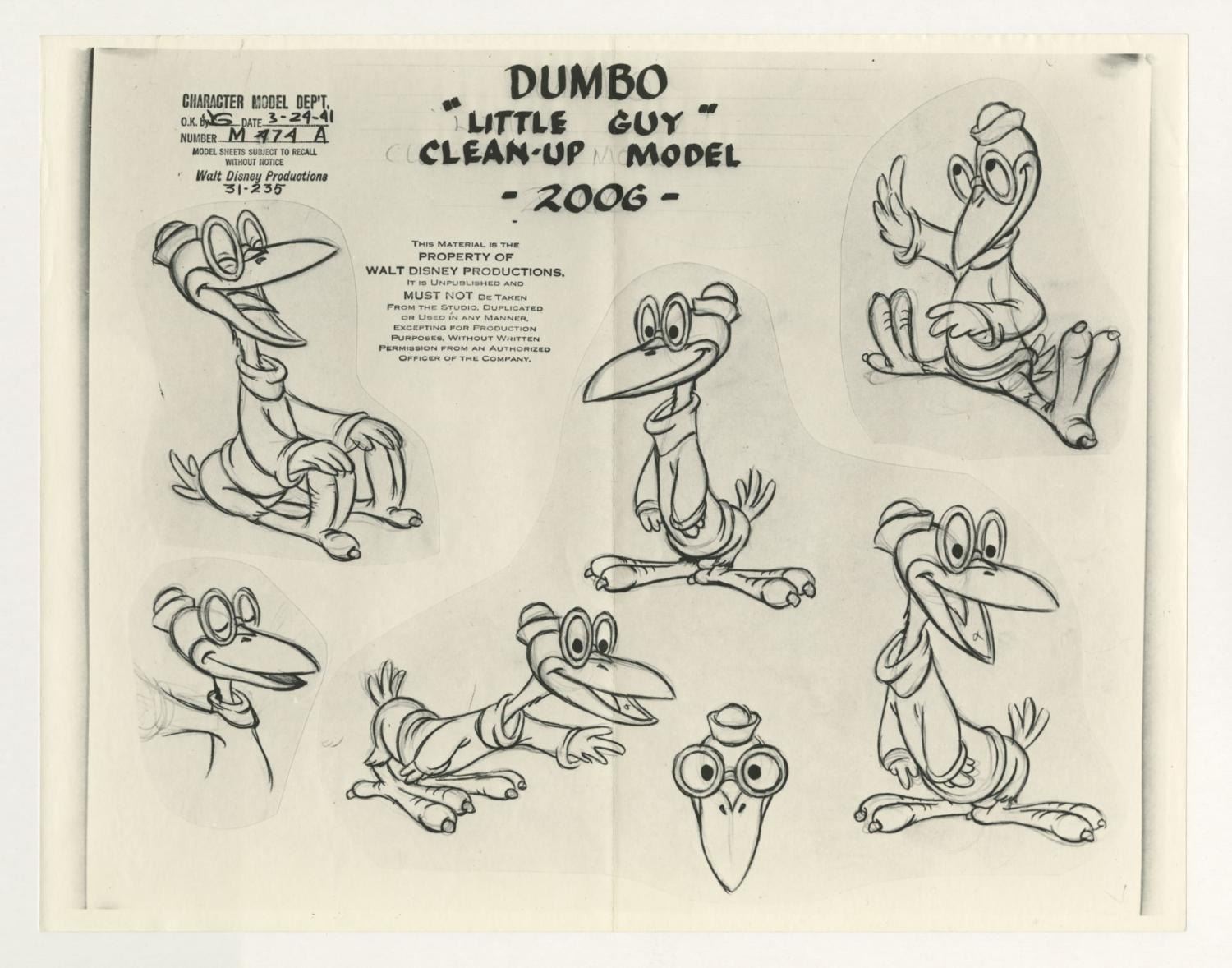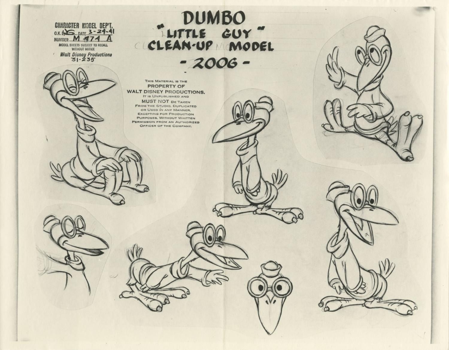 (Disney, 1941) An original photostat model sheet of the Little Guy crow from “Dumbo.” Model sheets such as this were distributed to animators and crew working on the film to ensure character design continuity. Measuring 11” x 14”, the model sheet is in very good condition with minor edge wear and a vertical crease from Studio use and storage.