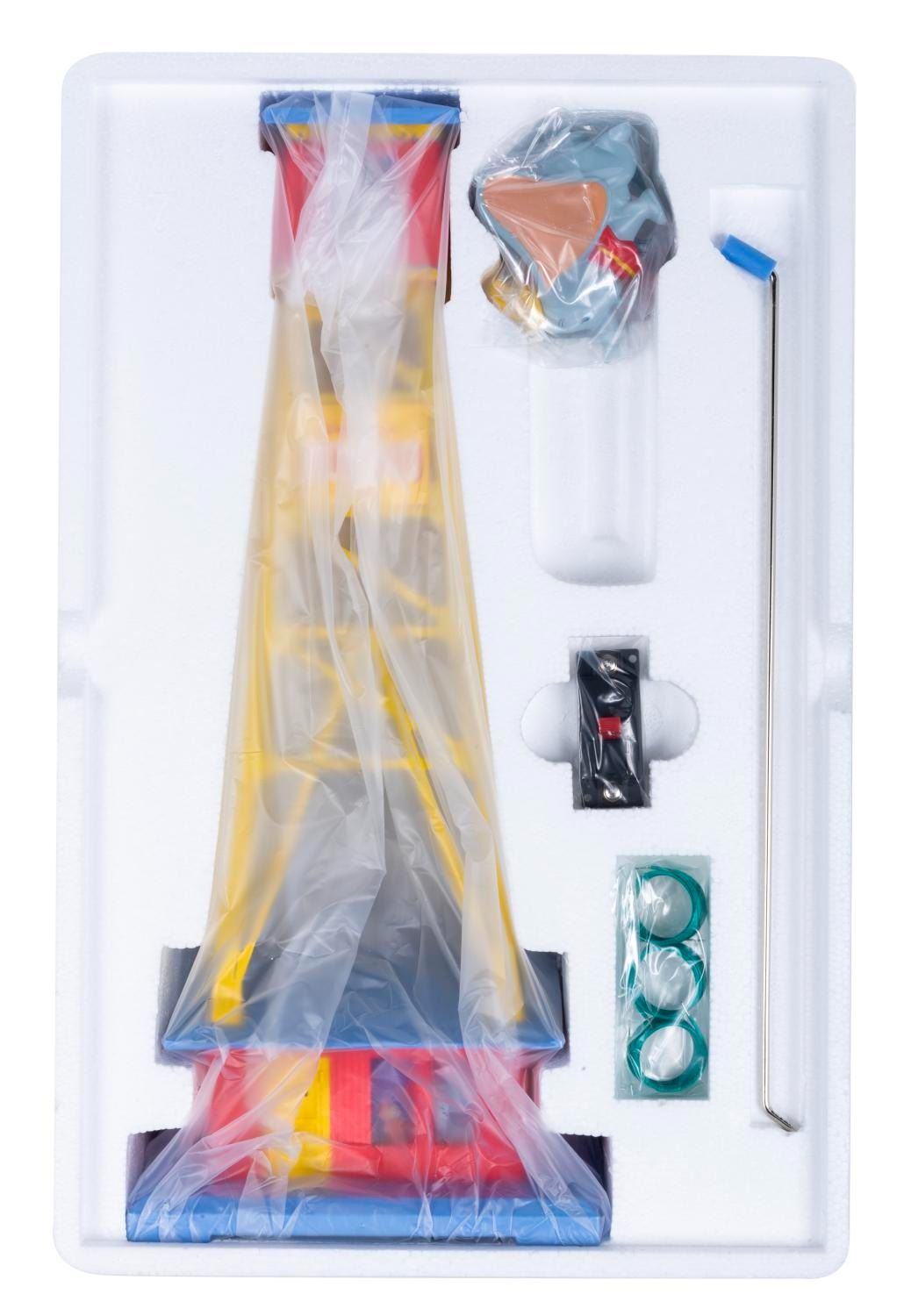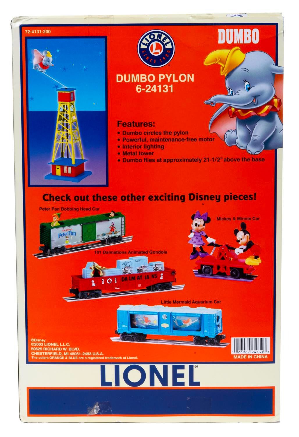 (Lionel, 2003) A Dumbo Pylon toy manufactured by Lionel. This motorized Dumbo accesory circles the metal tower pylon and features illumination. The tower measures 14.5" tall (21.5" tall with Dumbo), comes with owner's manual and original box. All pieces are in fine condition with mild wear to box and a slight tear to lid flap.