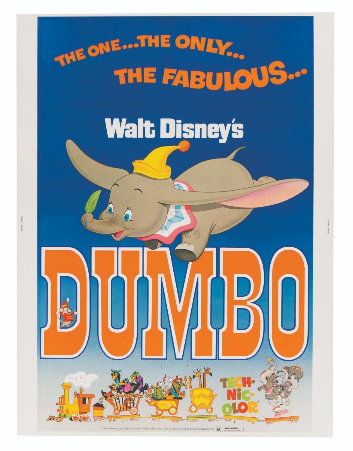 (Disney, 1972) A theatrical poster for the 1972 rerelease of Walt Disney’s “Dumbo.” The poster features the tagline “The one… the only… the fabulous… Dumbo.” Measuring 30” x 40”, the poster is in very good condition with a 6” crease in the middle, additional creases, edge wear, and light wear from display.