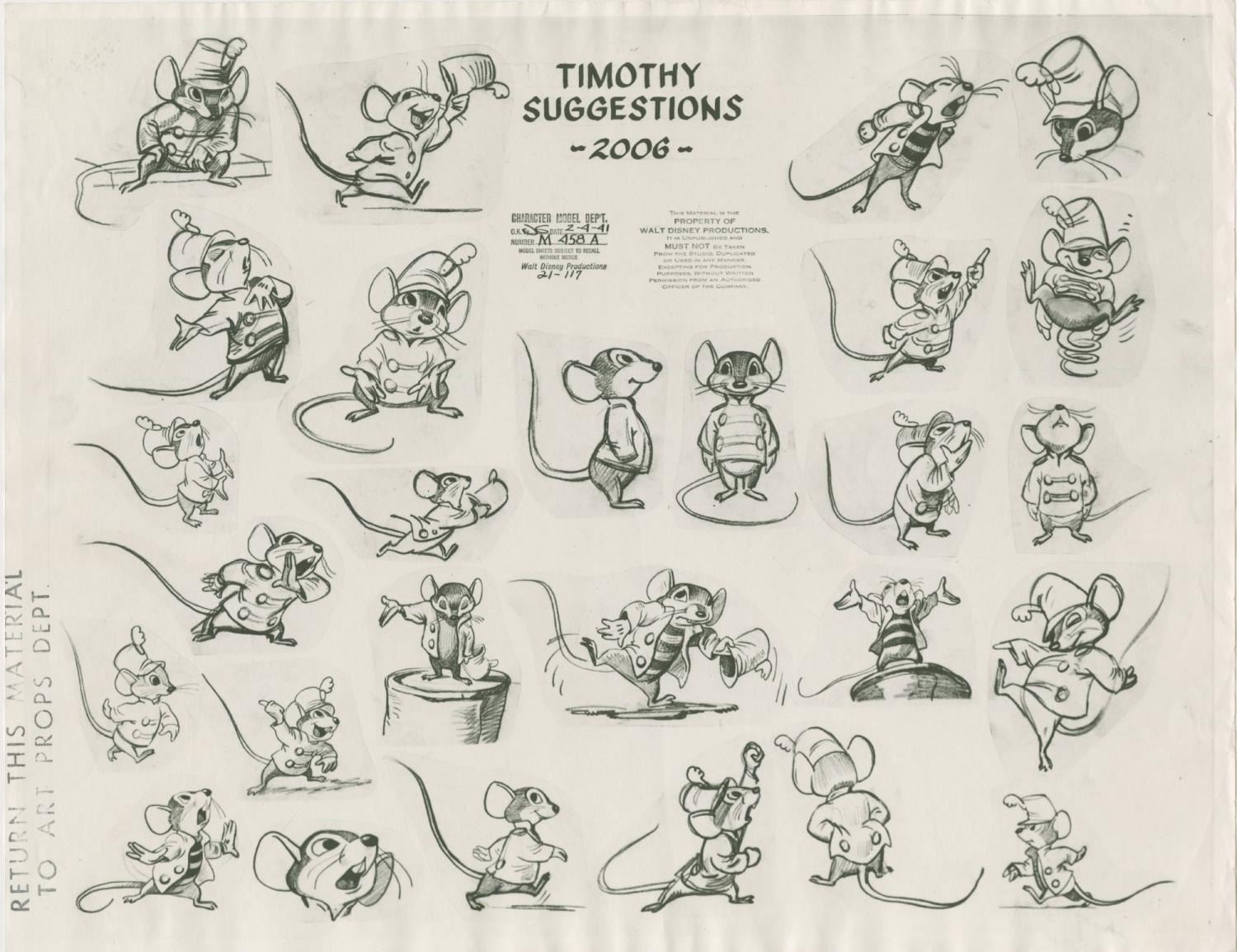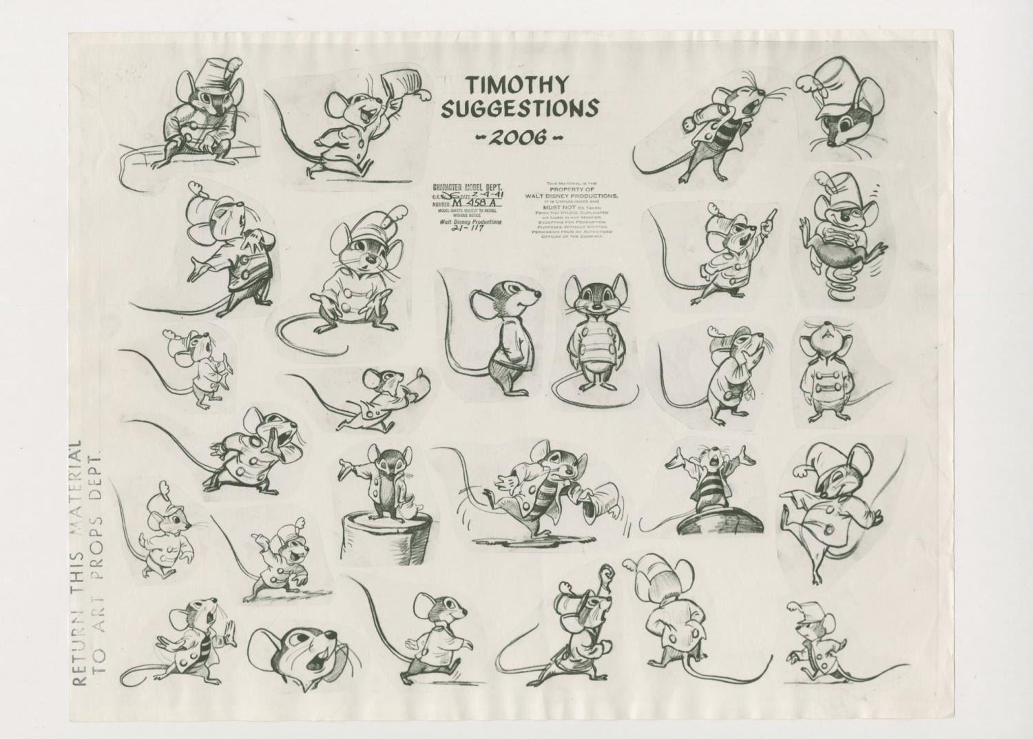 (Disney, 1941) An original photostat model sheet of Timothy Q. Mouse from “Dumbo.” Model sheets such as these were distributed to animators and crew working on the film to ensure character design continuity. Measuring 11” x 14”, the model sheet is in very good condition with minor discoloration, rippling, pinholes, and edge and corner wear from age and Studio use.