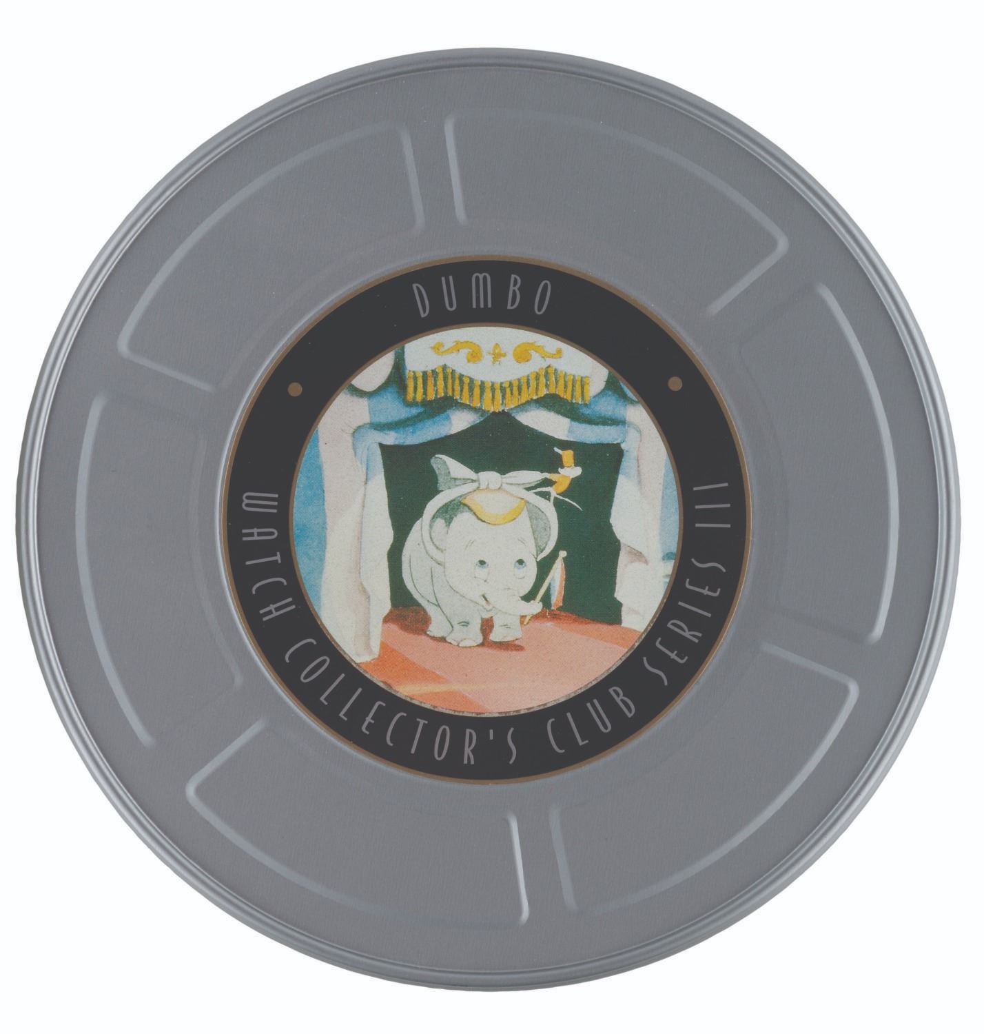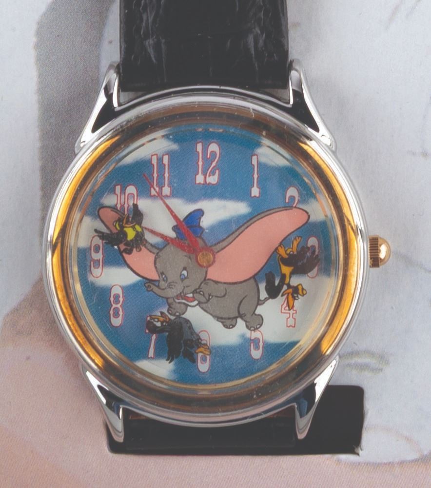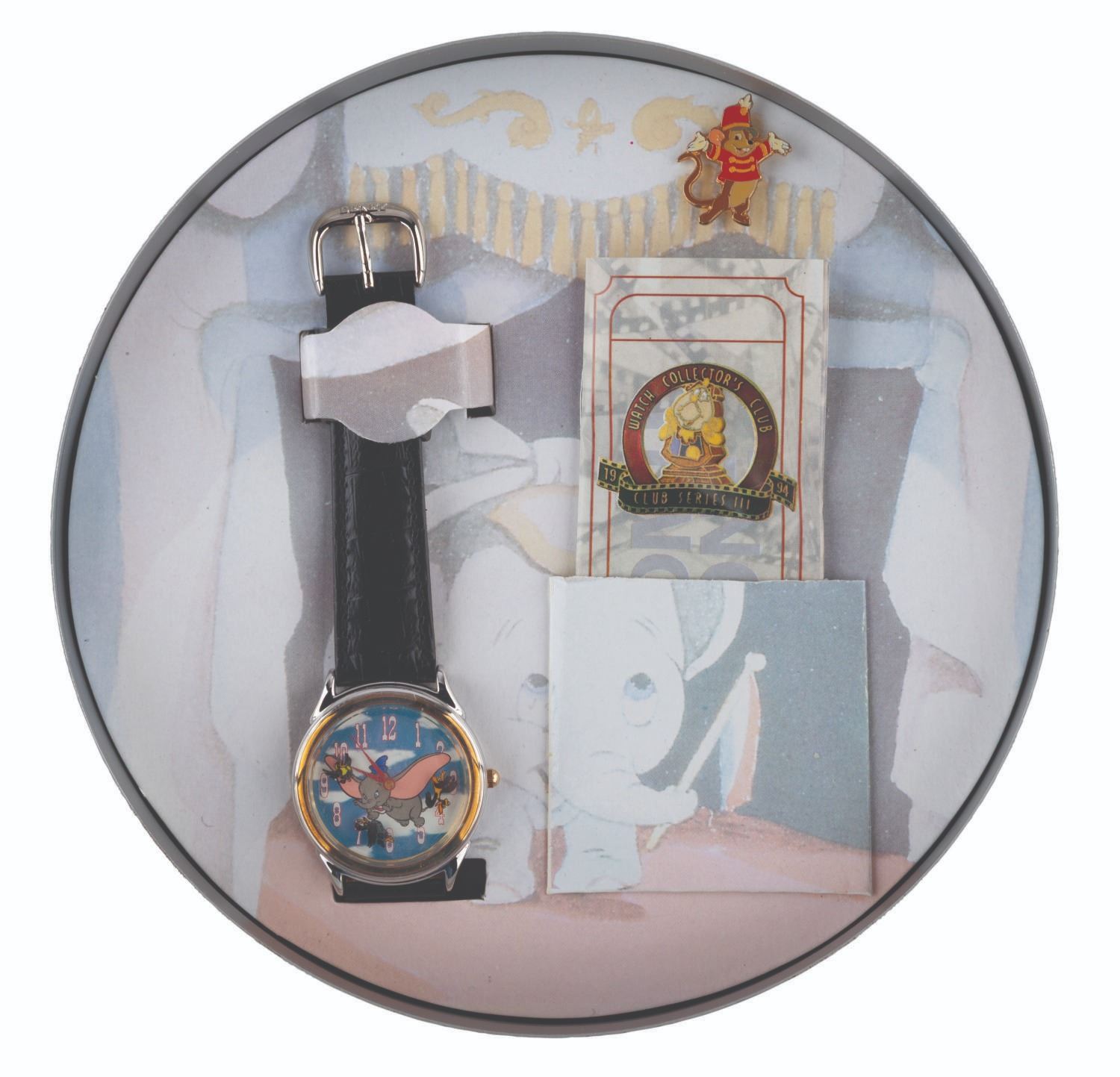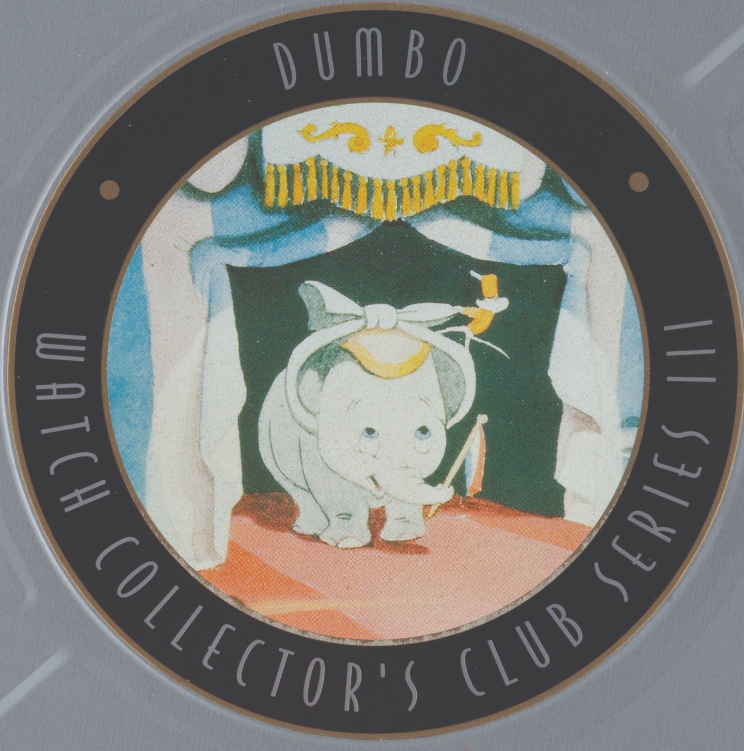 (Disney, 1994) A "Dumbo" watch from the Watch Collector's Club Series III. The face features Dumbo with the crows flying around as second hands. The watch comes with its original tin packaging, certificate, and Timothy pin. The set and watch are in fine condition, needing a battery and possibly service to function.
