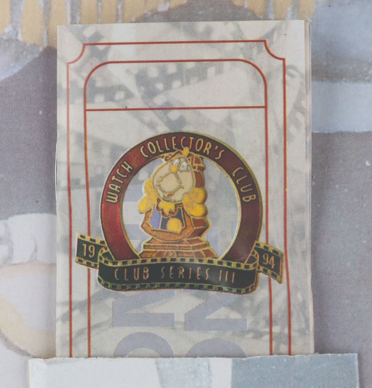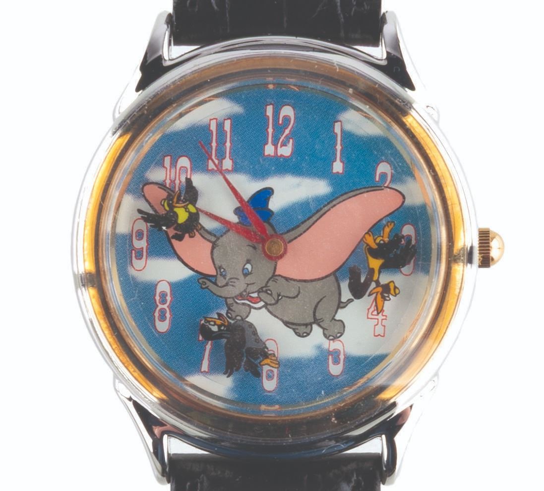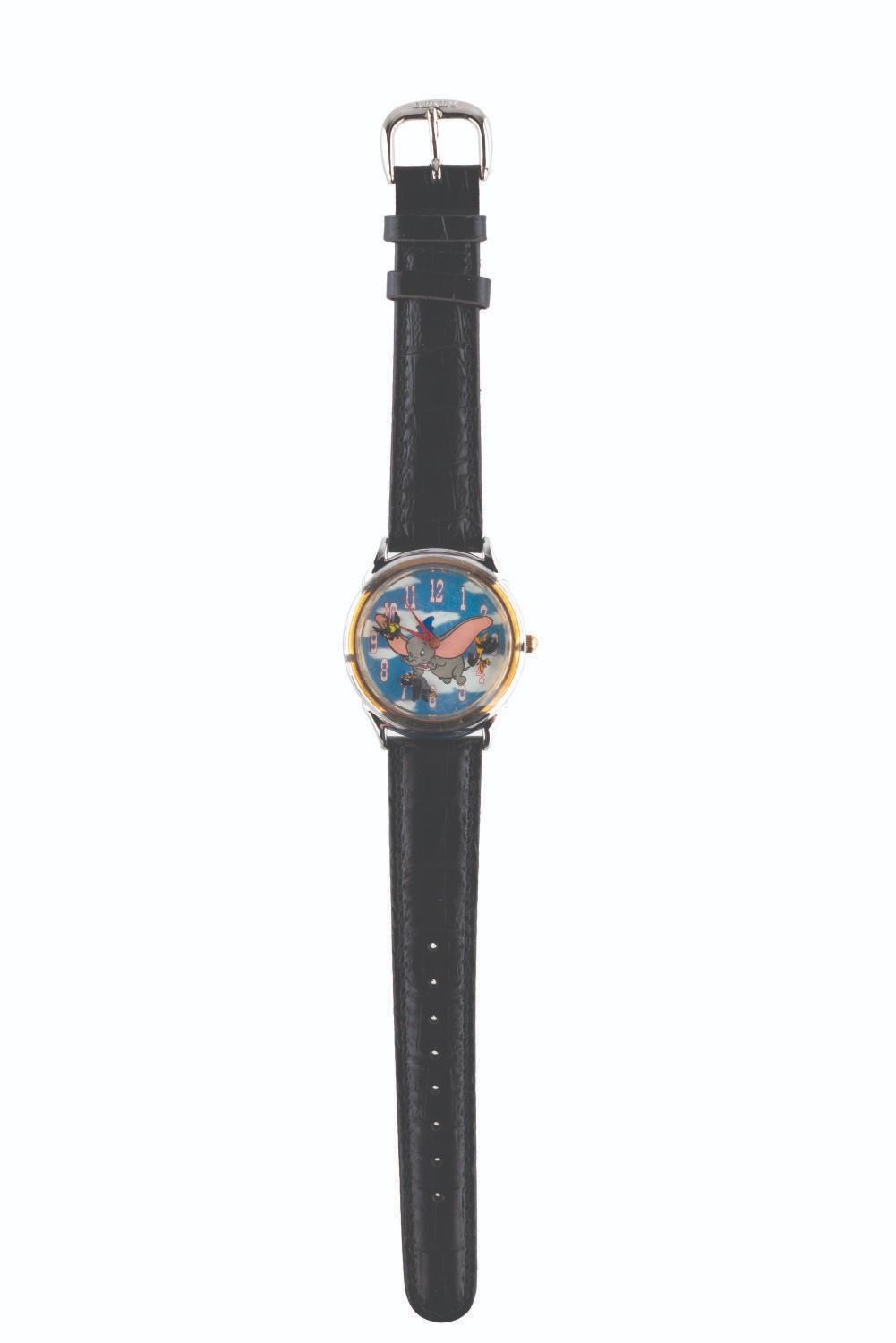 (Disney, 1994) A "Dumbo" watch from the Watch Collector's Club Series III. The face features Dumbo with the crows flying around as second hands. The watch comes with its original tin packaging, certificate, and Timothy pin. The set and watch are in fine condition, needing a battery and possibly service to function.