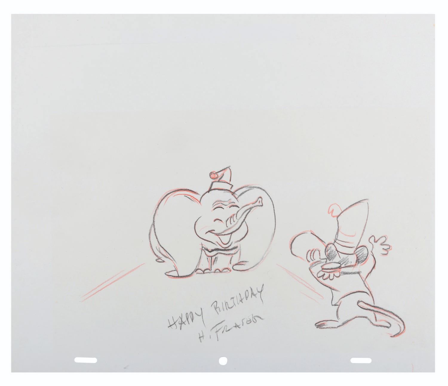(Fraser, 1960s-70s) A drawing of Dumbo and Timothy Mouse by animator Hugh Fraser, signed with a Happy Birthday dedication. A prolific animator and artist, Fraser worked on many Walt Disney animated films including “Peter Pan,” “Lady and the Tramp,” and “Dumbo.” Accomplished in pencils with an image size of 5.25” x 10" on 10.5” x 12.5” animation paper, the drawing is in very good condition.