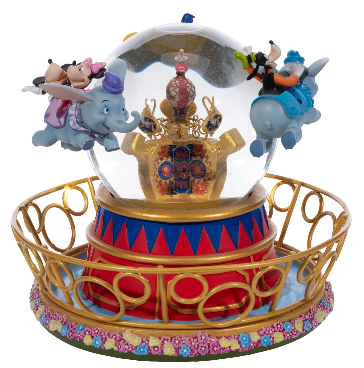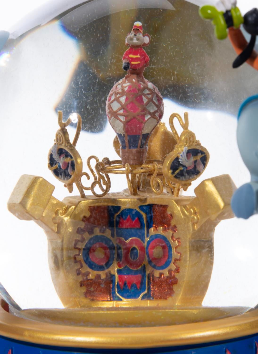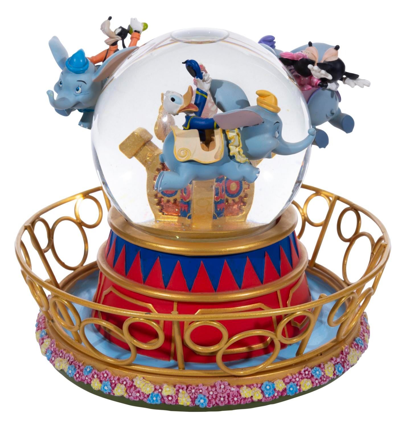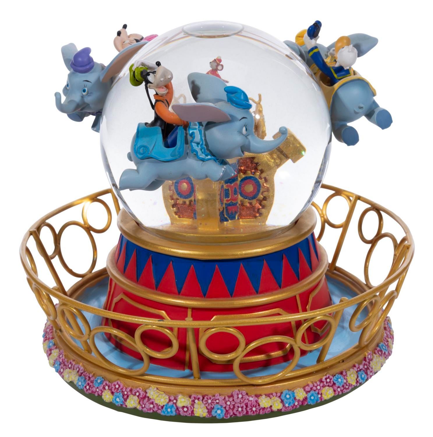 (Disney, 2000s) A Dumbo's Flight snow globe from the Disney Catalog. The figural sculpture features Mickey & Minnie Mouse, Donald Duck, and Goofy soaring in Dumbo Flying Elephants. The piece features rotating motion and a musical feature that plays "Zip-A-Dee-Doo-Dah." Measuring 7.5" tall and 7.75" in diameter, this sculpted resin and glass piece is in fine working condition.