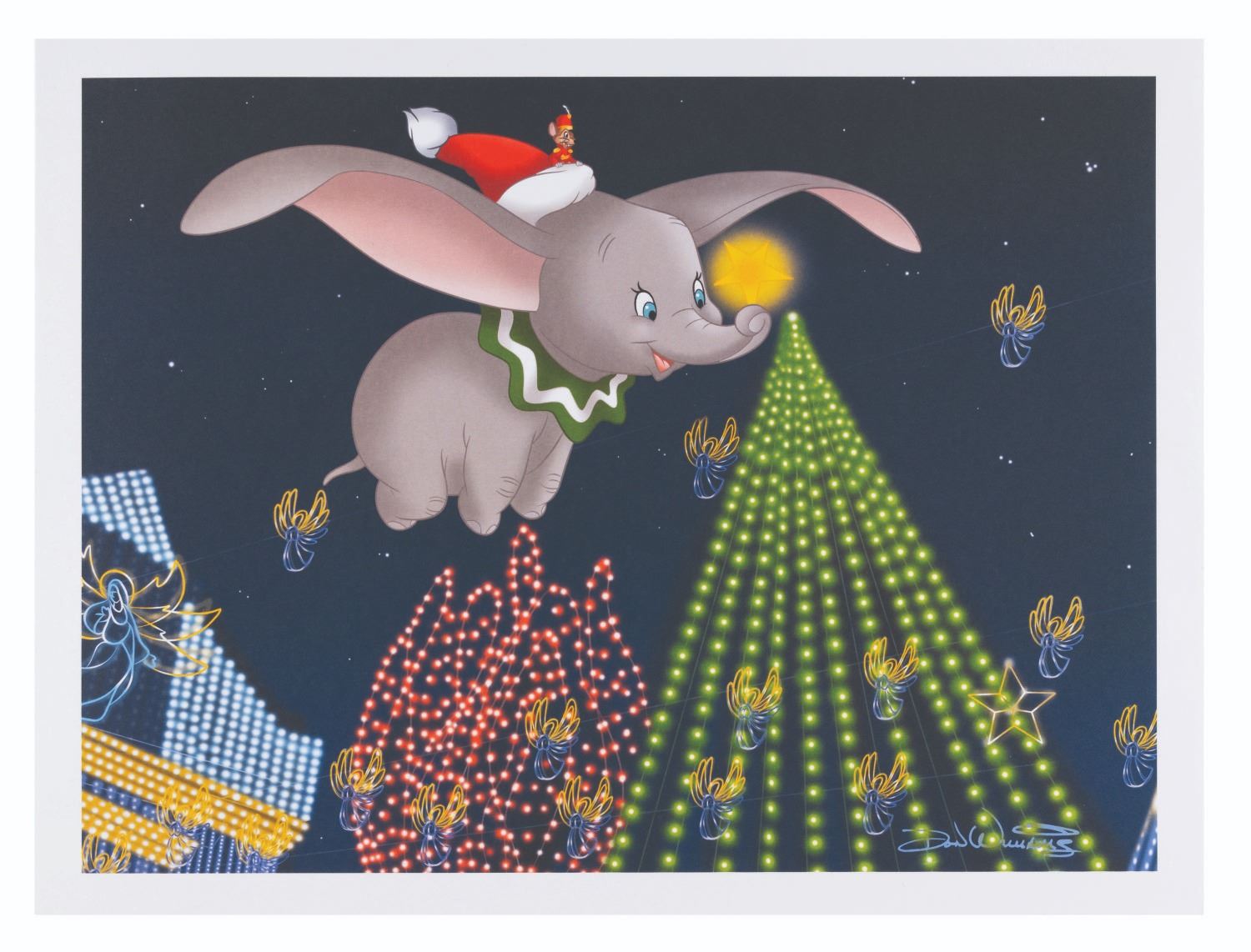 (Disney, 2006) A limited edition “Dumbo’s Light Flight” litho print by Disney character artist Don “Ducky” Williams. Based on cover art for the Winter 2006 Mickey Monitor, the print depicts Dumbo and Timothy placing a star on a Christmas tree light display at the Osborne Family Spectacle of Dancing Lights in Walt Disney World. Measuring 9” x 12”, the print is in fine condition and includes a certificate of authenticity.