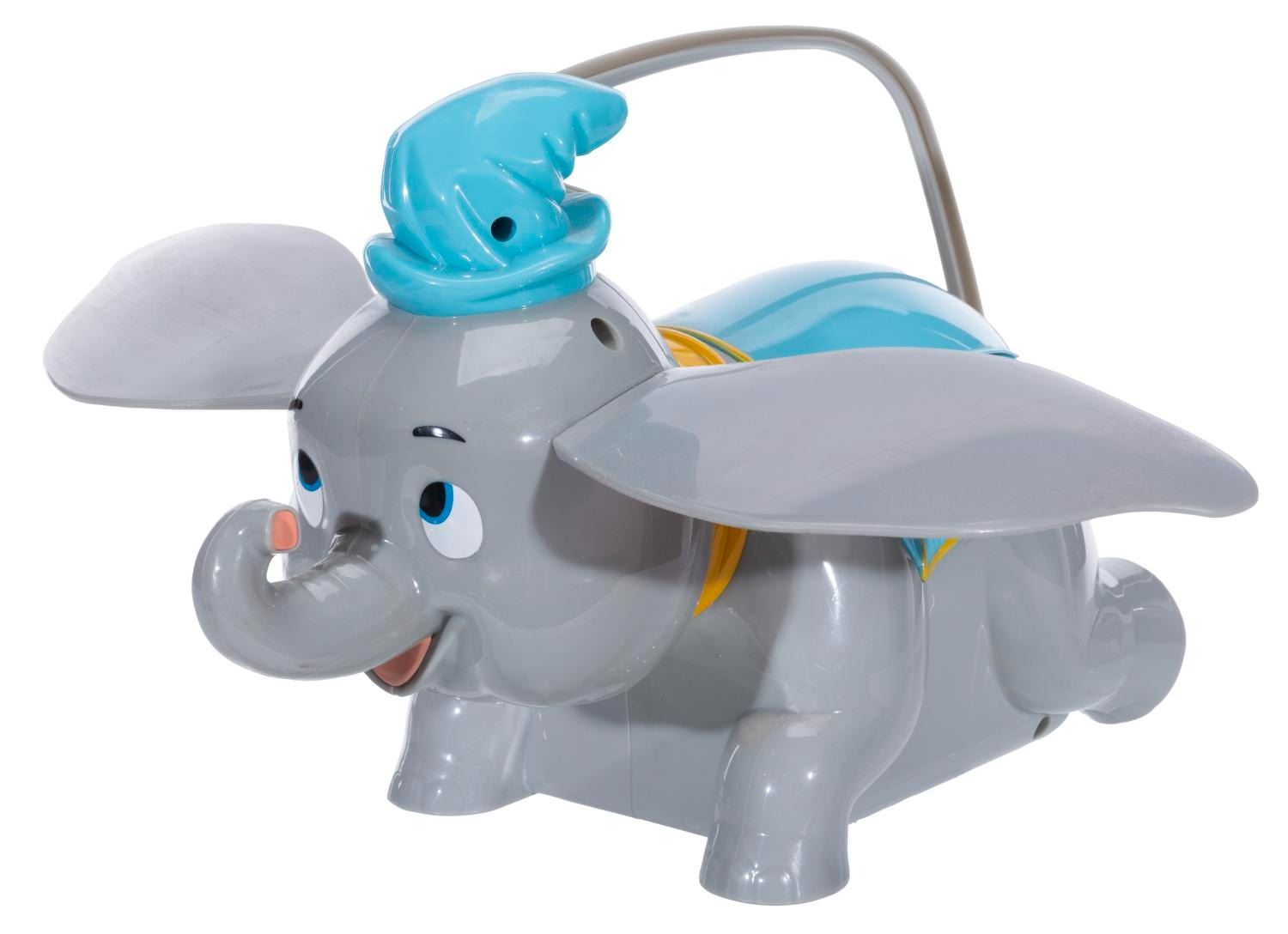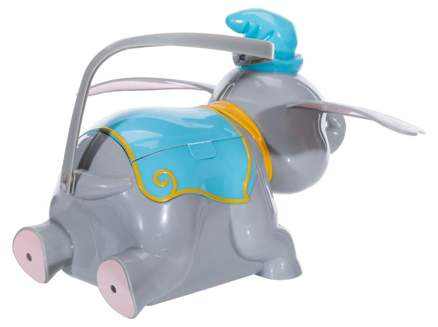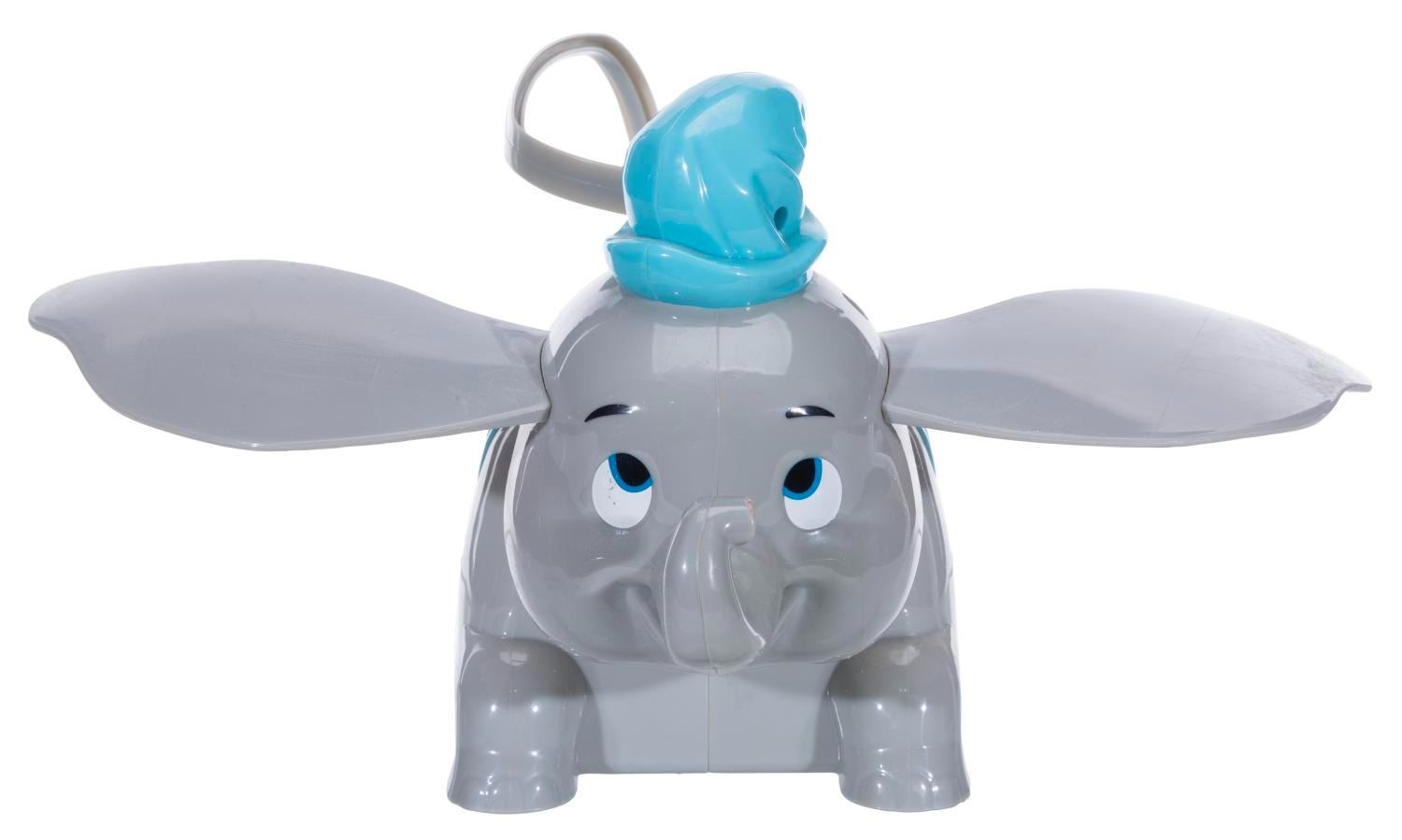 (Disneyland, 2013) A Dumbo the Flying Elephant ride vehicle popcorn bucket based on the beloved Fantasyland attraction. Measuring 11" x 14" x 8", the bucket displays in good condition with light scratches and scuffs throughout, light warping to the handle, and paint cracking with scuffs to the left eye.