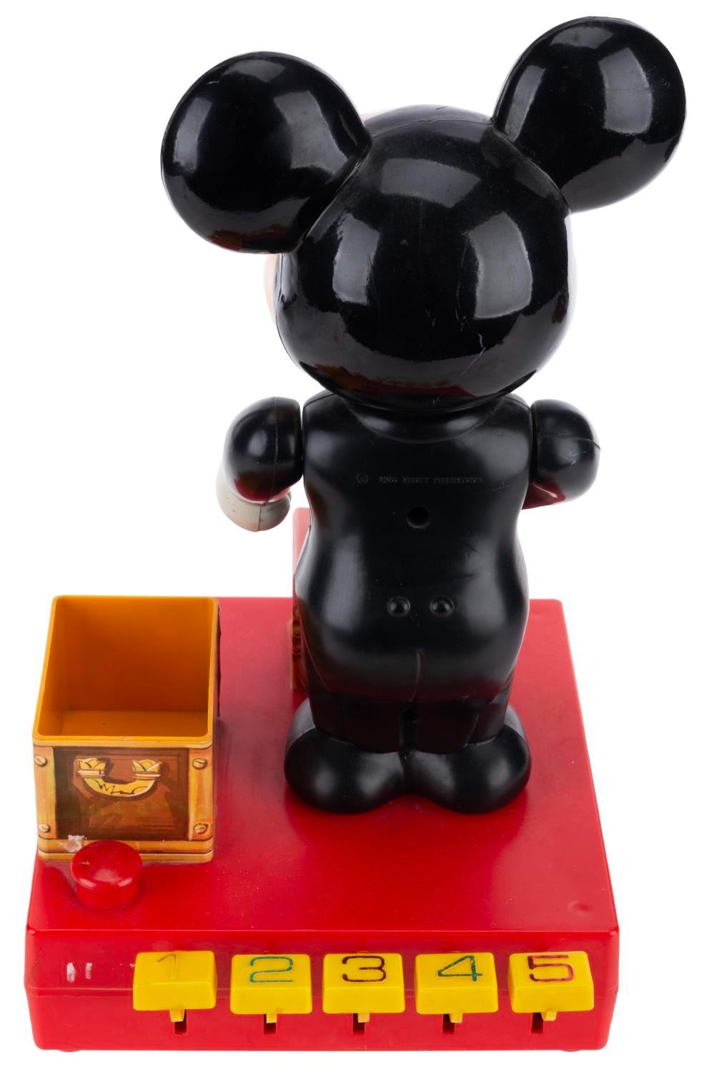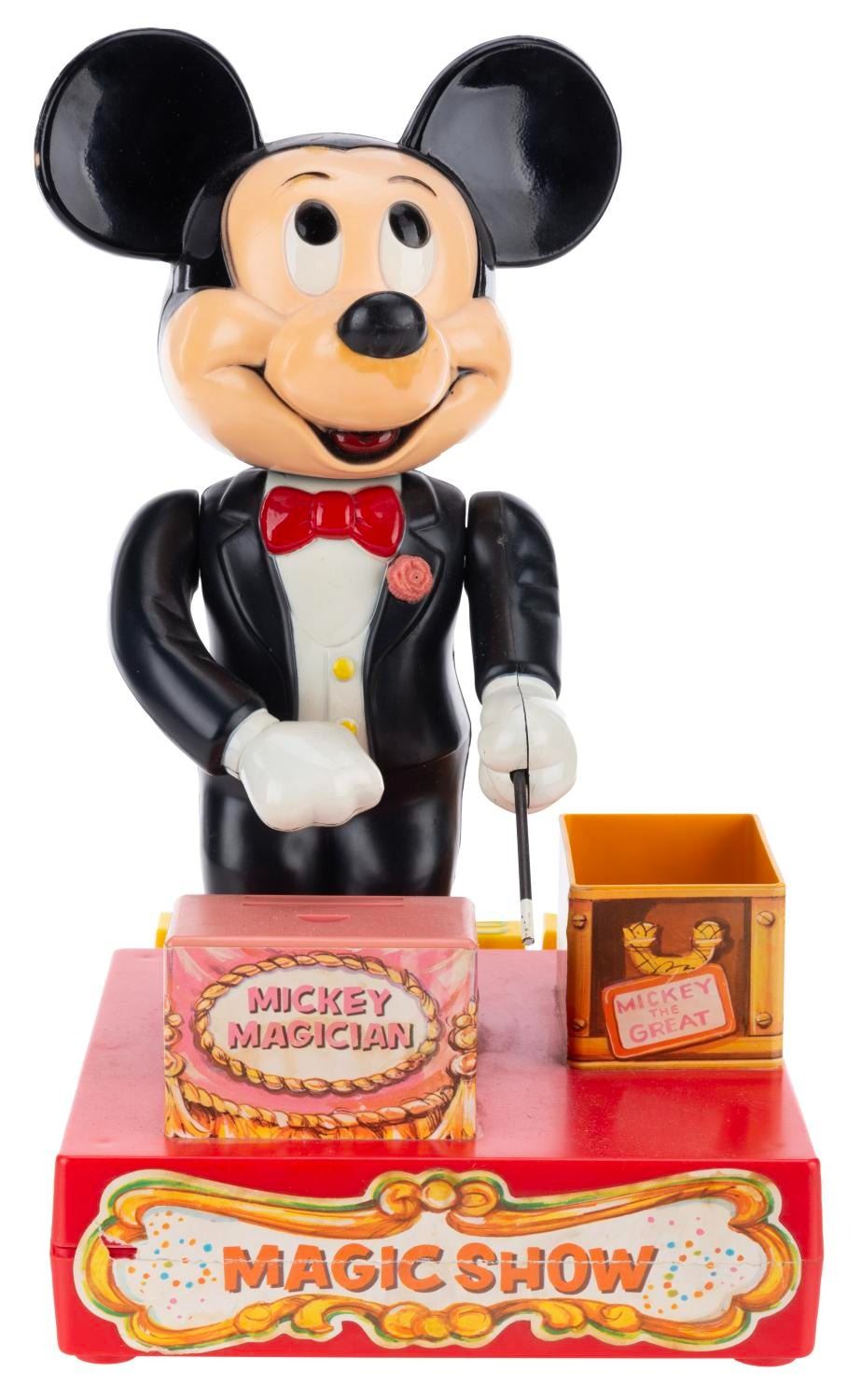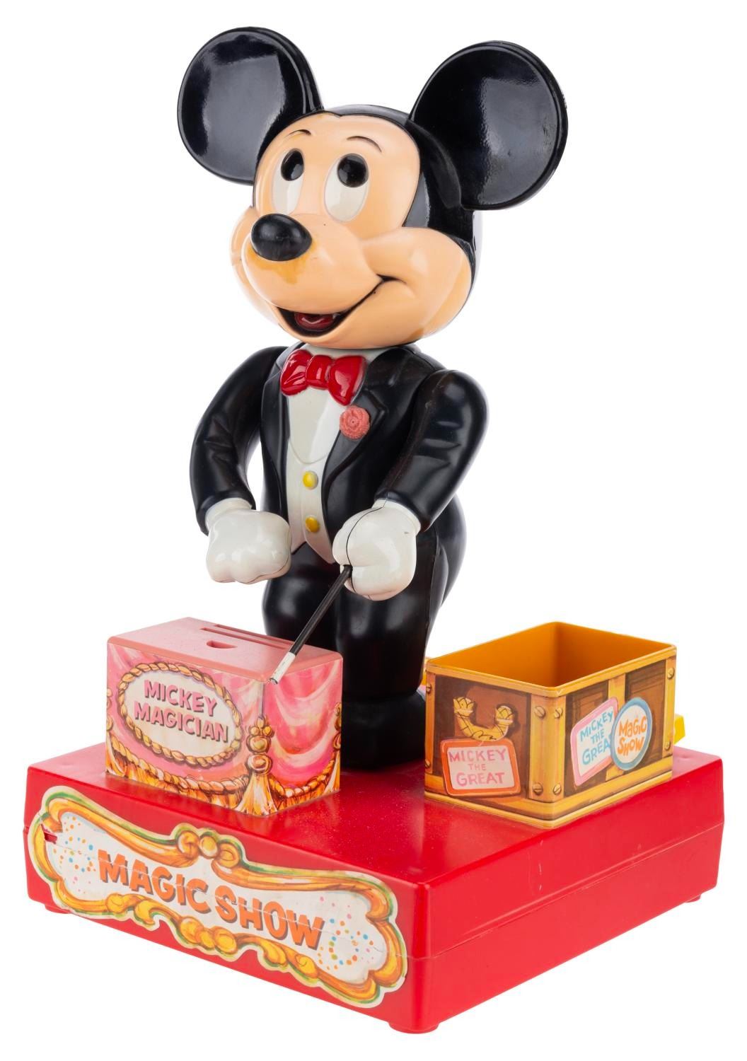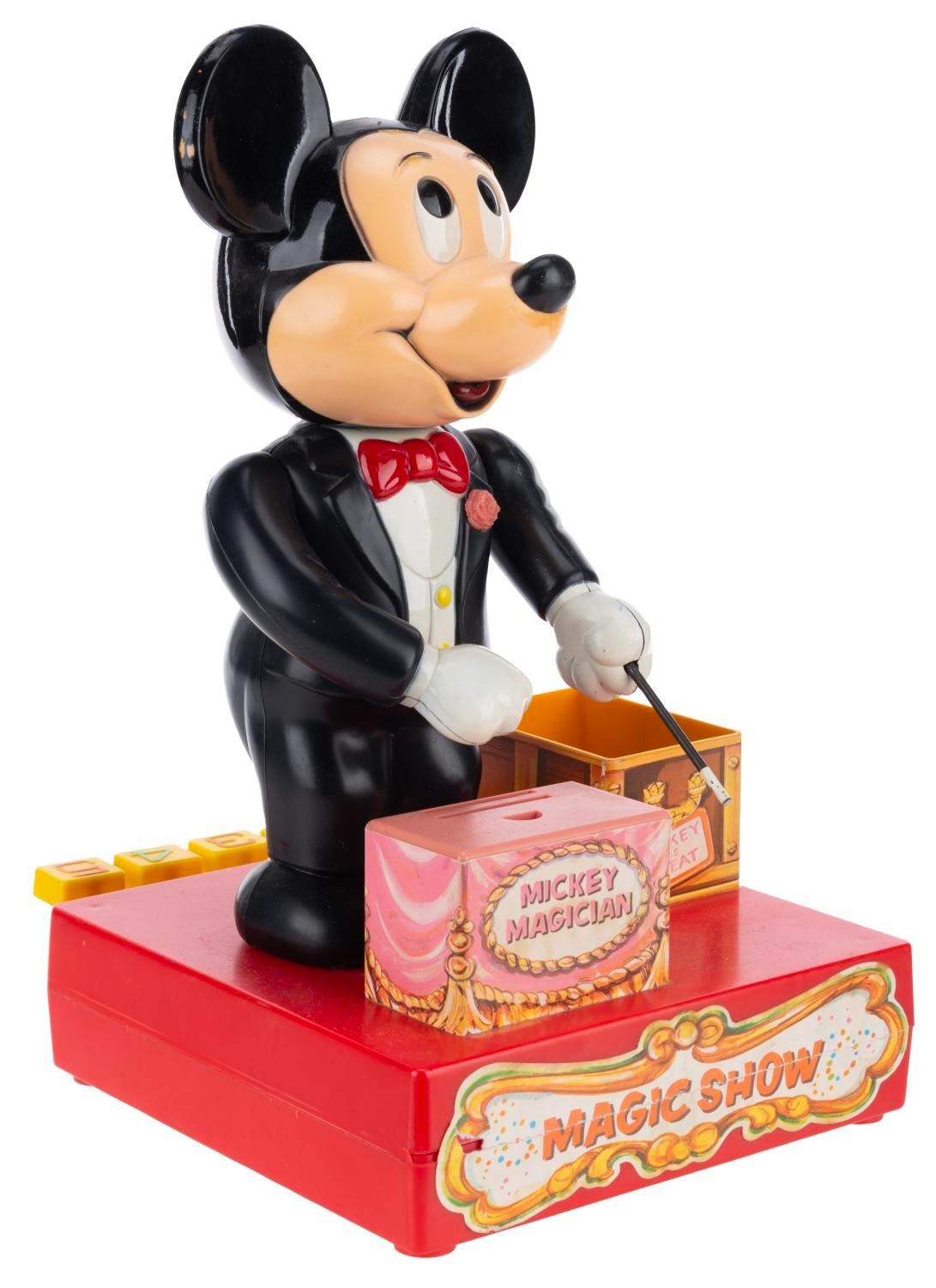 (Durham’s, 1976) The main body of a Durham's Mickey Magician toy. The toy is missing all accessories, including Mickey’s cape, and Mickey can wave his wand or raise his other hand with the press of a button. Measuring 7.25" x 8.25" x 12" tall, the toy displays in good condition with typical wear from use.