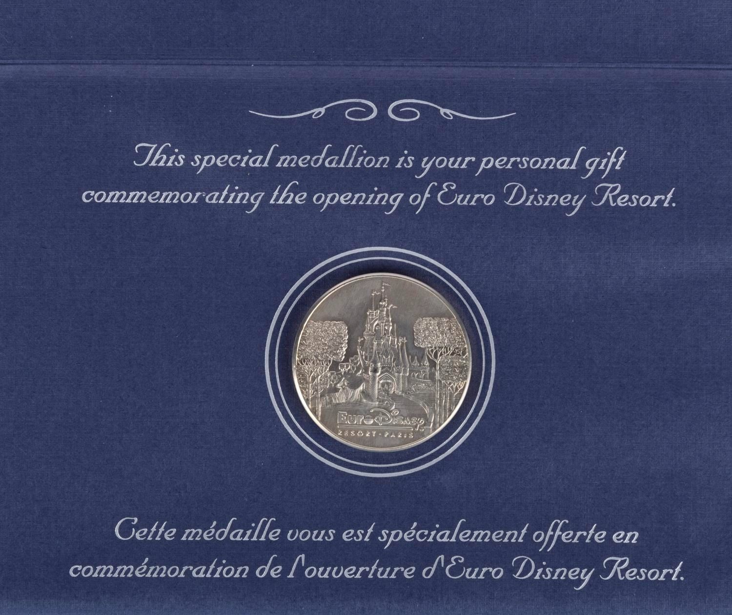 (Euro Disney Resort, 1992) A medallion coin gifted to Cast Members, commemorating the Grand Opening Day of Euro Disney Resort. Measuring 1.5" in diameter, this coin is in fine condition with its original 6.75"x5" very good condition card, which exhibits creases and wear.