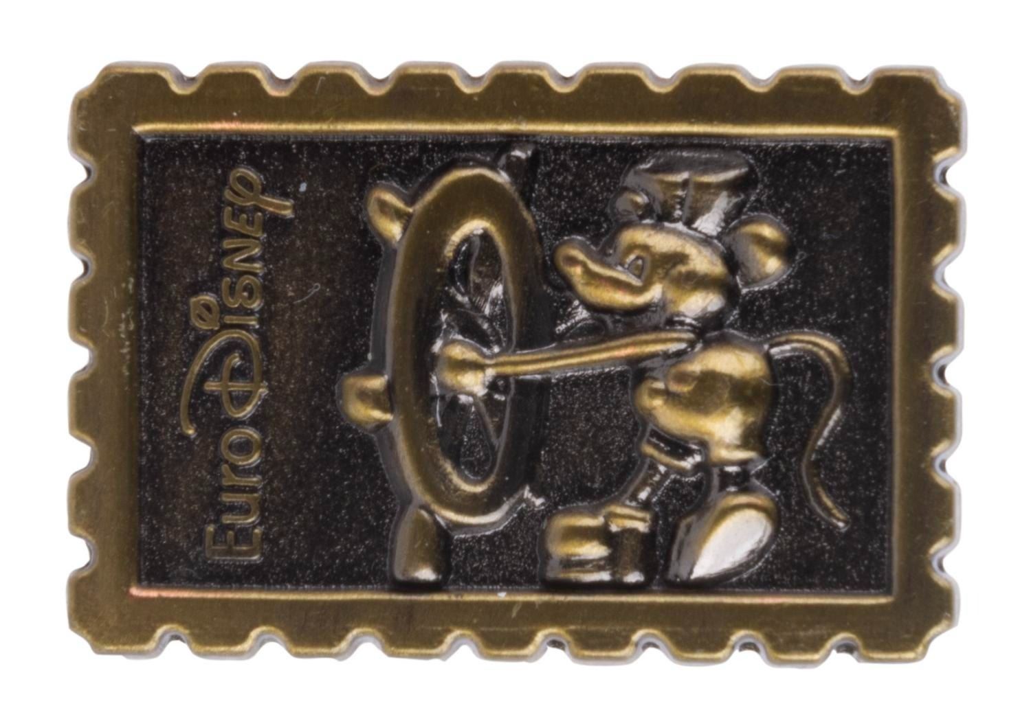(Euro Disney, 1992-94) A bronze-colored postage stamp-style pin of Steamboat Willie released at Euro Disney before the Park’s change to Disneyland Paris. The pin is in very good condition.