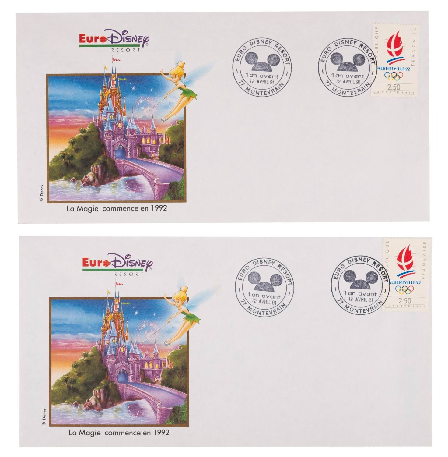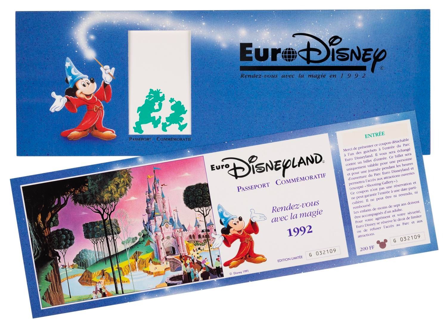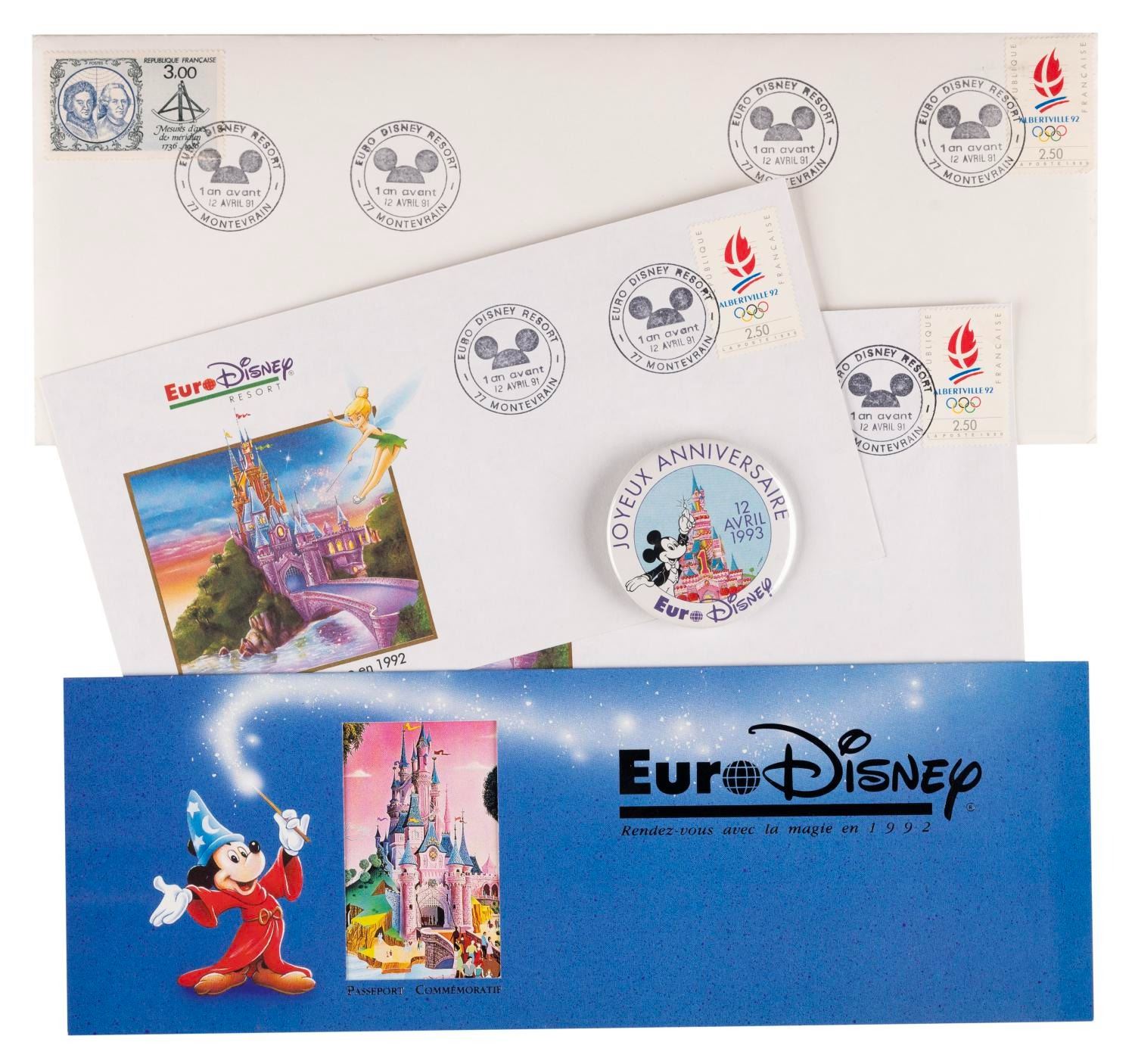 (Euro Disneyland, 1992-1993) An early Euro Disneyland French-language commemorative passport with the original envelope plus a pair of extra envelopes, and a first-anniversary pinback button. Measuring from the 2.25" diameter button to the 4.75" x 12.75" passport and envelope, the items are in very good condition with light handling wear.