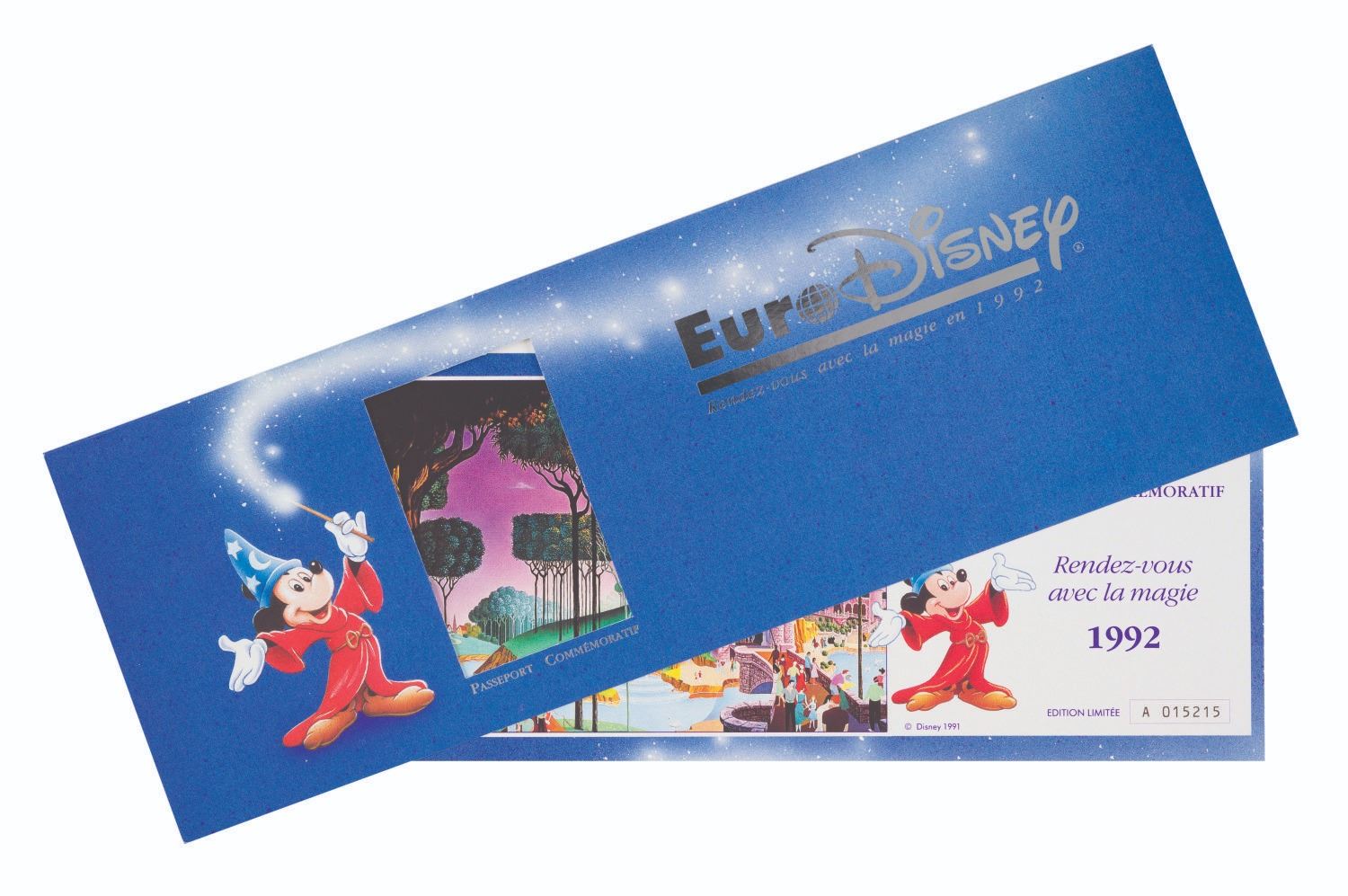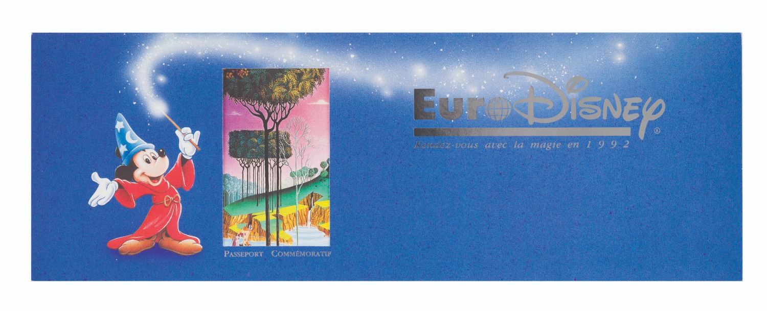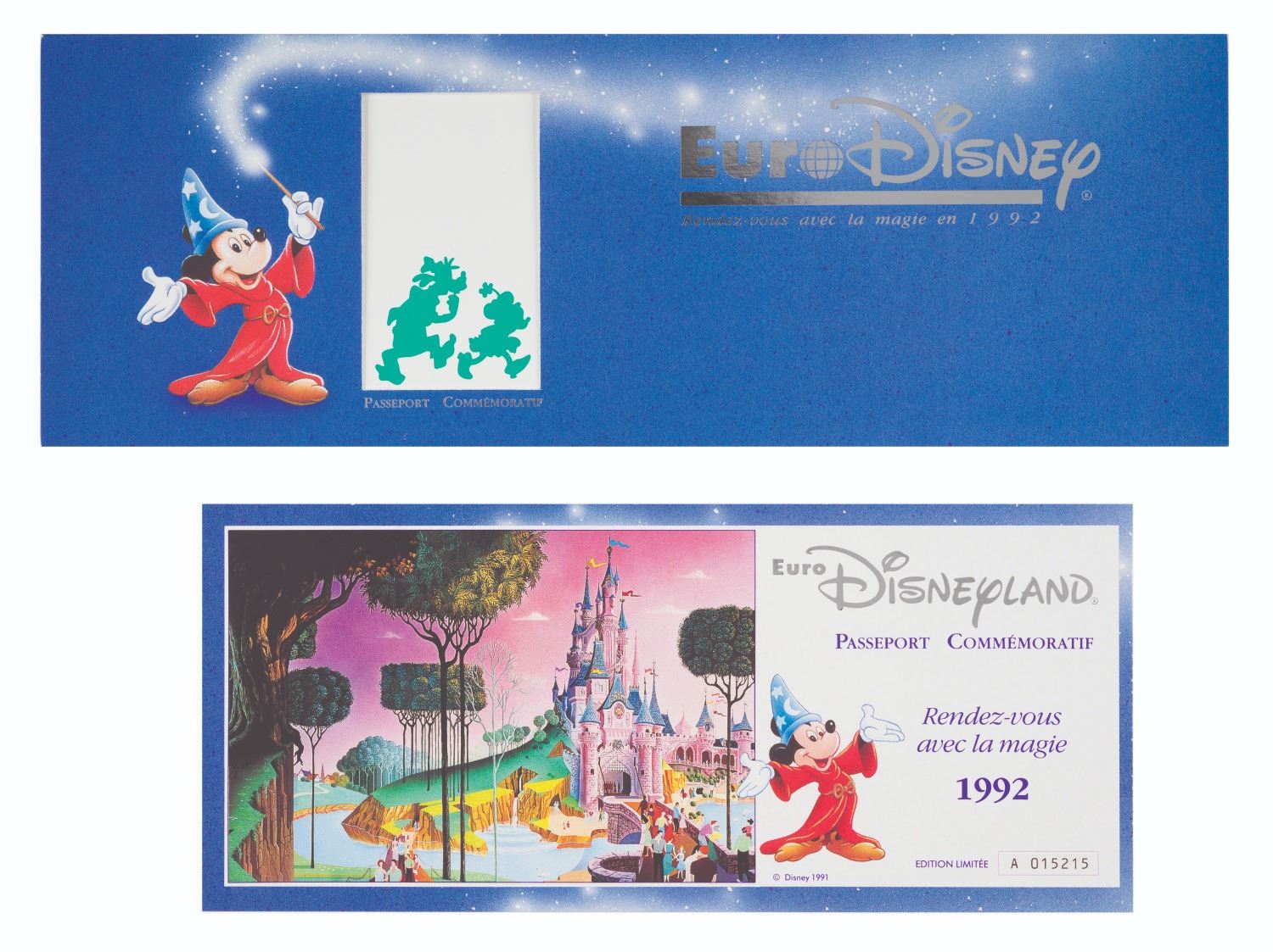 (Euro Disneyland, 1992) A commemorative and limited edition passport for Euro Disneyland from 1992, the opening year. This passport is number A015215 and features the Sorcerer’s Apprentice Mickey Mouse on the envelope and a beautiful illustration of Chateau de la Belle au Bois Dormant (Sleeping Beauty Castle) inside. Measuring 4.25" x 11.75", the passport is in very good to fine condition, missing its stub, and with very light wear from handling or age.