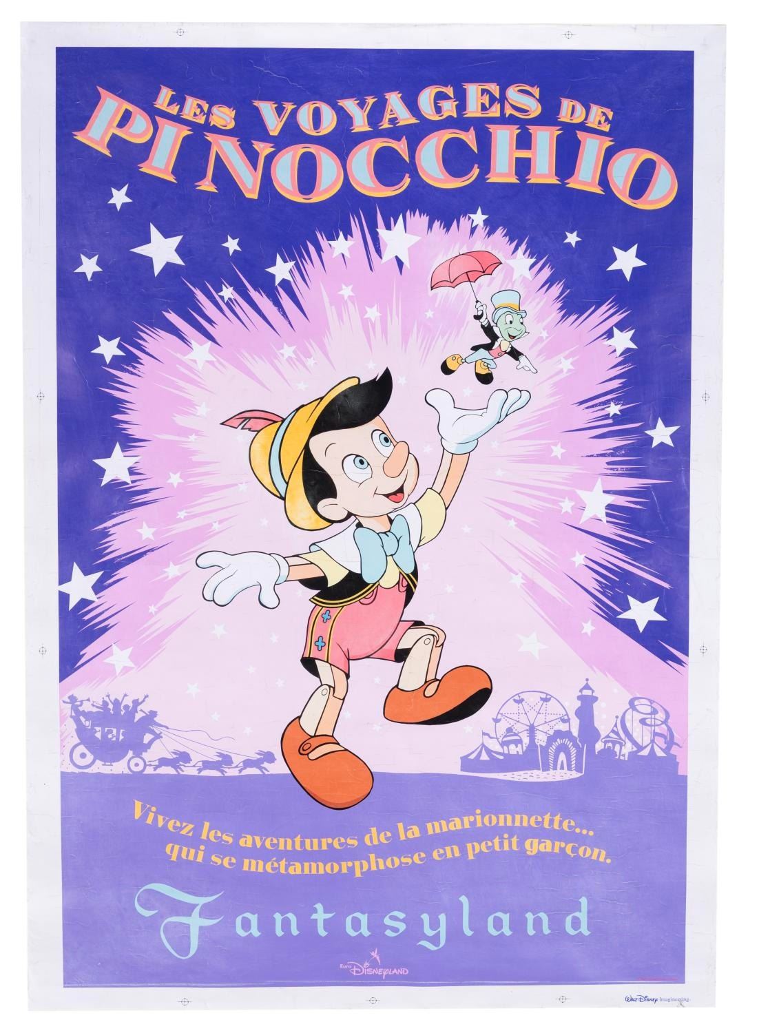 (Euro Disneyland, 1992) A rare uncut Walt Disney Imagineering attraction poster for Les Voyages de Pinocchio at Euro Disneyland. Measuring 33" x 46.5", the poster displays in good condition with small creases throughout, edge tears, a horizontal line along the bottom, light discoloration, and wear.