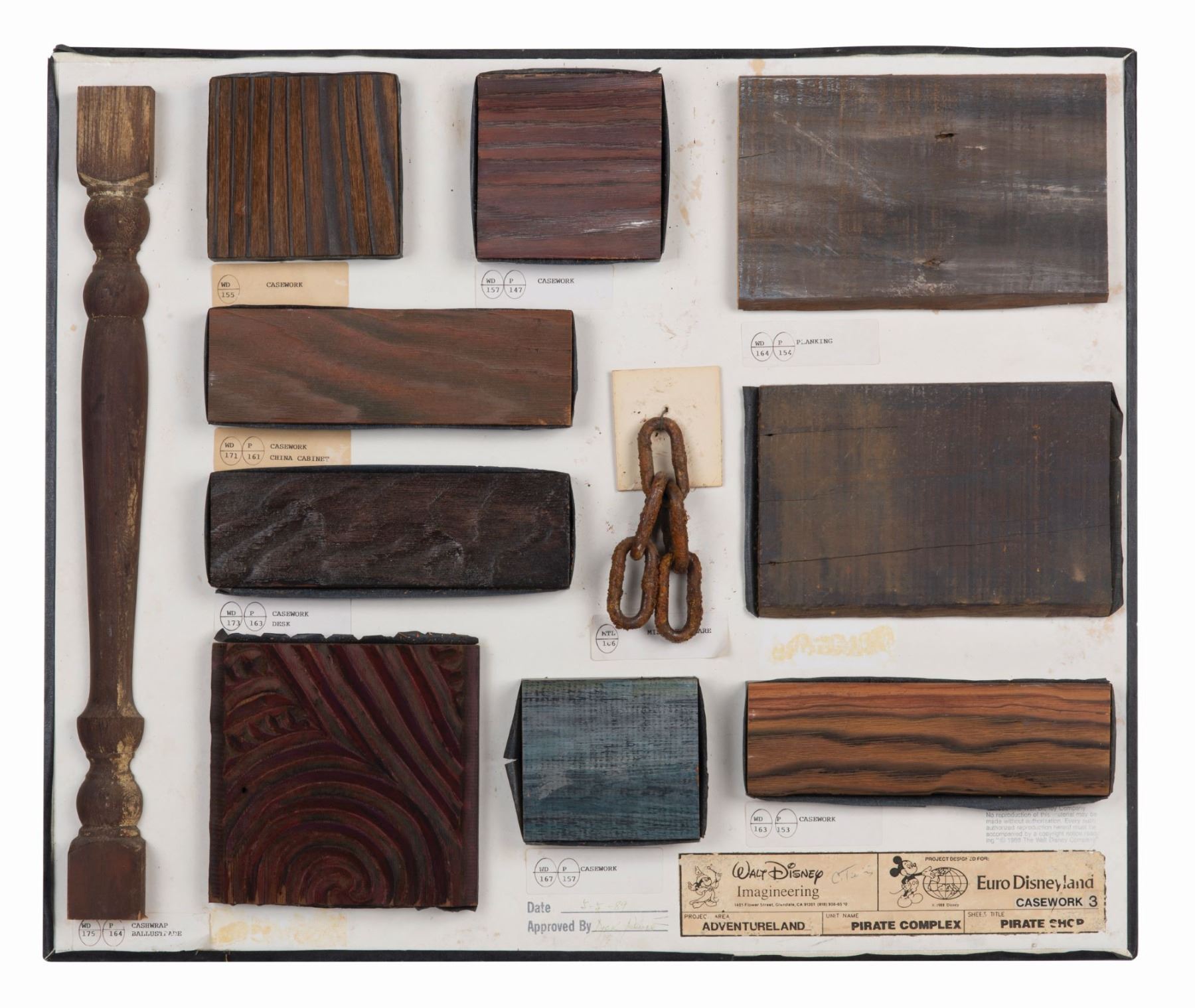 (Euro Disneyland, 1988-89) A textural casework study prepared for Pirates of the Caribbean and Blue Lagoon Restaurant in Adventureland. The casework study was created by Walt Disney Imagineering to add thematic character to the paneling, flooring, balustrade, and other elements of the stage. The piece is composed of wooden and metallic samples with descriptions, mounted to foam board for presentation, and offers a unique view into Imagineering attractions for Disney Parks. Measuring 24"x20" and 2.5" wide, the casework study is in very good condition, despite slight scuffs, minor spots of discoloration, and wear.