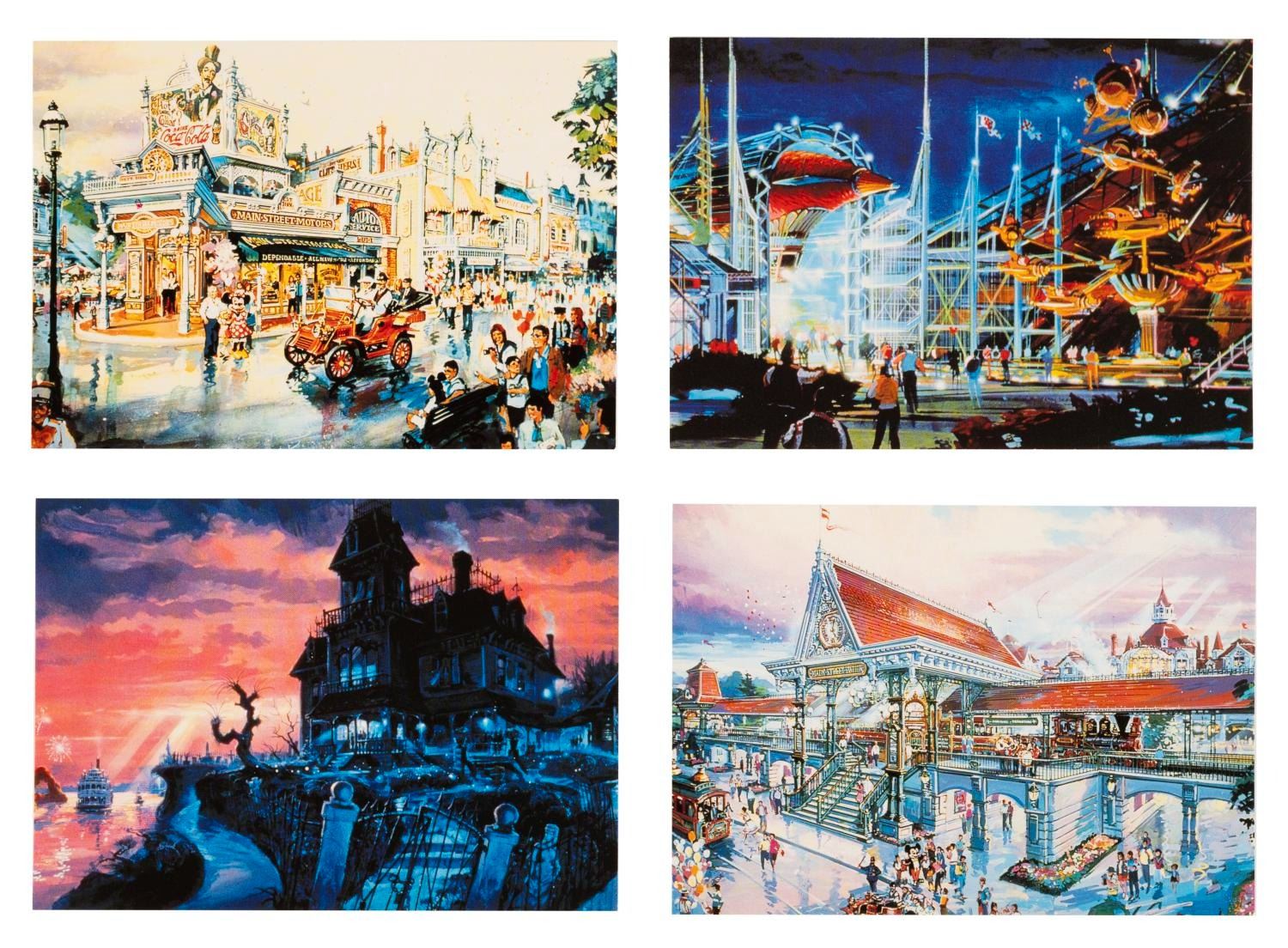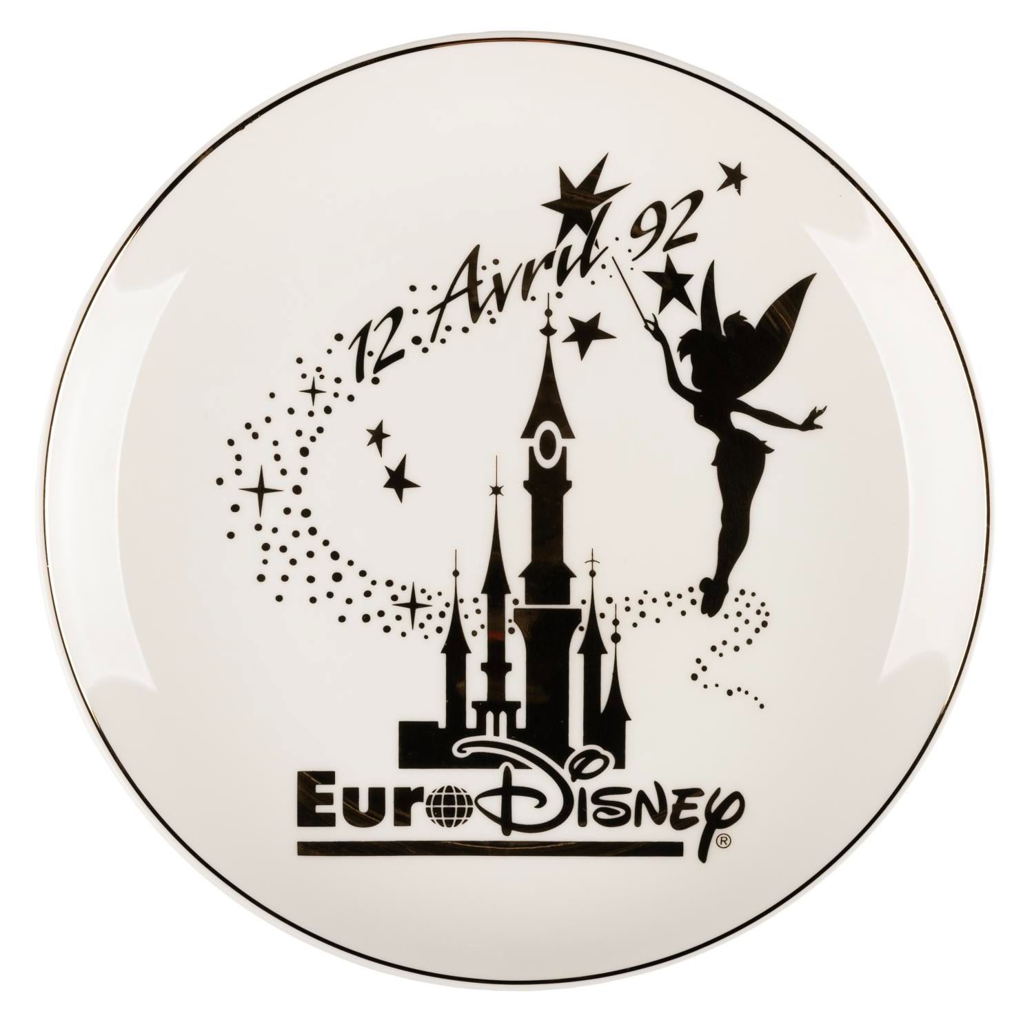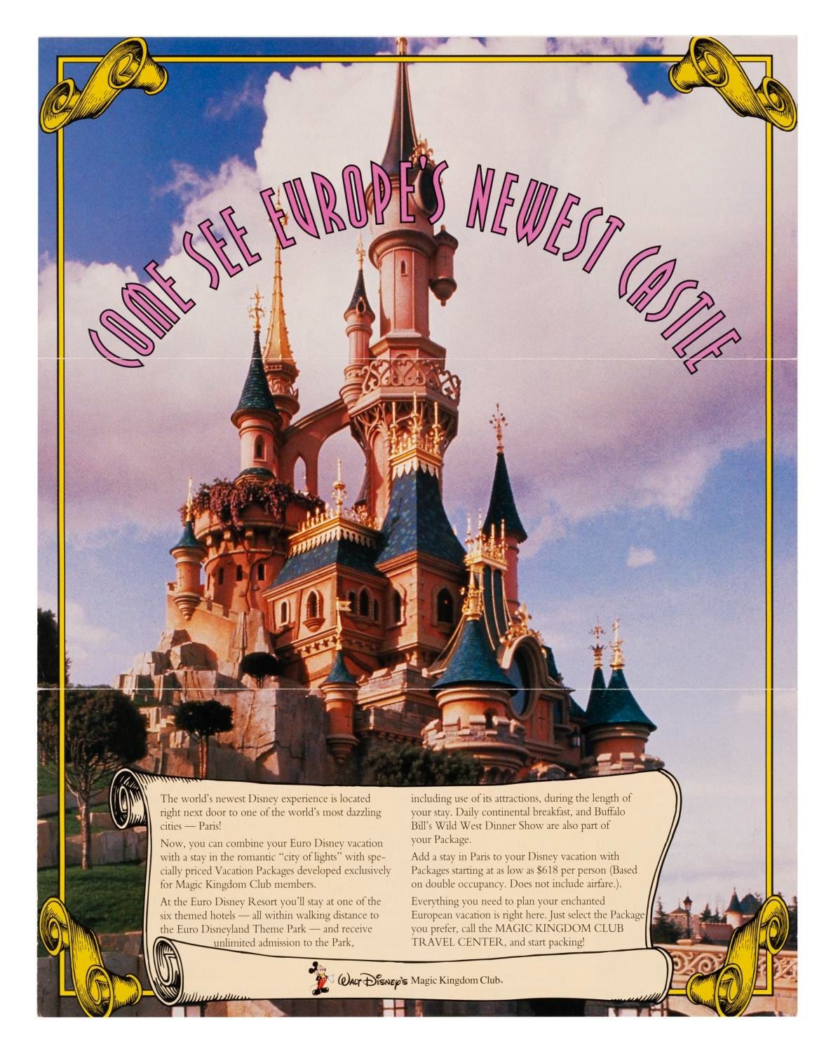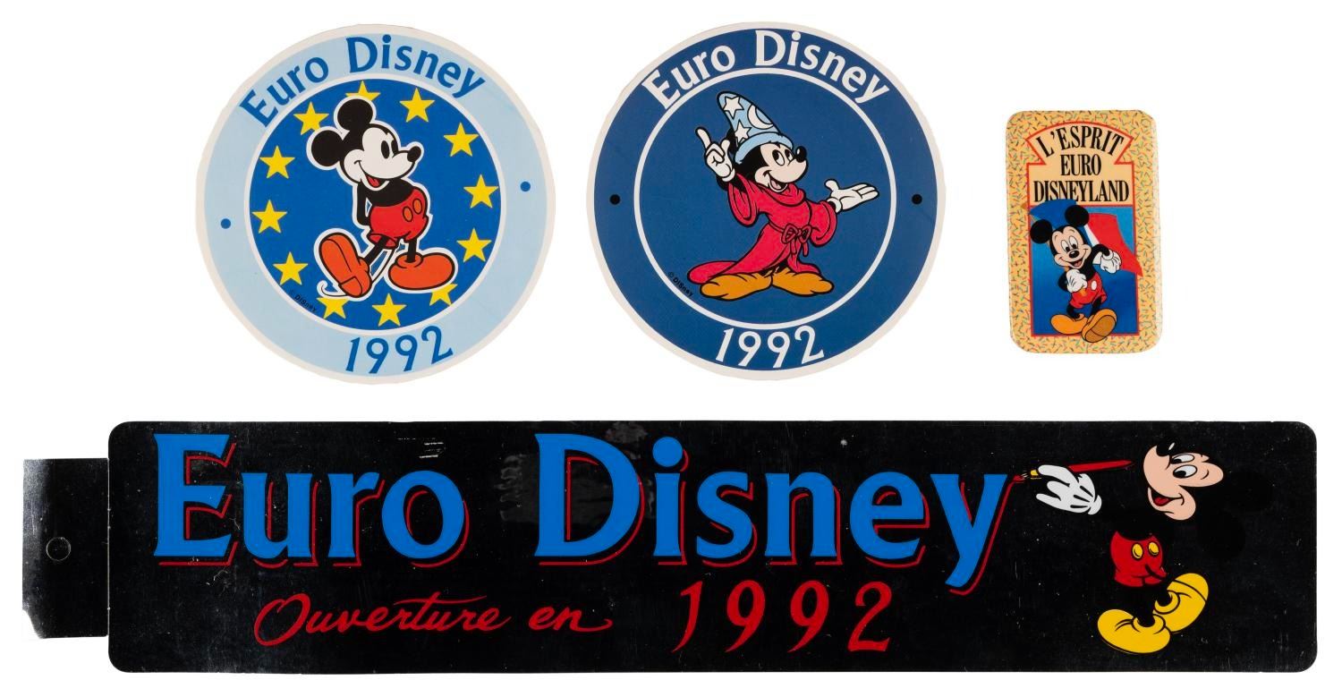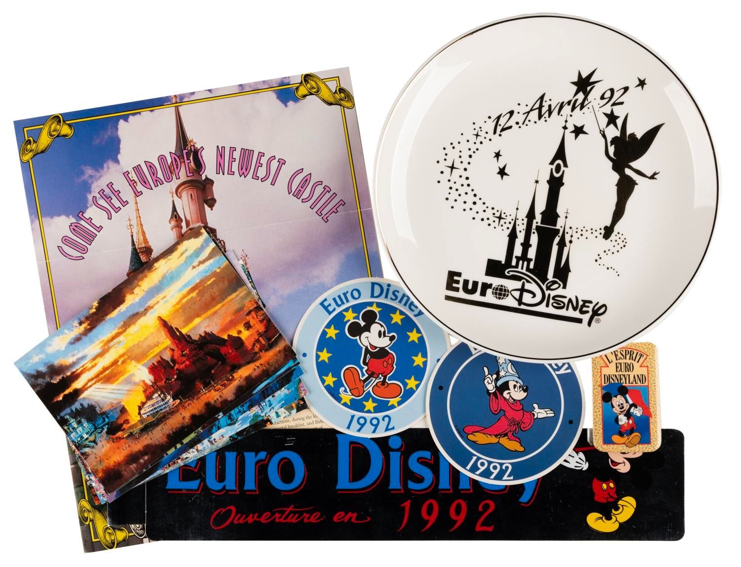(Euro Disneyland, 1992) A collection of early Euro Disneyland souvenirs including a decorative plate, a pinback button, a bumper sticker, a Magic Kingdom Club promotional mailer, a pair of stickers, and five postcards. The button and stickers measure from 1.75" x 2.75" to 4" in diameter, the plate measures 8.5" in diameter, the postcards measure 4" x 6", and the bumper sticker measures 13.5" x 3". The souvenirs are all in very good condition with light wear from handling.