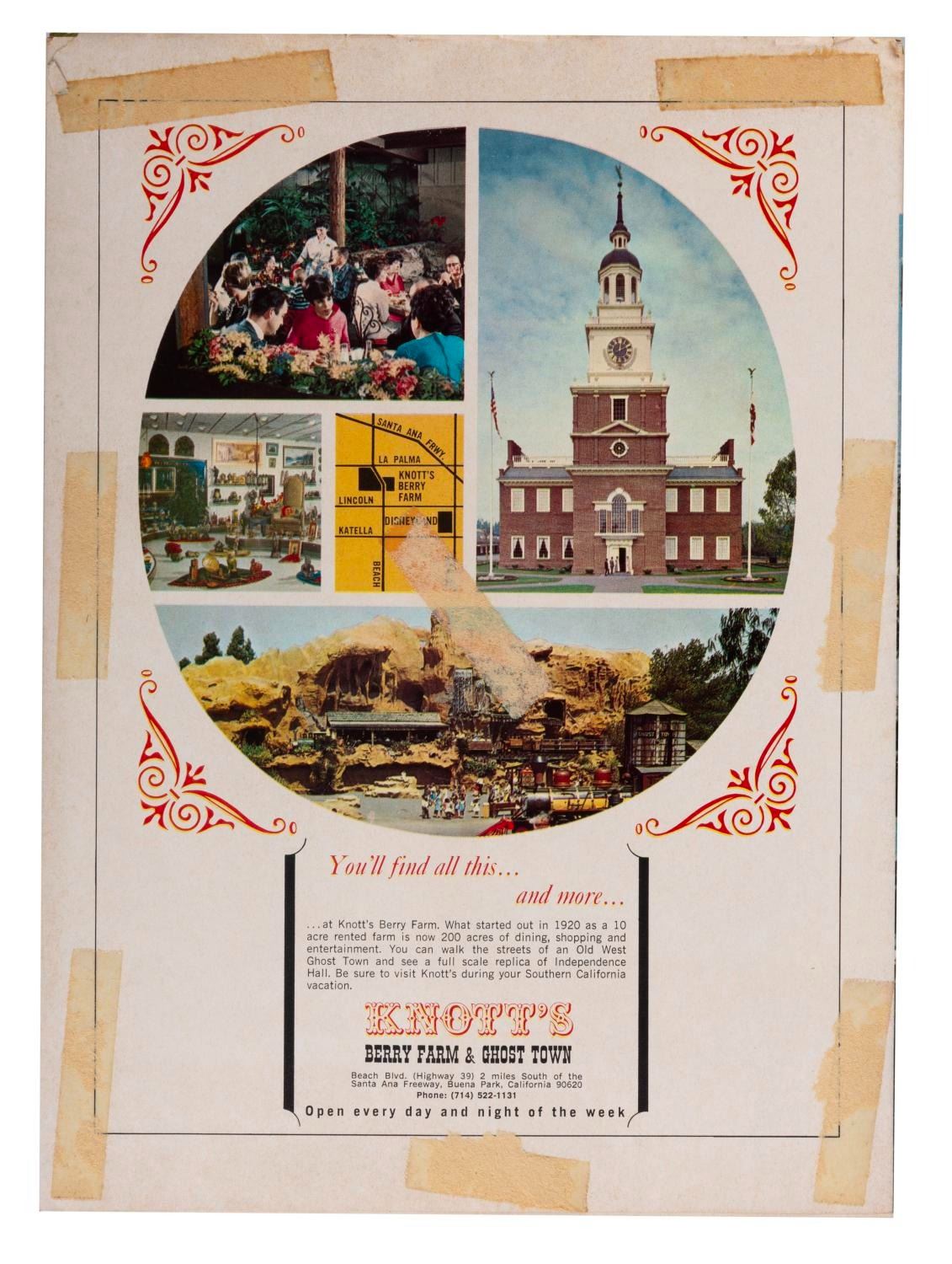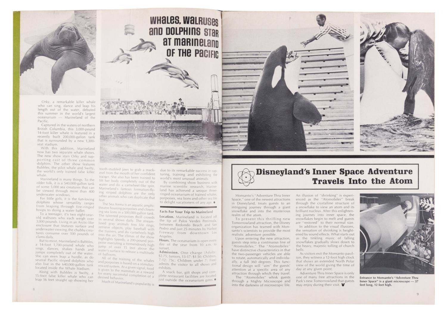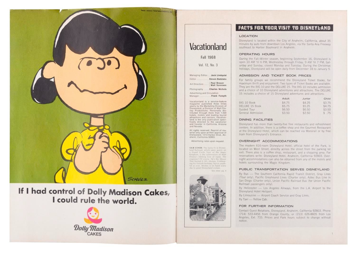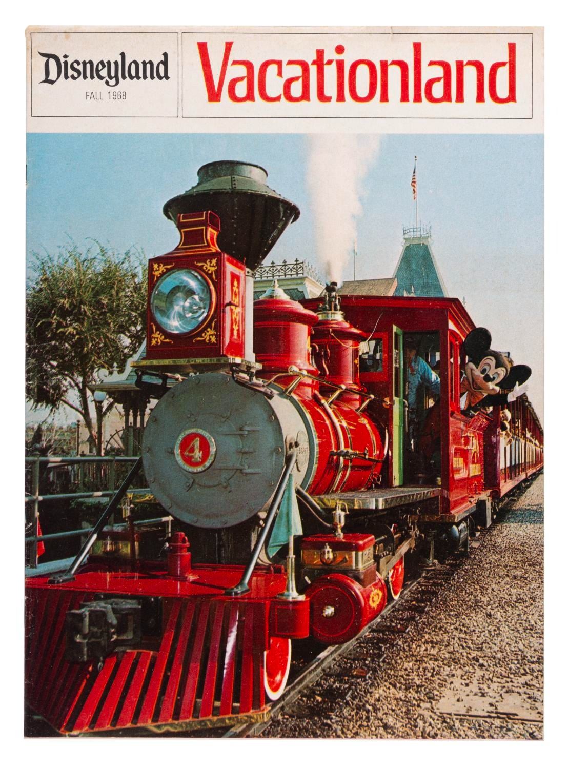 (Disneyland, 1968) A fall 1968 issue of Disneyland's Vacationland magazine with stories on the PeopleMover, Disneyland Railroad, and Park Tour Guides. The magazine is in fair condition with typical handling wear, wear along the top edge, including small tears, and seven strips of tape residue on the back cover.