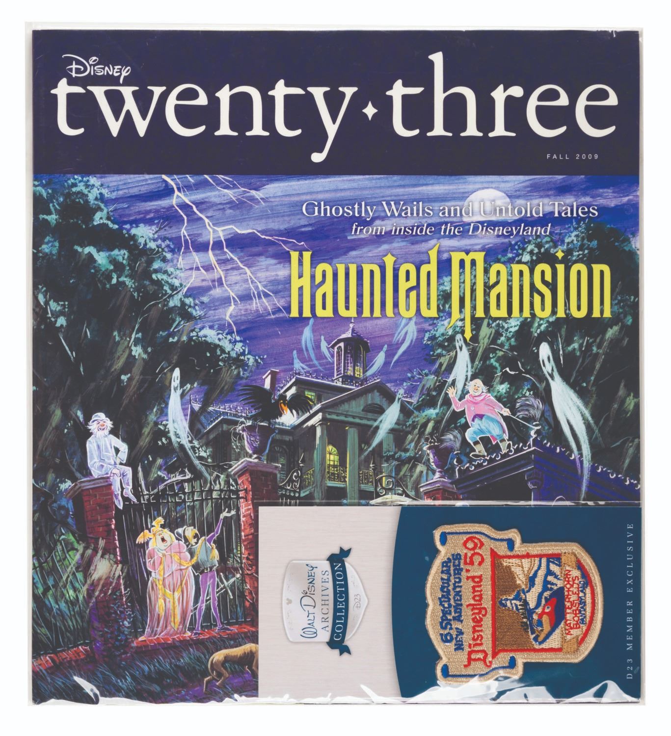 (Disney, 2009) A Fall 2009 D23 magazine and Walt Disney Archives Collection D23 member-exclusive Matterhorn patch. The issue features a glow-in-the-dark cover and articles about the Haunted Mansion, Hall of Presidents, and The Walt Disney Family Museum. Measuring 11” x 12.25” and 3” x 3.25” respectively, the unopened magazine and patch are in fine condition.
