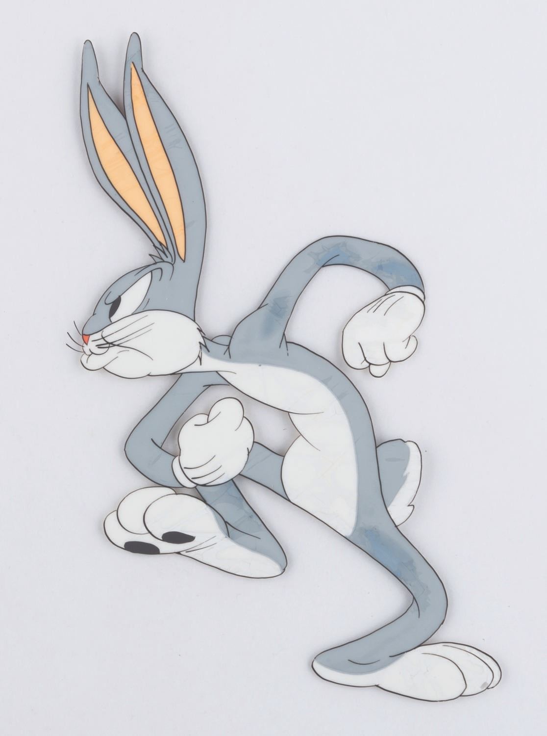 (Schlesinger, 1943) An original production cel of Bugs Bunny from the Merrie Melodies short “Falling Hare.” With a character image size of 6.25” x 4.25” on a 10” x 12.25” cel, the piece is in good condition with paint lifting, a small spot of paint loss to Bug’s left foot, and a 0.5” x 0.75” sticker on the reverse of the lower left corner which does not affect the image.