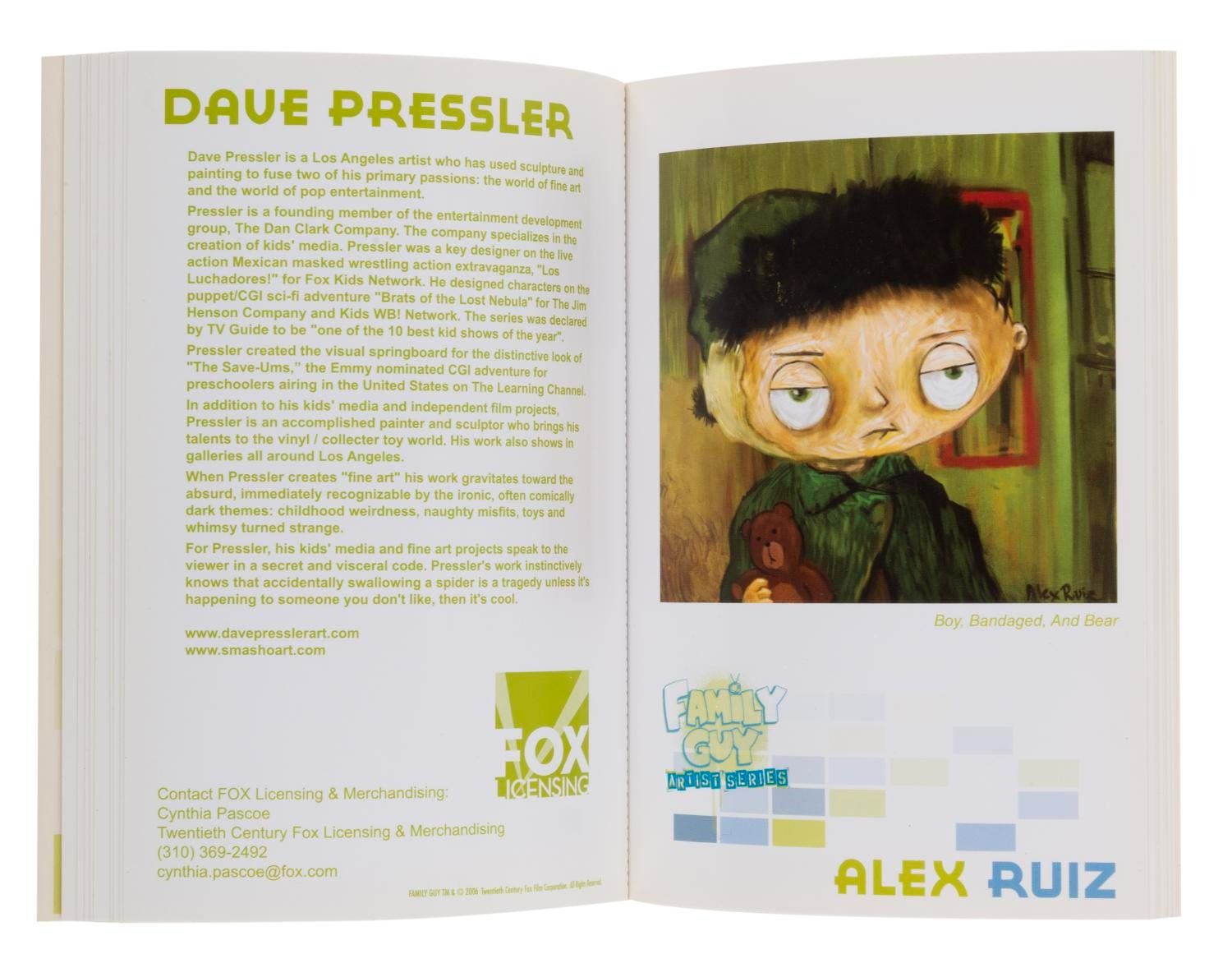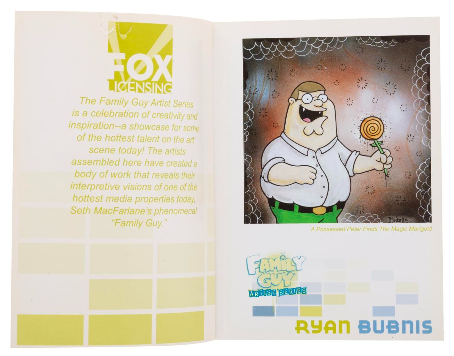 (FOX, 2006) A booklet of 20 postcards of paintings of "Family Guy" characters as interpreted by "Emerging and Established Talent." Measuring 6" x 4.5", the book is in good condition with a 0.75" tear at the top center of the cover, and inside pages in fine condition.
