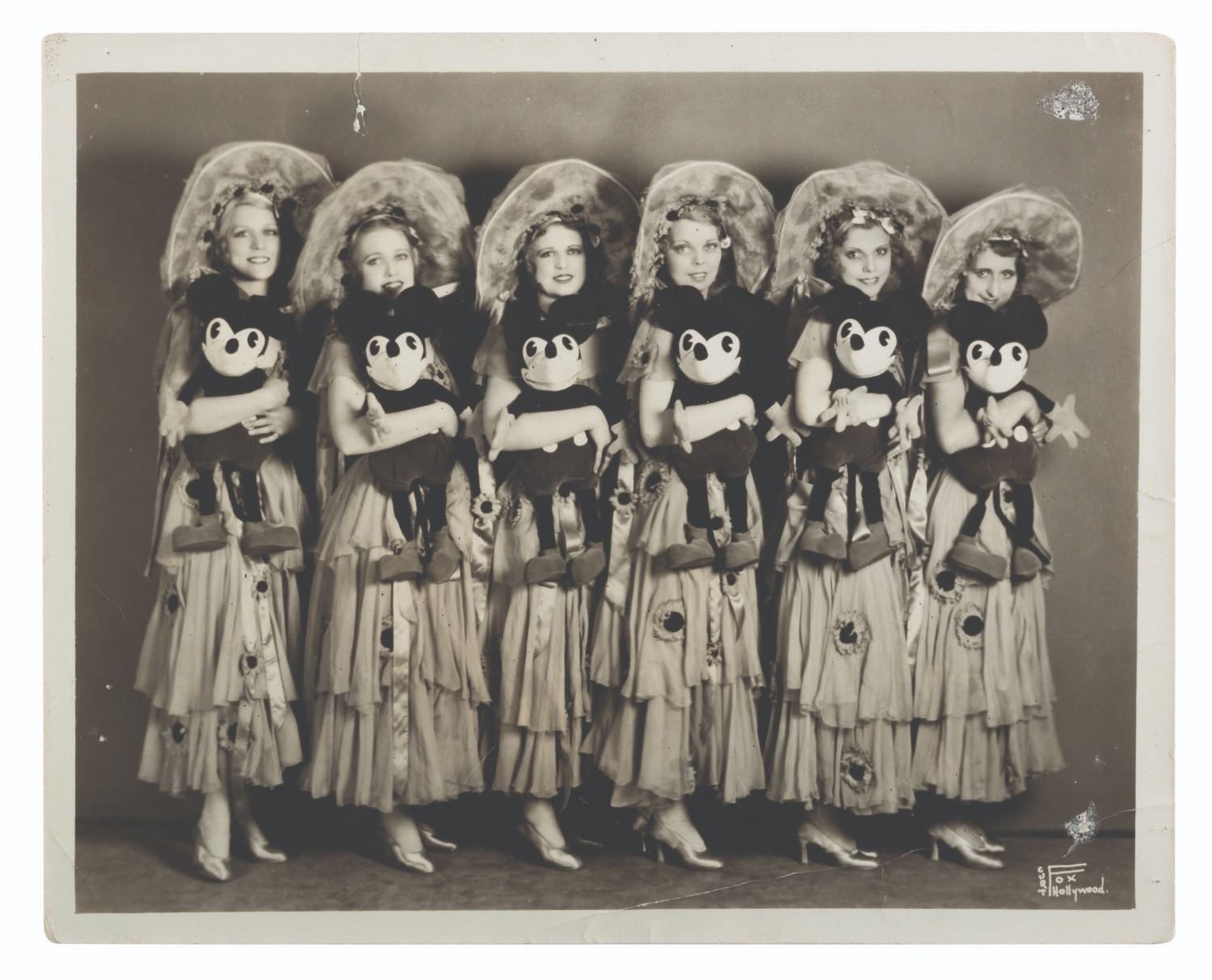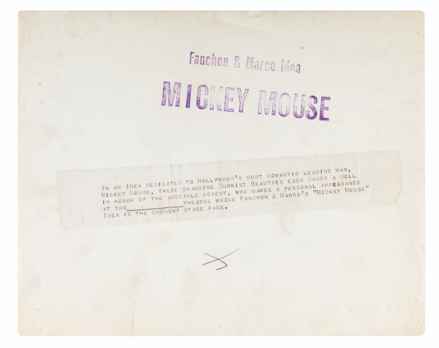 (Fanchon & Marco, 1930s) An extremely rare publicity photo for an early 1930s live stage show produced by Fanchon & Marco. The brother and sister duo produced live stage shows called “ideas” to be performed in movie theatres before the showings or between reels. This photo features their “Mickey Mouse Idea” featuring their Sunkist Beauties each carrying a Mickey Mouse Doll (by Charlotte Clark). The photo was intended for press photos and has the Fanchon & Marco stamp on the reverse and a typewritten suggested caption. Measuring 10” x 8” the photo is in good condition with light yellowing from age, a small 1” tear at the top left center, and light creasing throughout.