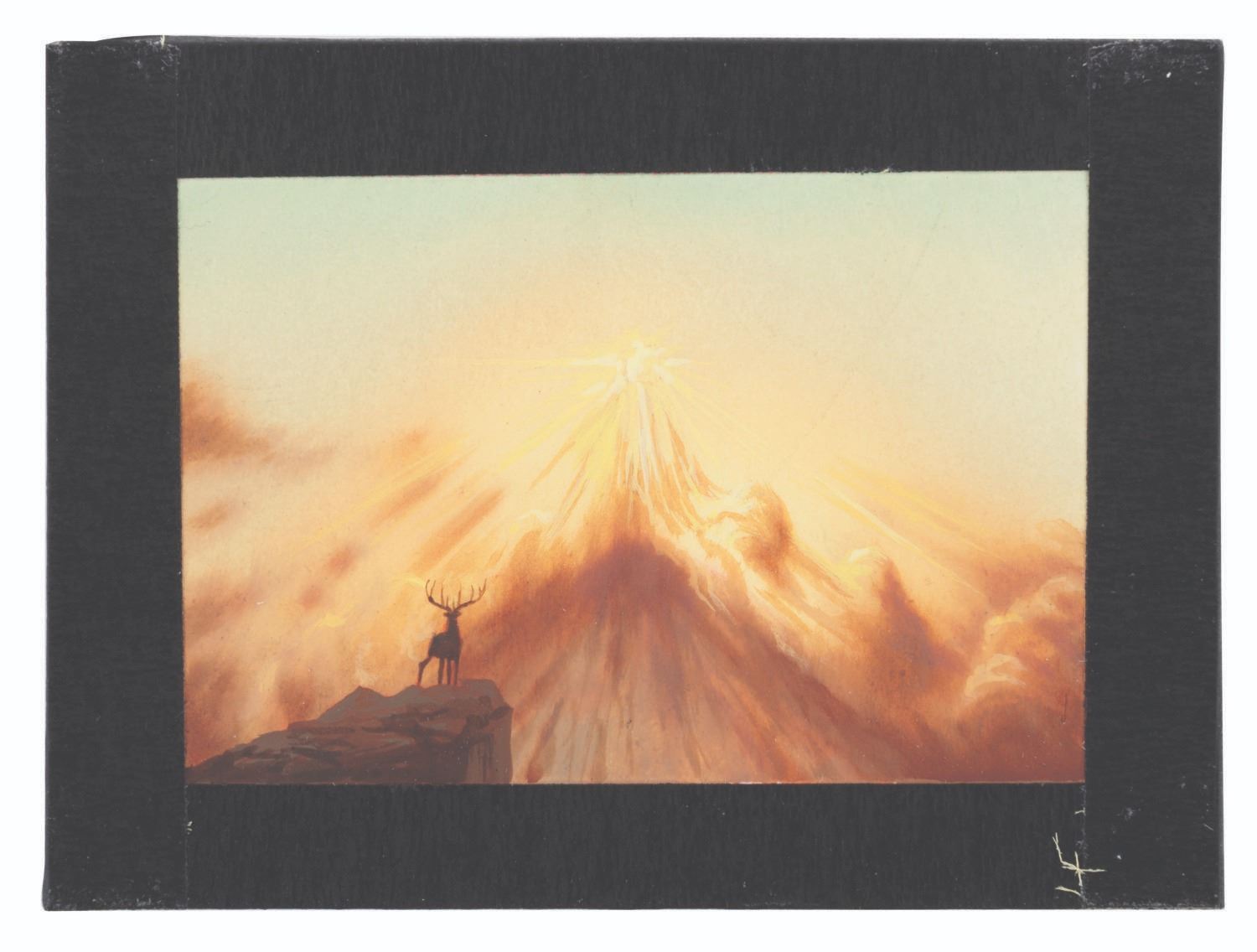 (Disney, 2000) An original color key concept by Emmy Award-winning background artist Christophe Vacher for"Fantasia 2000." This beautiful painting is for the emotional final scene of the film, set to"The Firebird" by Igor Stravinsky. Color keys are preliminary paintings that establish the color palette, style, and feel of the shot. Vacher signed the reverse of the art in ink. With an image size of 2.25" x 3.25" on 3.25" x 4.25" illustration board, the painting is in very good condition with light scratches and wear from production use.