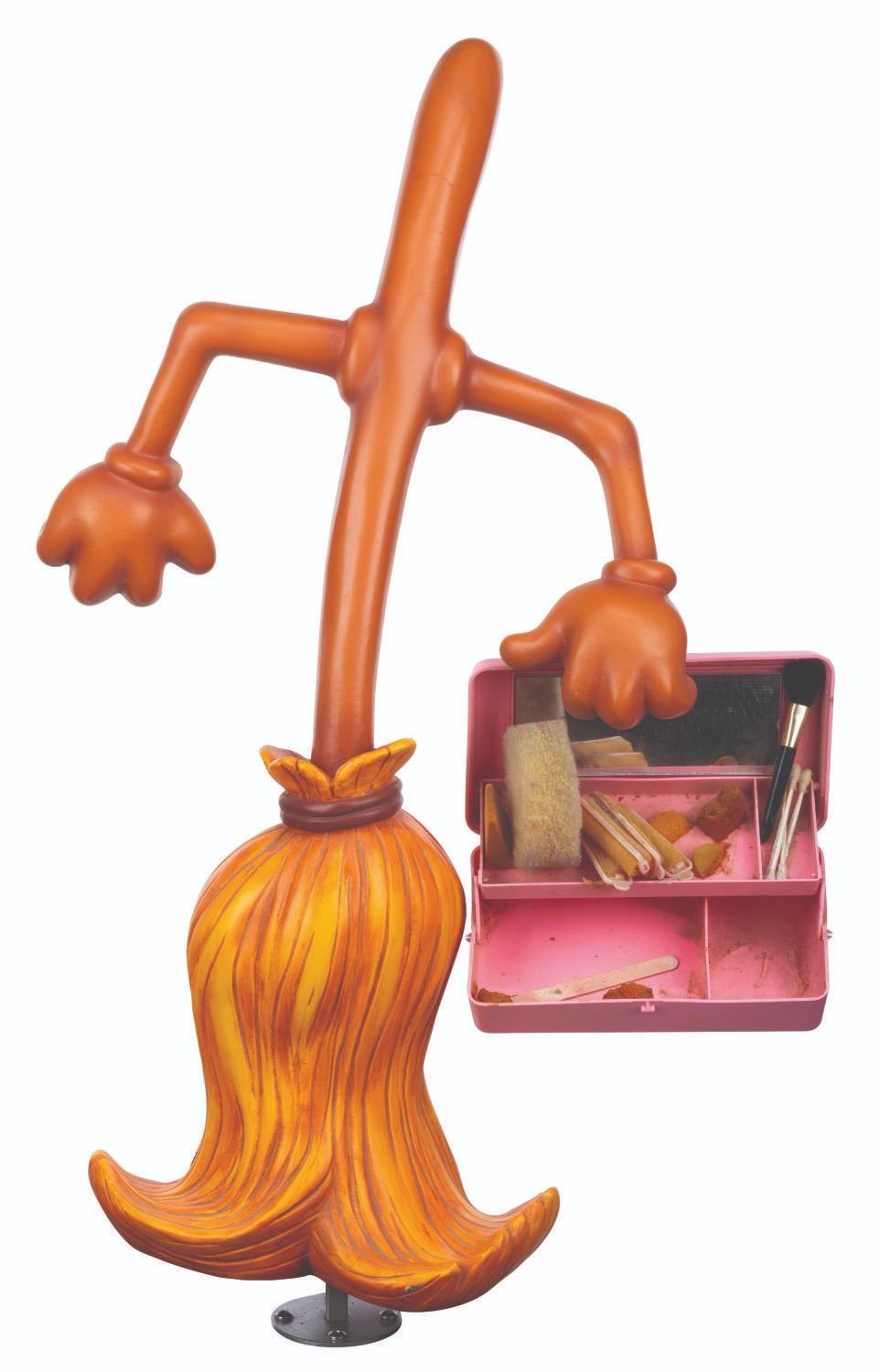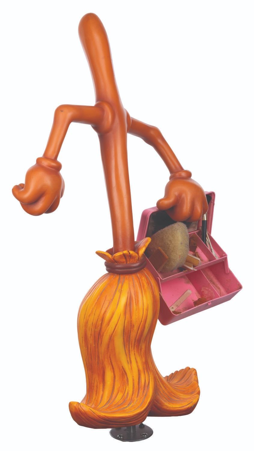 (Disney, 1989) An original Disney Store display figure of an enchanted broom from “The Sorcerer’s Apprentice” holding a makeup kit. Measuring 19” x 29” tall, 30” tall including the metal rod on the bottom, the fiberglass figure displays in very good condition with scuffs, scratches, stains, paint marks, and discoloration from age on the makeup kit sponges. Due to size and weight, this item will require special shipping arrangements. Please inquire before bidding.
