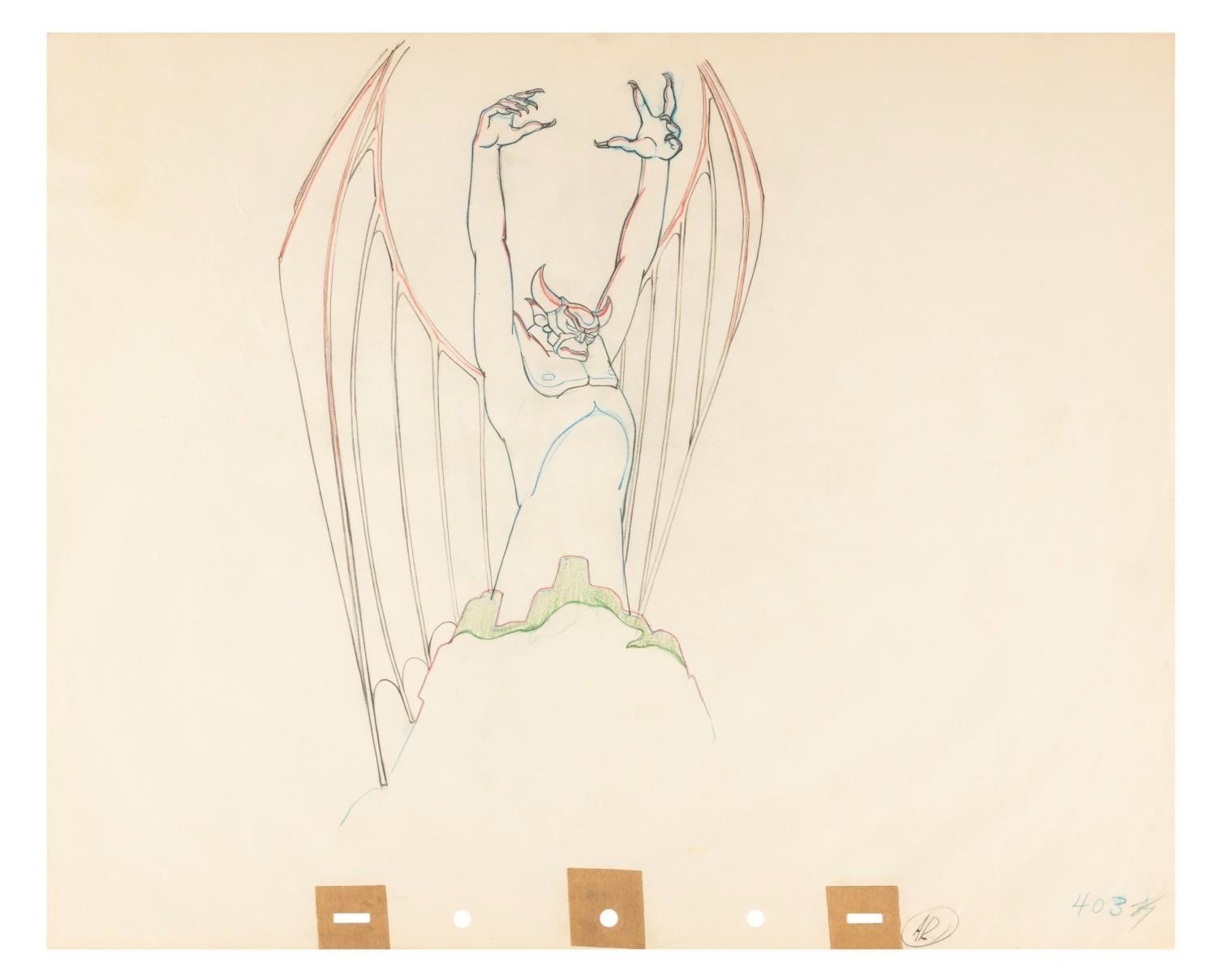 (Disney, 1940) A truly impressive original production drawing in pencils of Chernabog from the Night on Bald Mountain sequence of “Fantasia.” With an image size of 6.75” x 10.75” on 12.5” x 15.5” animation paper, the drawing is in good condition with slight smudging, small creases in the paper, and light wear and color shift to the paper from production use and age.