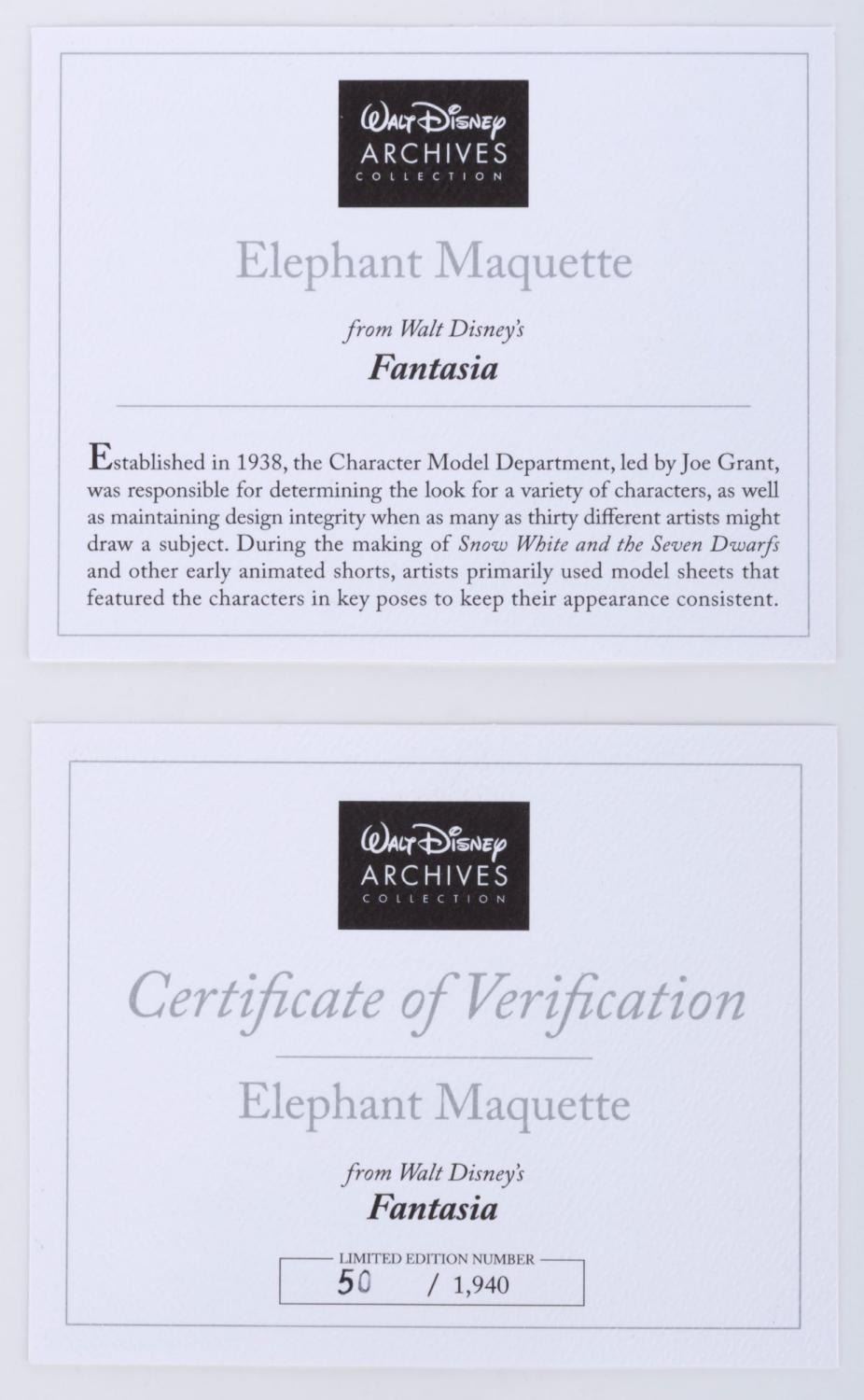 (Enesco, 1990s-2000s) A Walt Disney Archive Collection replica of an animator’s “Fantasia” Elephant maquette manufactured by Enesco. Released in an edition of 3500. Measuring 4" x 5.5" and 10.25" tall, the figurine is in fine condition and comes with the original 5.75" x 7.5" x 12" box and COA.