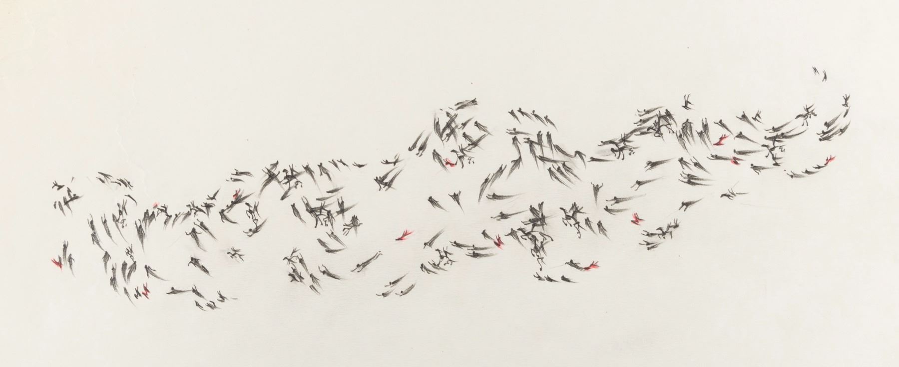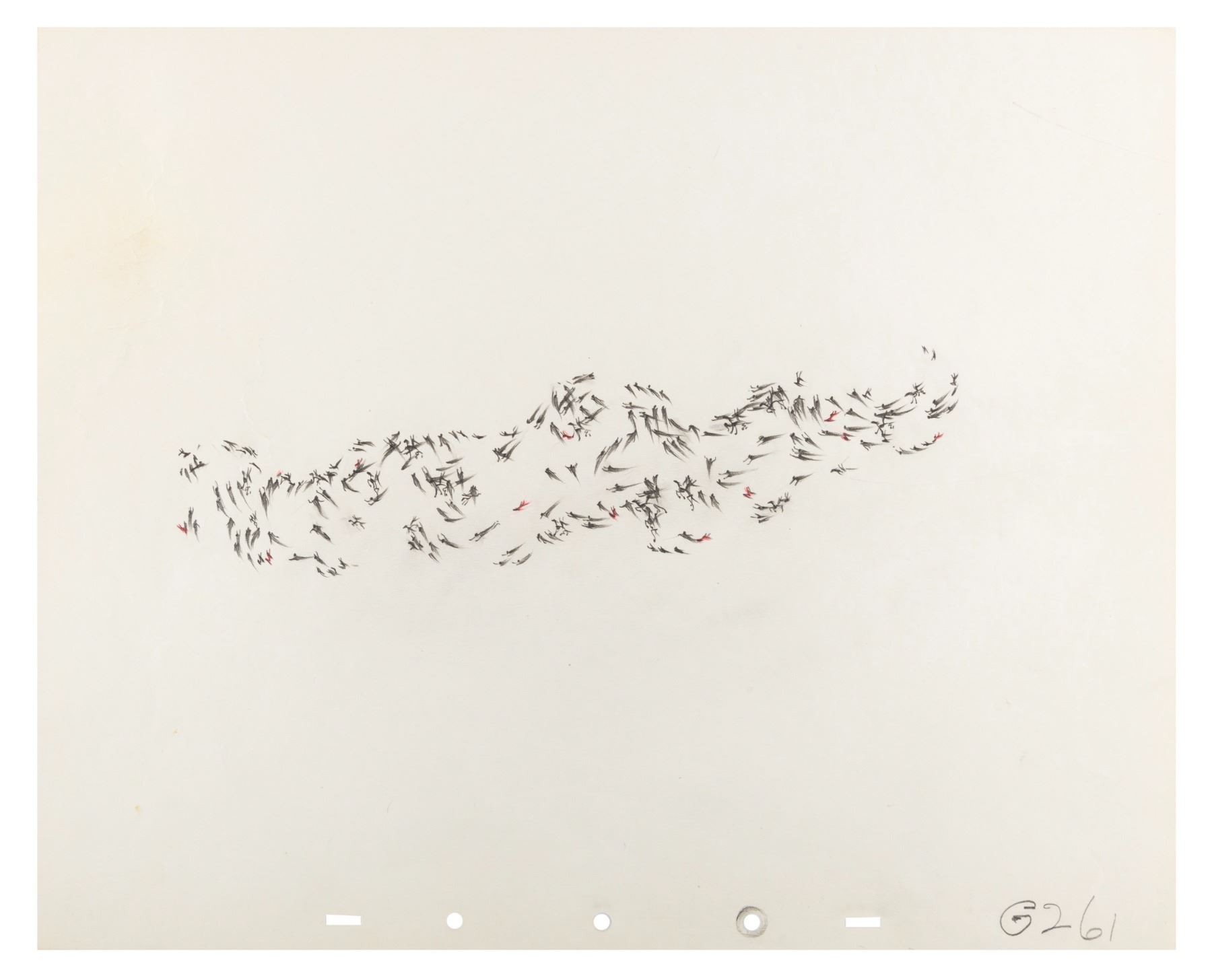 (Disney, 1940) An original production drawing in pencils of swarming ghosts from the Night on Bald Mountain sequence of “Fantasia.” With an image size of 2.75” x 10.75” on 12.5” x 15.5” animation paper, the drawing is in good condition with light smudging, small creases, light wear from production use, and typical color shift to the paper from age.