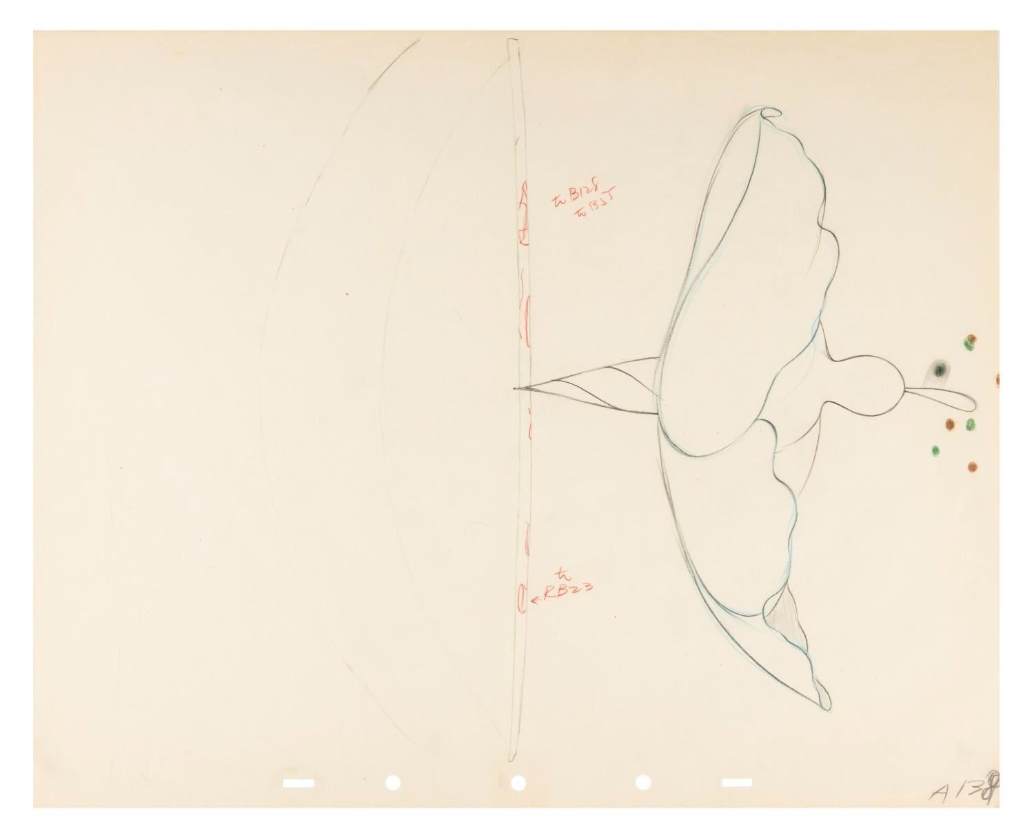 (Disney, 1940) An original production drawing in pencils from the Nutcracker Suite sequence of “Fantasia.” With an image size of 12” x 7.5” on 12.5” x 15.5” animation paper, the drawing is in very good condition with light wear and color shift to the paper from production use and age.