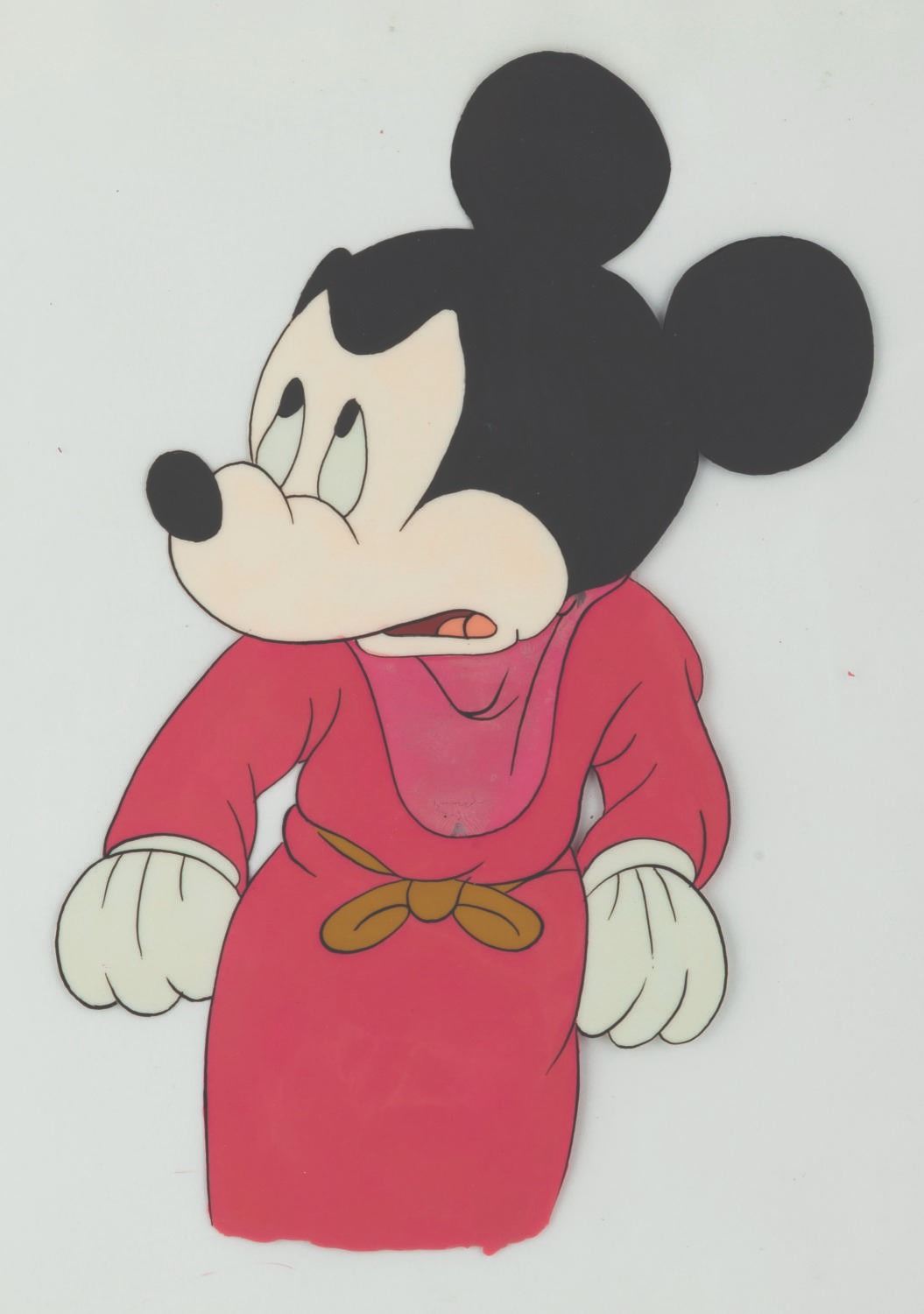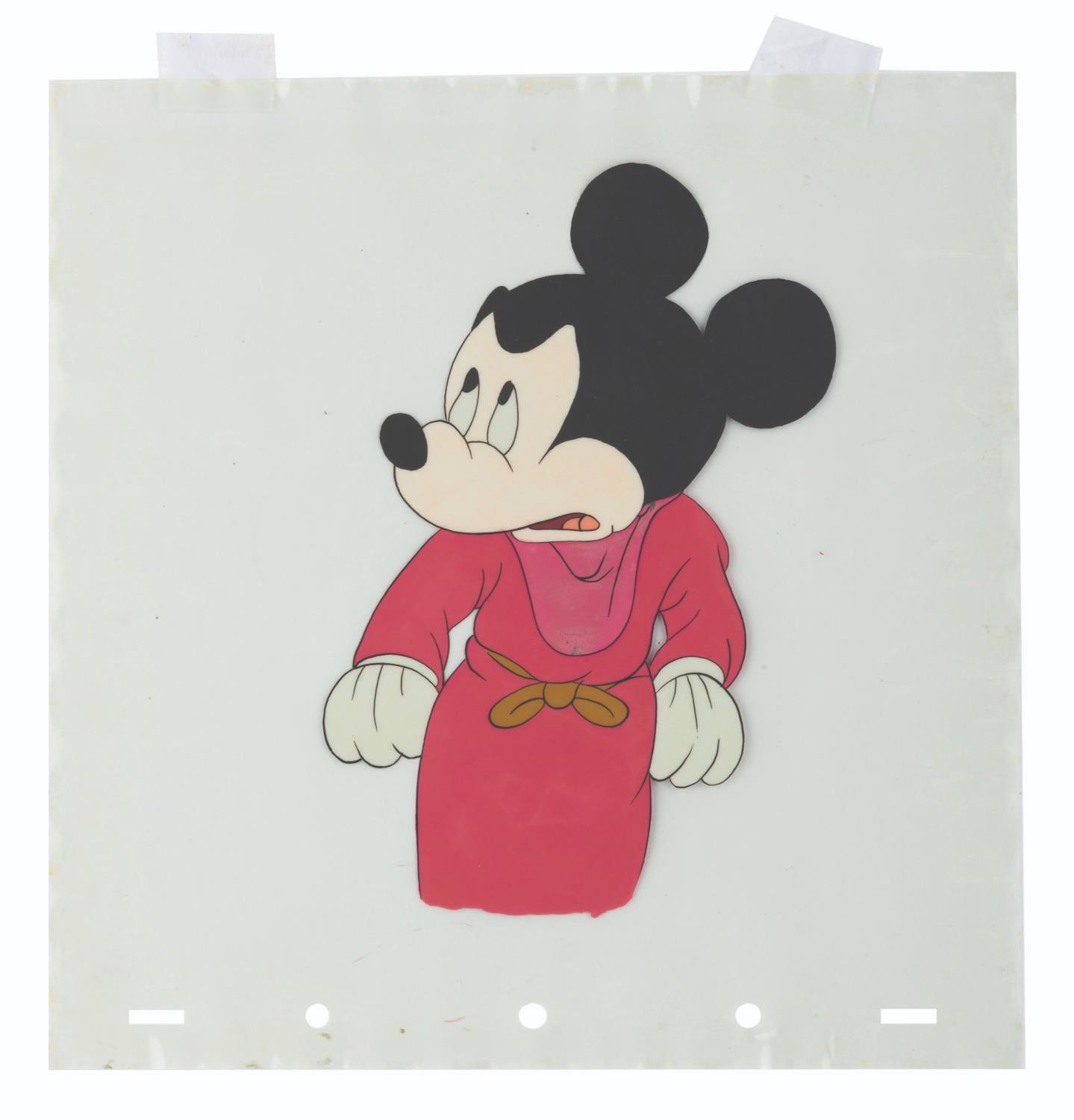 (Disney, 1940) An original model cel of Mickey Mouse from the"Sorcerer’s Apprentice" sequence of"Fantasia." Mickey has an image size of 4.75" x 7" on a 9.25" x 9.25" trimmed cel. The piece displays in very good condition with scratches, rippling, and spots of paint loss, notably on the stomach and shoulder.