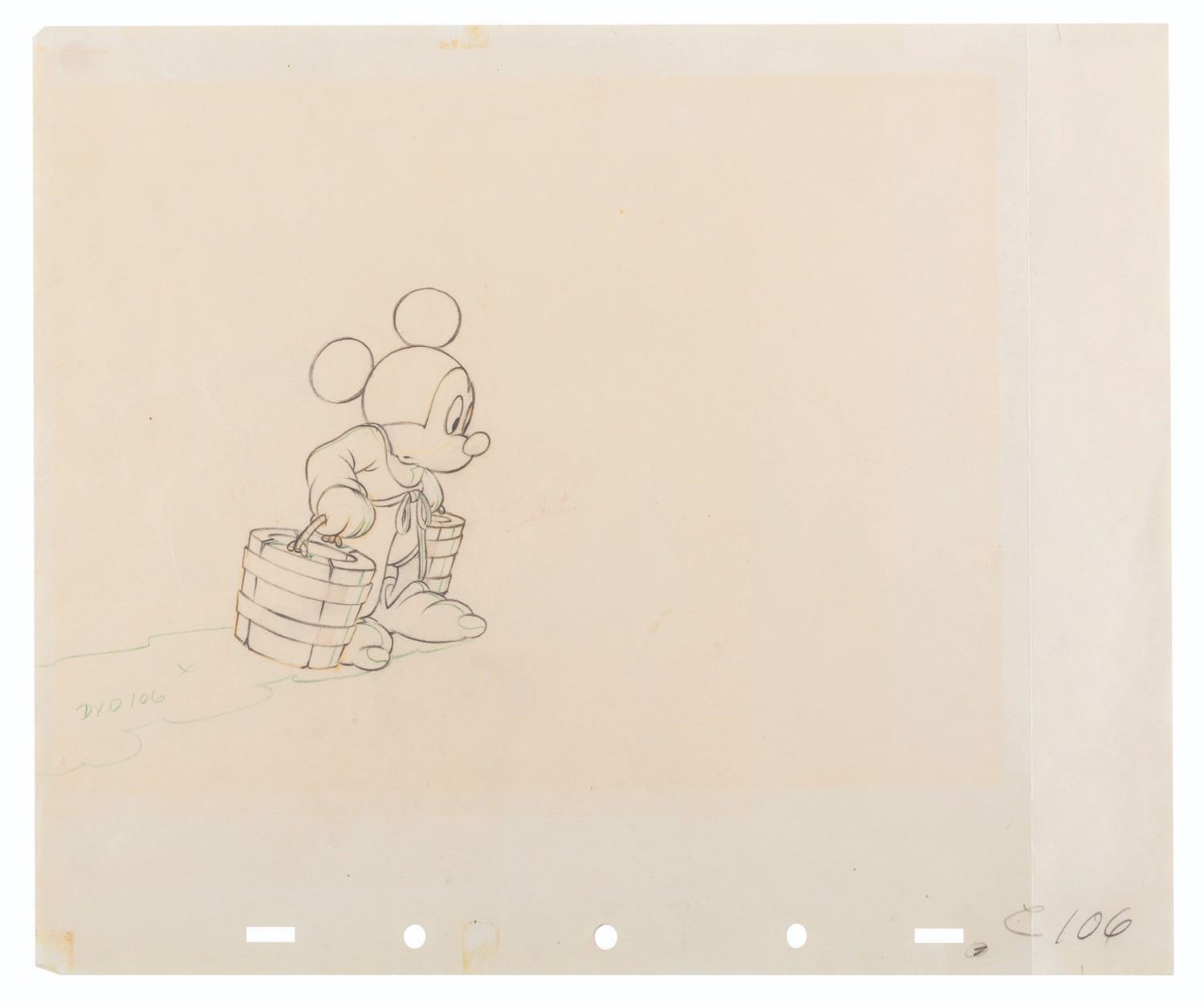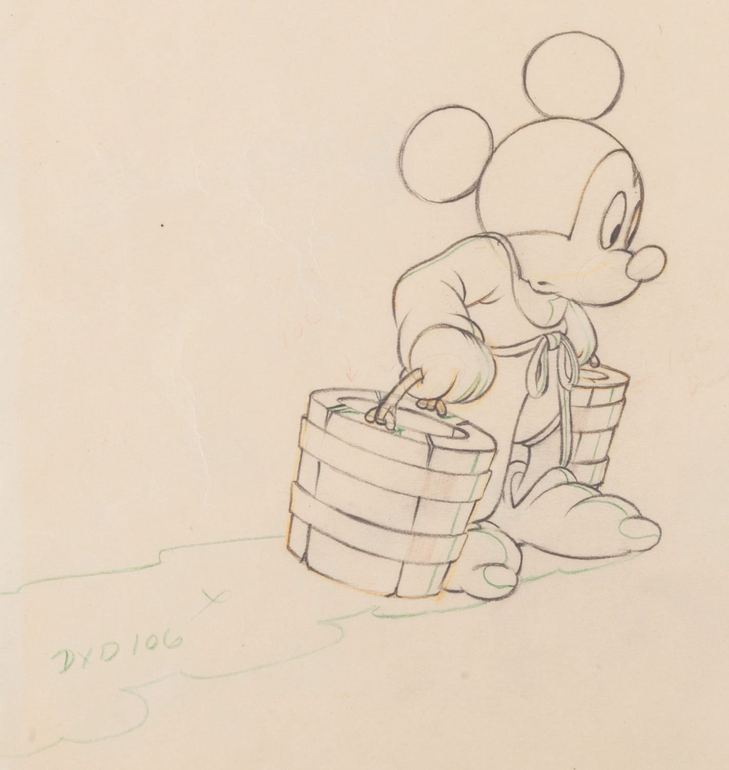 (Disney, 1940) An original production drawing of Mickey Mouse from The Sorcerer's Apprentice sequence of "Fantasia." Mickey has an image size of 2.75" x 4" on 10" x 12" animation paper. The graphite and colored pencil drawing displays in very good condition with creases, tape residue, edge wear, discoloration from previous framing, graphite inscriptions on the reverse, and a full vertical fold on the right side, which does not affect the image.