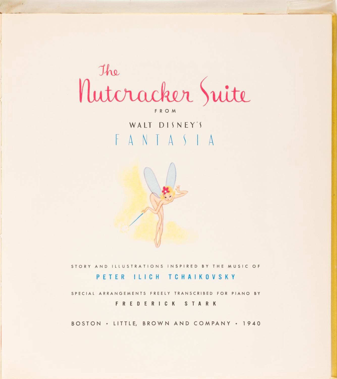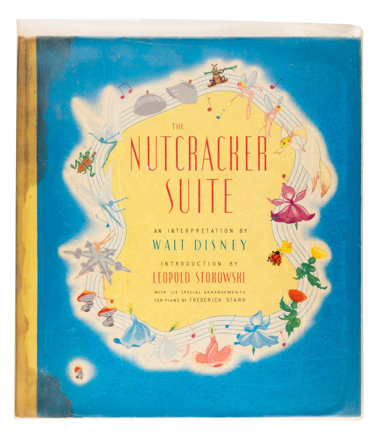 (Little, Brown and Company, 1940) A hardcover The Nutcracker Suite, a book interpretation of the sequence by the same name from Walt Disney's "Fantasia." The book features drawings from the sequence's visual development and sheet music for "The Nutcracker Suite" with 6 piano arrangements by Frederick Stark. Measuring 10.5" x 11.5", the book is in fair to good condition, with heavy wear, stains and smudges on the front and back cover, discoloration, light edge wear to the pages, and a plastic clear protective jacket with heavy wear from age.