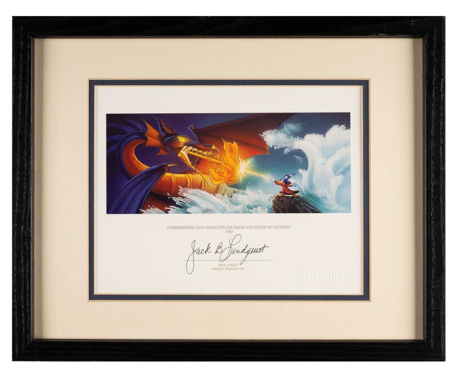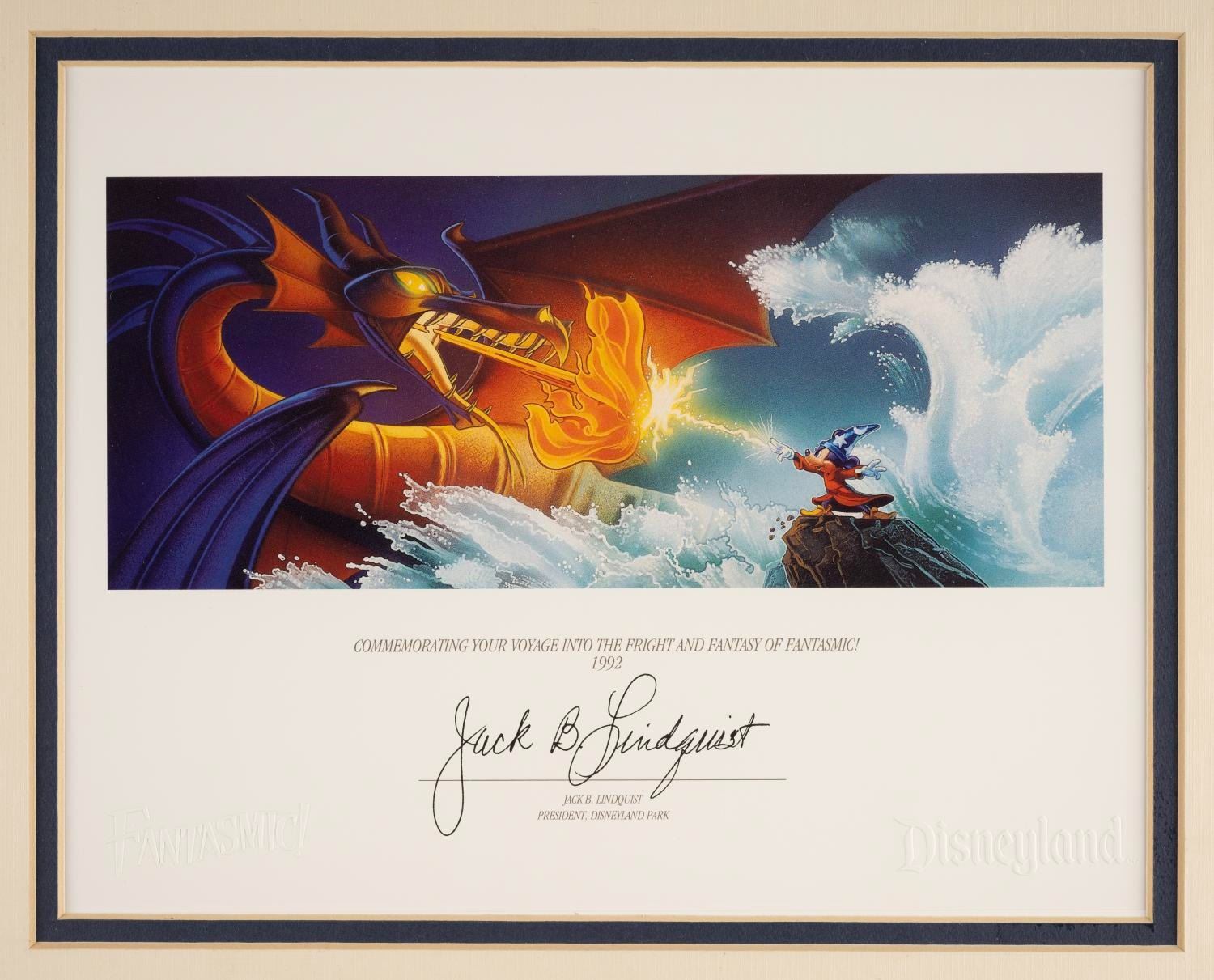 (Disneyland, 1992) A Fantasmic! commemorative certificate from the opening year of the nighttime spectacular. This piece has 9.5"x7.5" of its surface visible within a mat and 15"x12.25" frame and displays a fine condition with no visible wear.