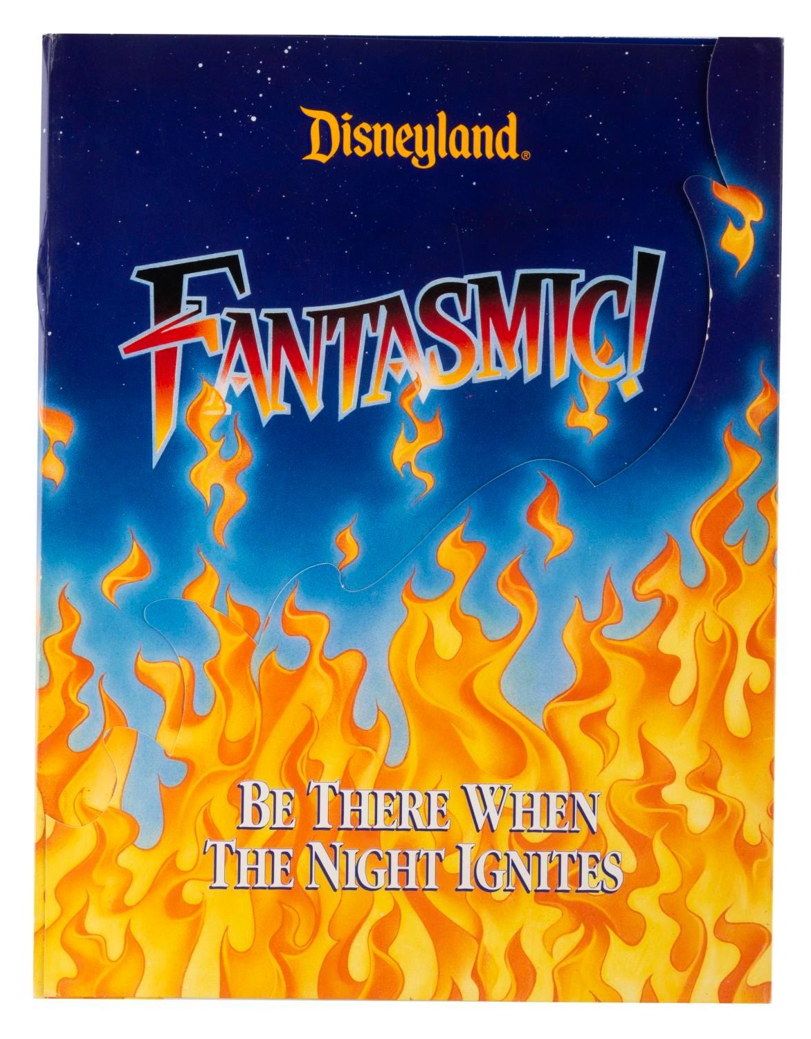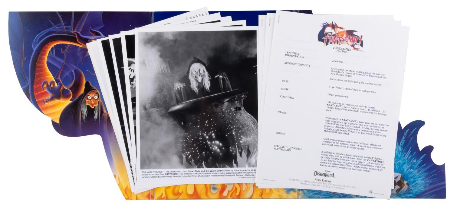 (Disneyland, 1992) A press kit for the nighttime spectacular Fantasmic! Included are five black and white glossy photos, two press releases, and a fact sheet. Ranging in size from the 8” x 10” photos to the 8.5” x 11” releases, the items are in very good to fine condition. The 9” x 12” branded folder is in good condition with creases and light wear.