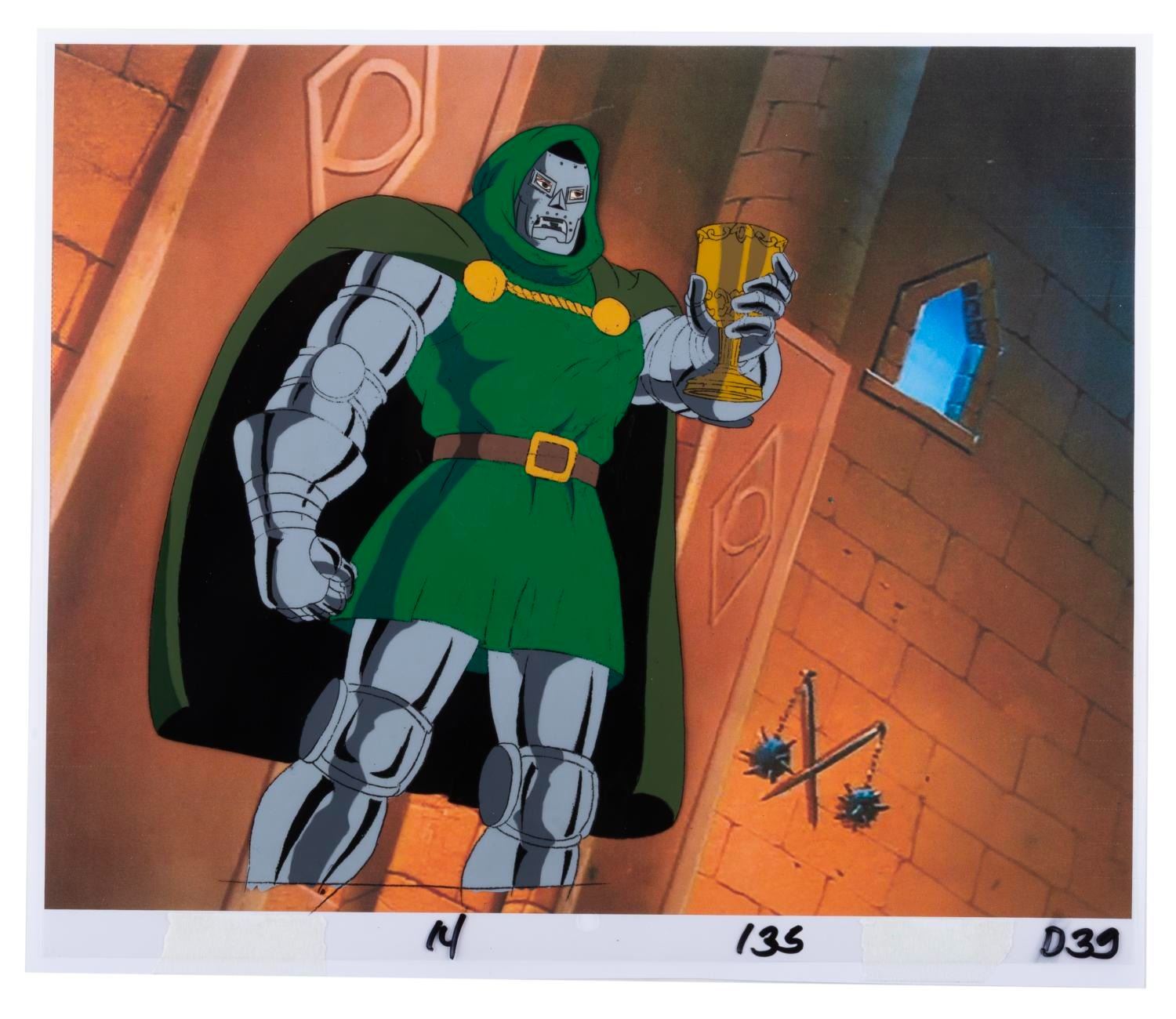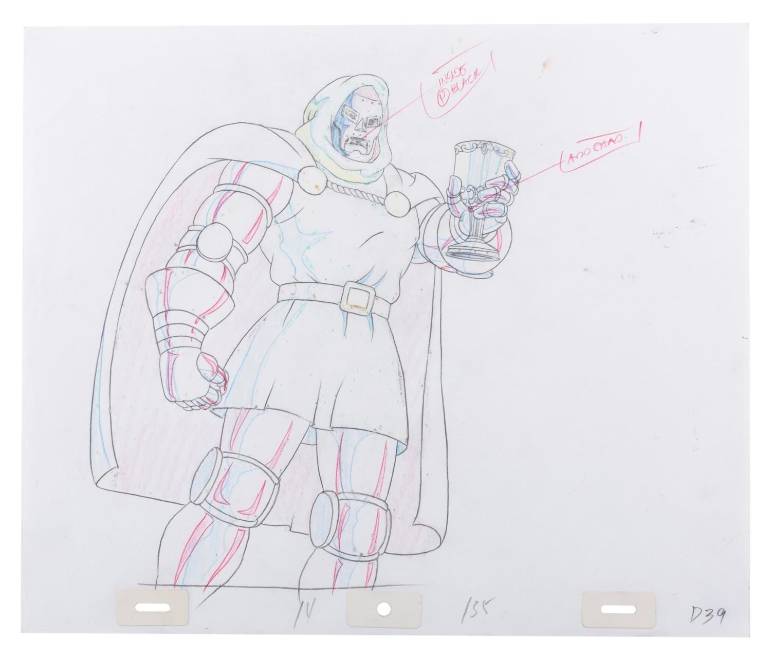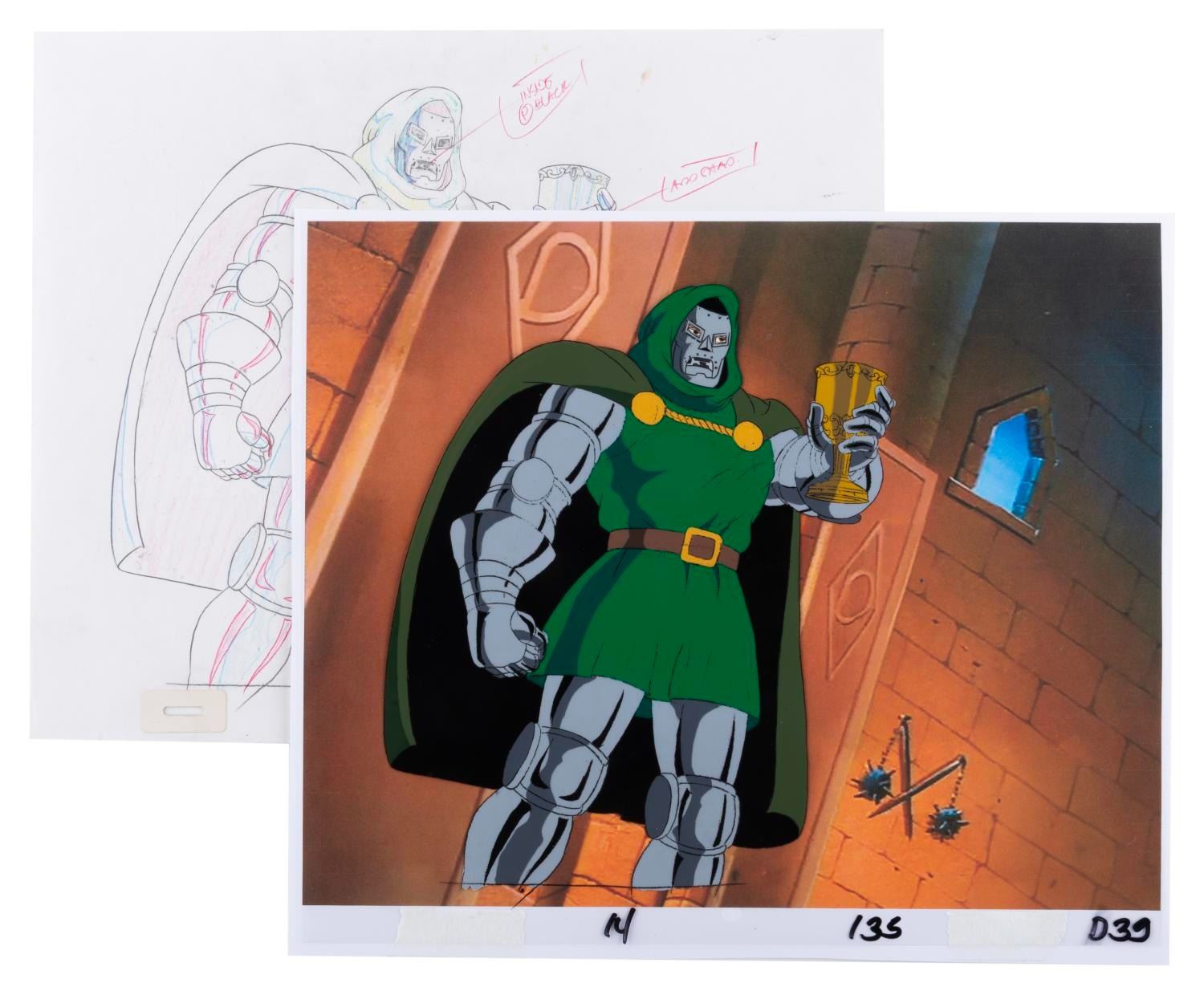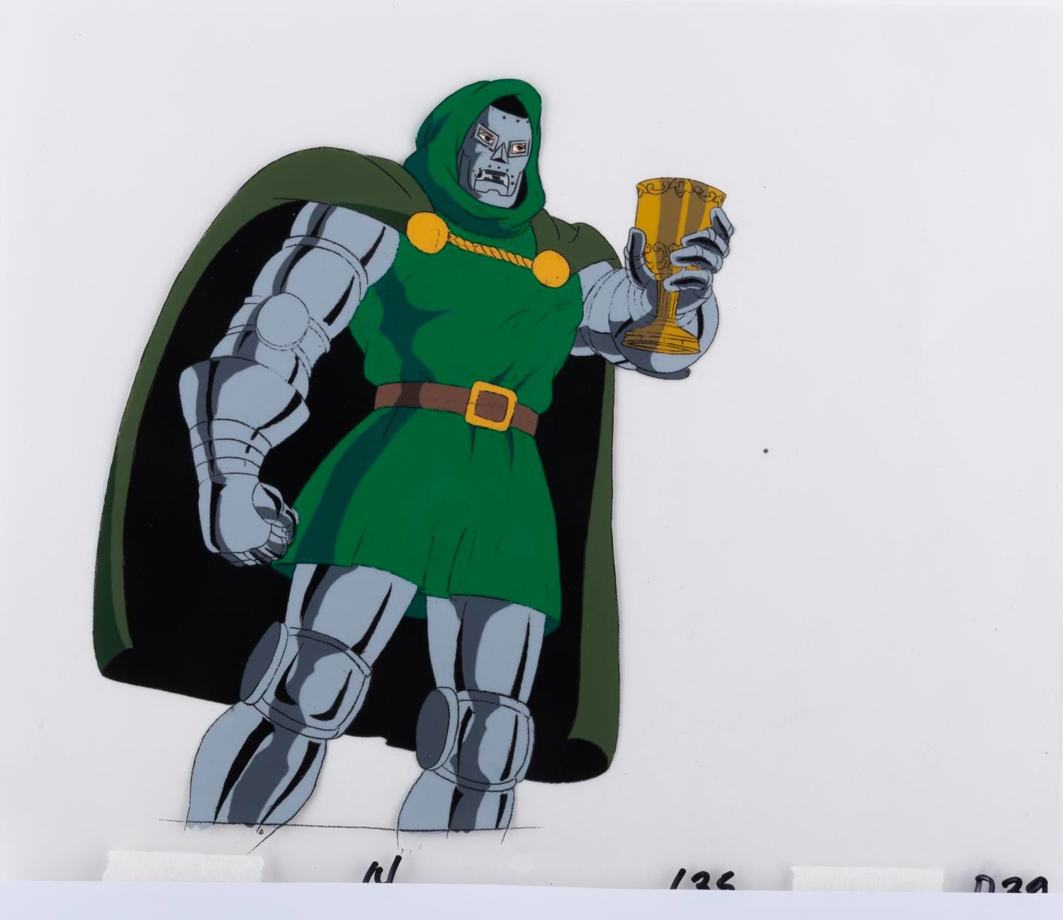 (Marvel, 1995) An original production cel and drawing of Doctor Doom from the "Fantastic Four " episode "And a Blind Man Shall Lead Them, " with a color copy background. Doctor Doom has an image size of 7.25 " x 9 " on a 10.5 " x 12.5 " cel and animation paper. The cel and drawing are in good condition with line loss, scratches, and wear from production use.