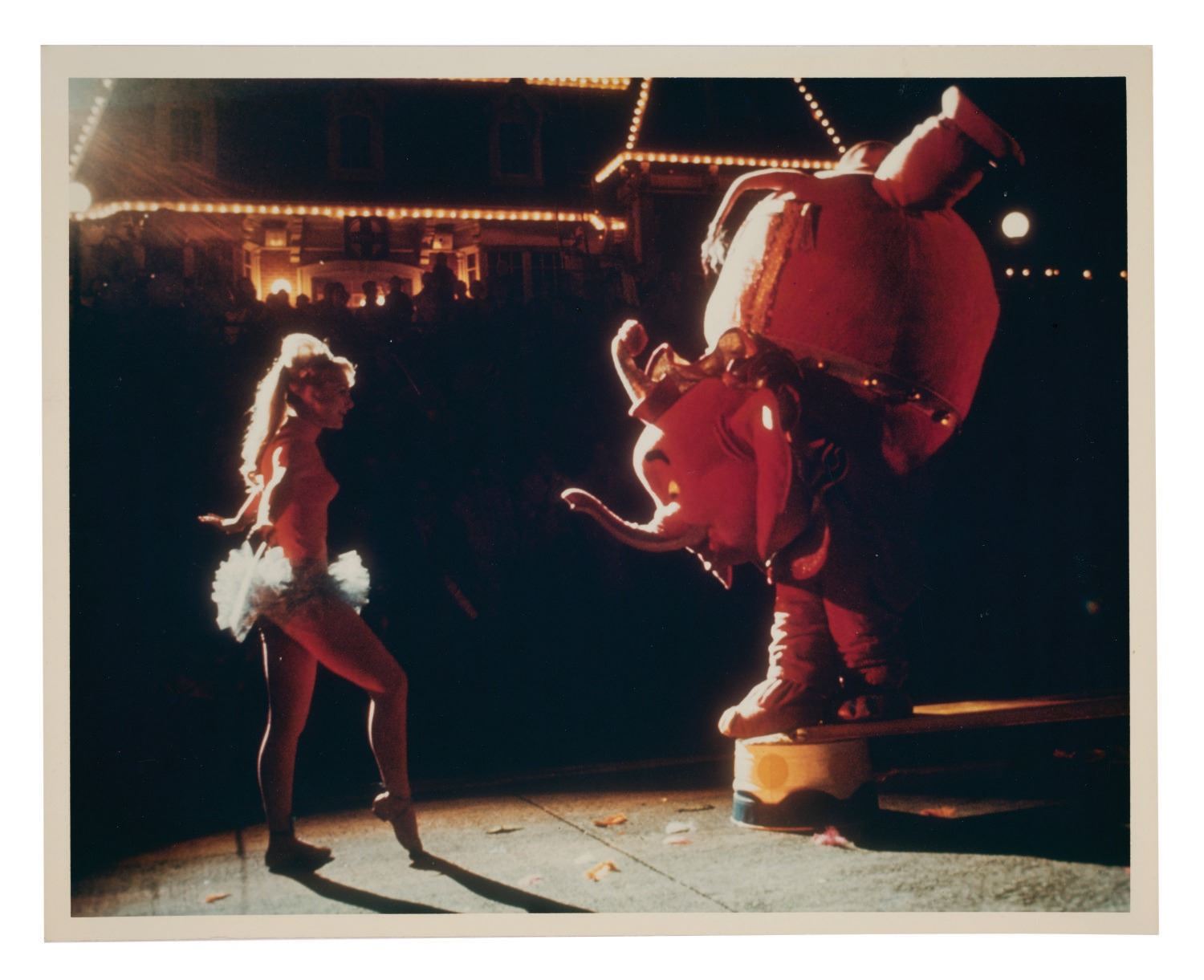 (Disneyland, 1960s) A colorful publicity photo of the Circus Elephants featured in a unit of Fantasy on Parade at Disneyland. The photo retains an original Walt Disney Productions stamp on reverse. Measuring 8"x10", the photo displays in very good condition, exhibiting only the slightest yellowing from age and minor wear to edges.
