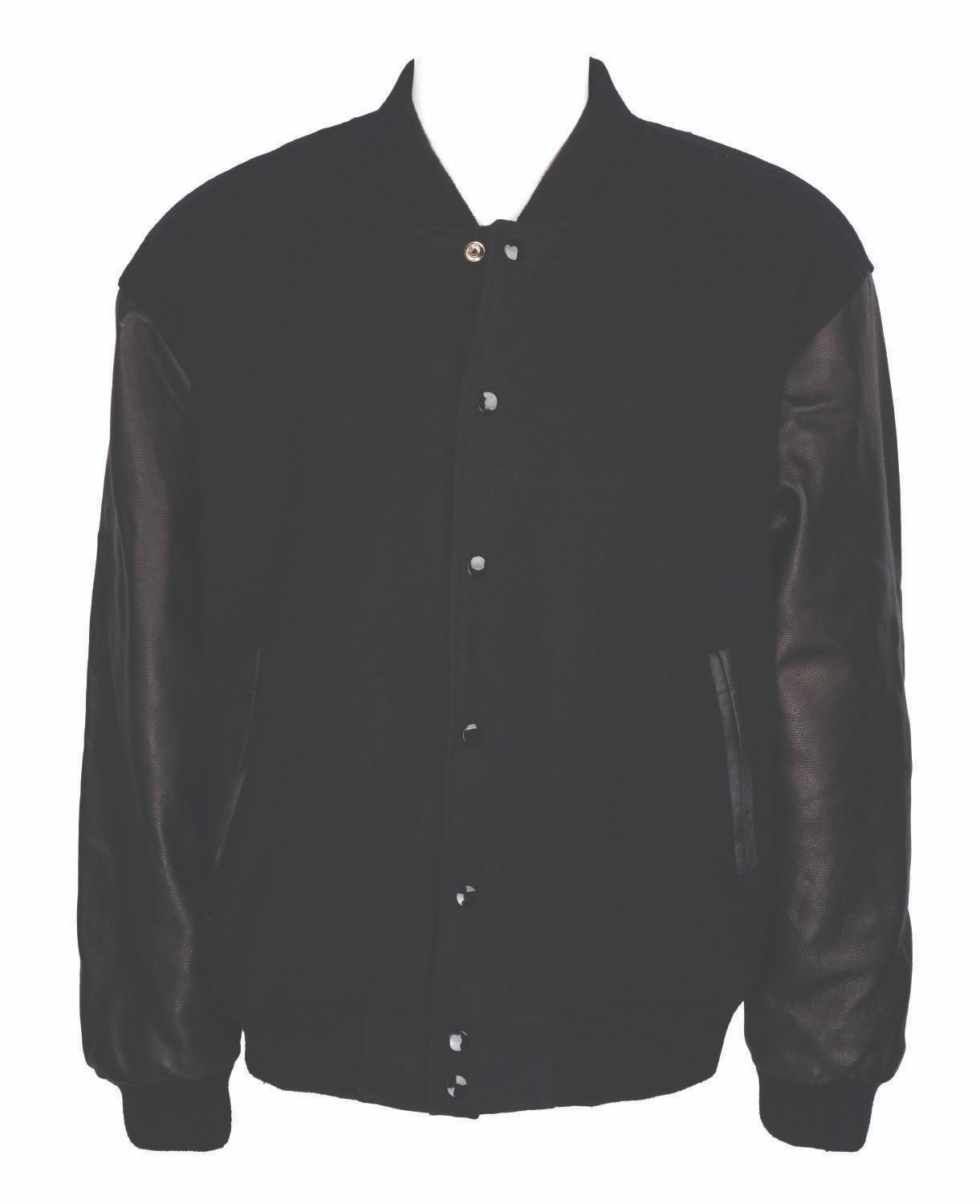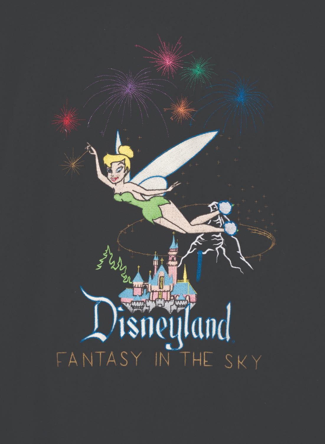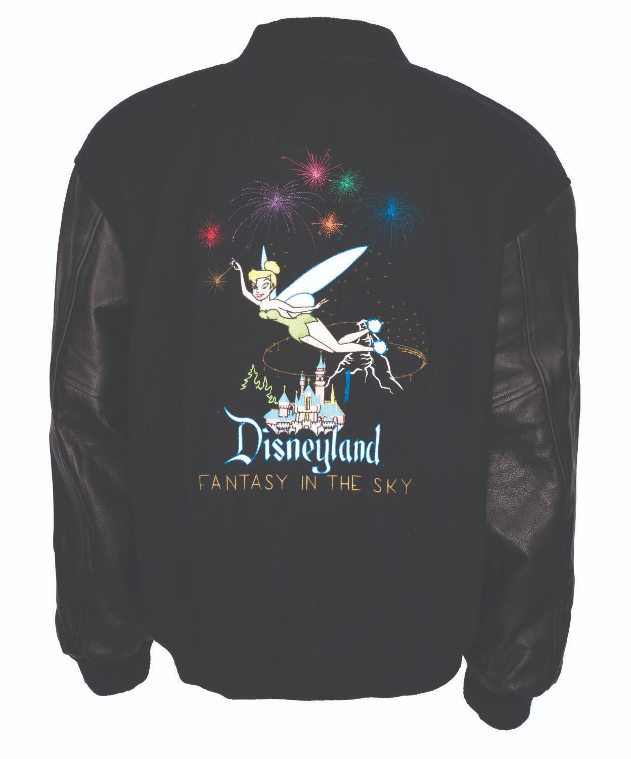 (Disneyland, 1990s-2000s) An extremely rare black varsity jacket created for Disneyland Entertainment Pyrotechnicians who helped create the nightly Fantasy in the Sky display. The jacket has leather sleeves and pocket reinforcements and is accented by a shimmering embroidered image of Tinker Bell sprinkling pixie dust over Sleeping Beauty Castle and the "Fantasy in the Sky" show title. Measuring a size "XL," this garment is in very good condition with minor pilling to parts of the knitted trim.