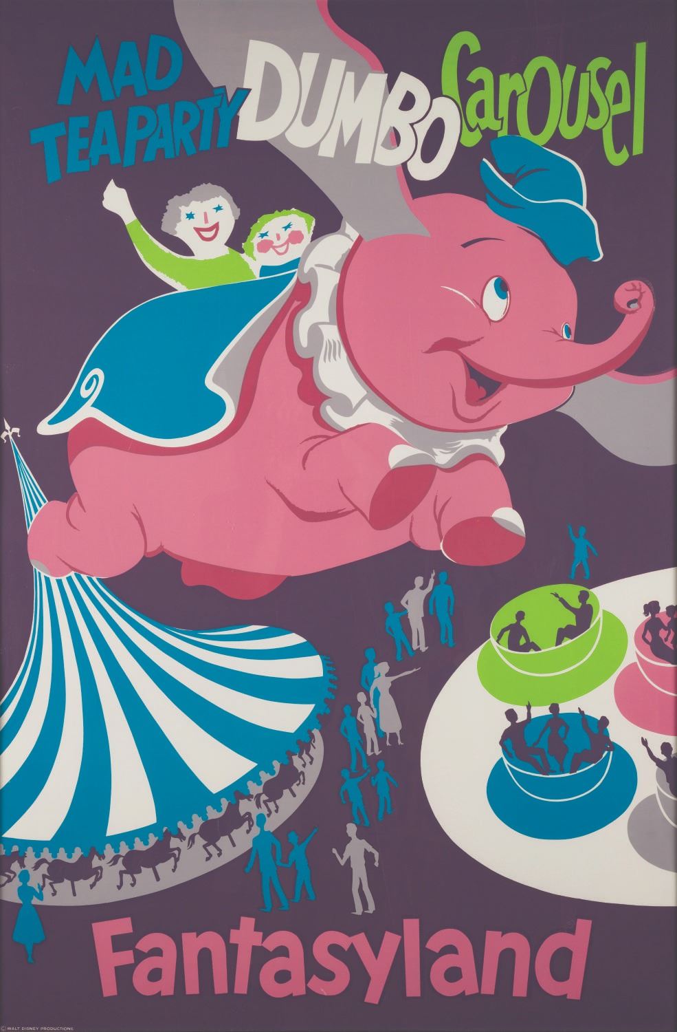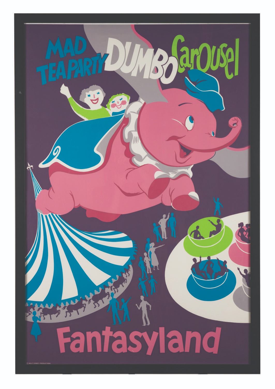 (Disneyland, 1956) An original hand silk-screened poster for the Mad Tea Party, King Arthur Carousel, and Dumbo in Fantasyland at Disneyland. Designed by Bjorn Aronson, the iconic poster was one of the first to decorate the Park. Measuring 36" x 54" the poster is in very good condition, linen-backed for preservation, with very slight spotting of pink around the trunk and text from the original production process, and light wear including a few small scuffs and vertical creases mainly in the lower half.